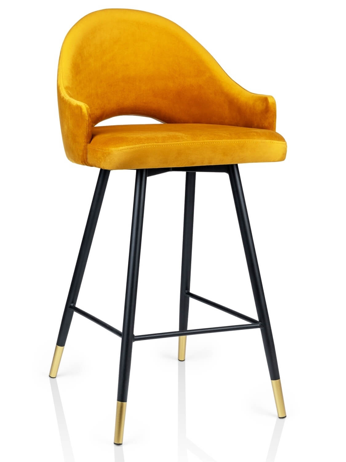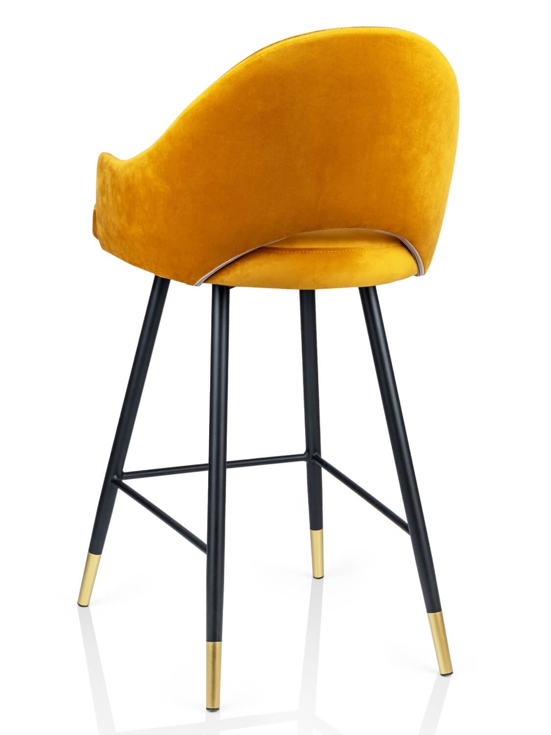 Hoker tapicerowany Megan miodowy z ozdobnymi złotymi końcówkami na stalowym czarnym stelażu z wycięciem w oparciu