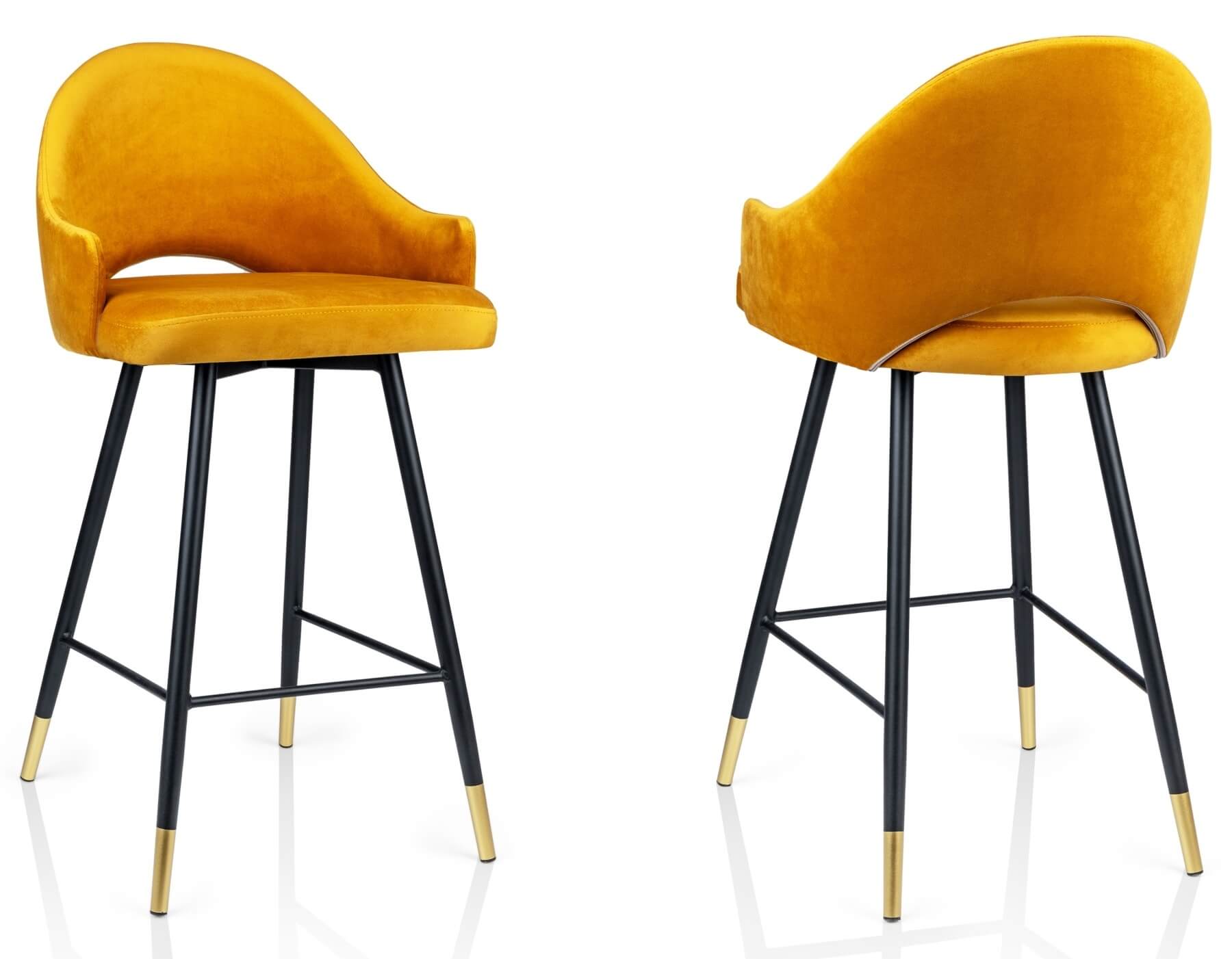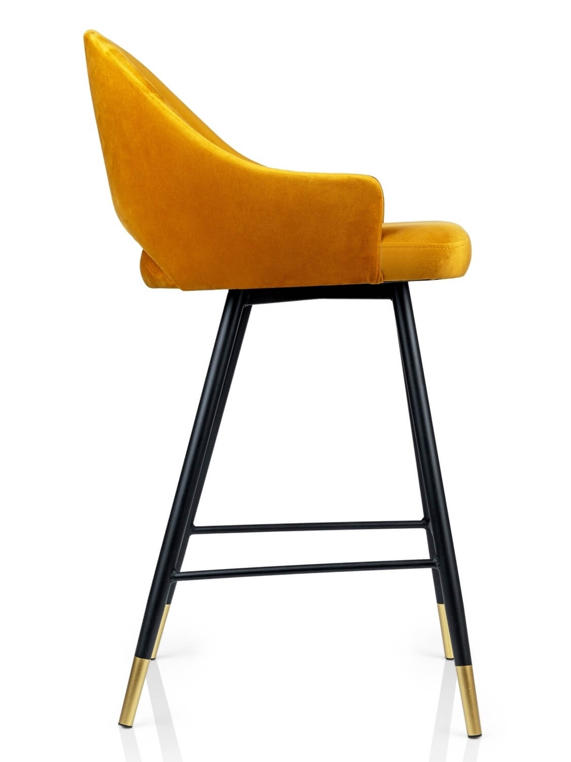 Tapicerowany hoker Megan w miodowym kolorze z ozdobnymi, złotymi końcówkami na czarnym stalowym stelażu to idealne połączenie nowoczesnego designu i funkcjonalności. Doskonały wybór do eleganckich kuchni, barów oraz wnętrz urządzonych w stylu glamour.
