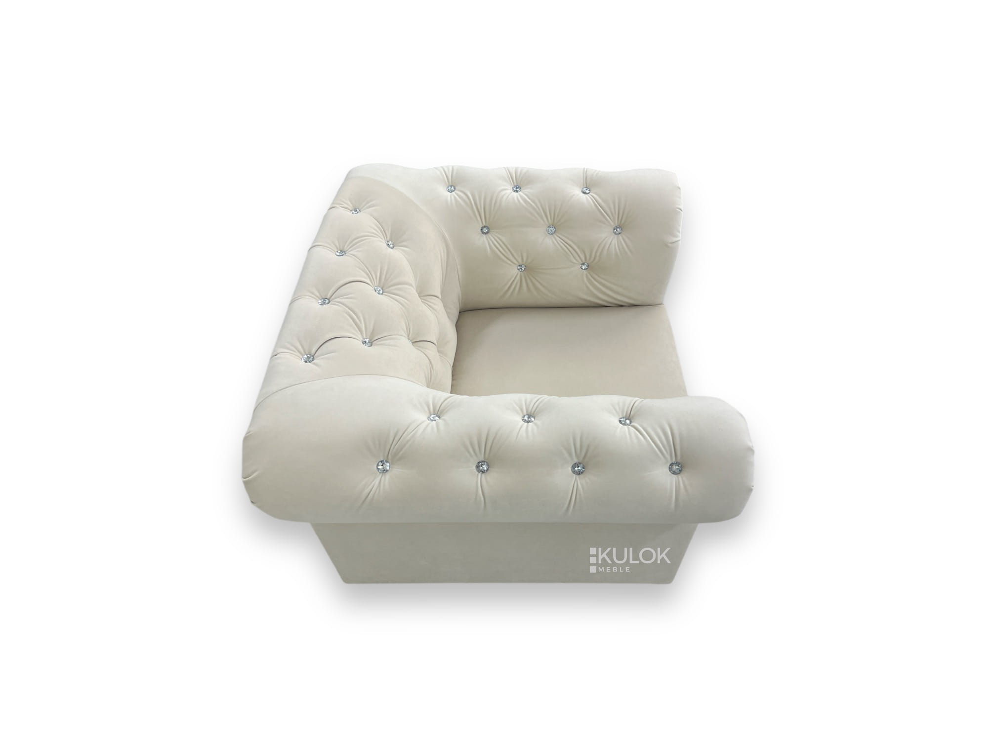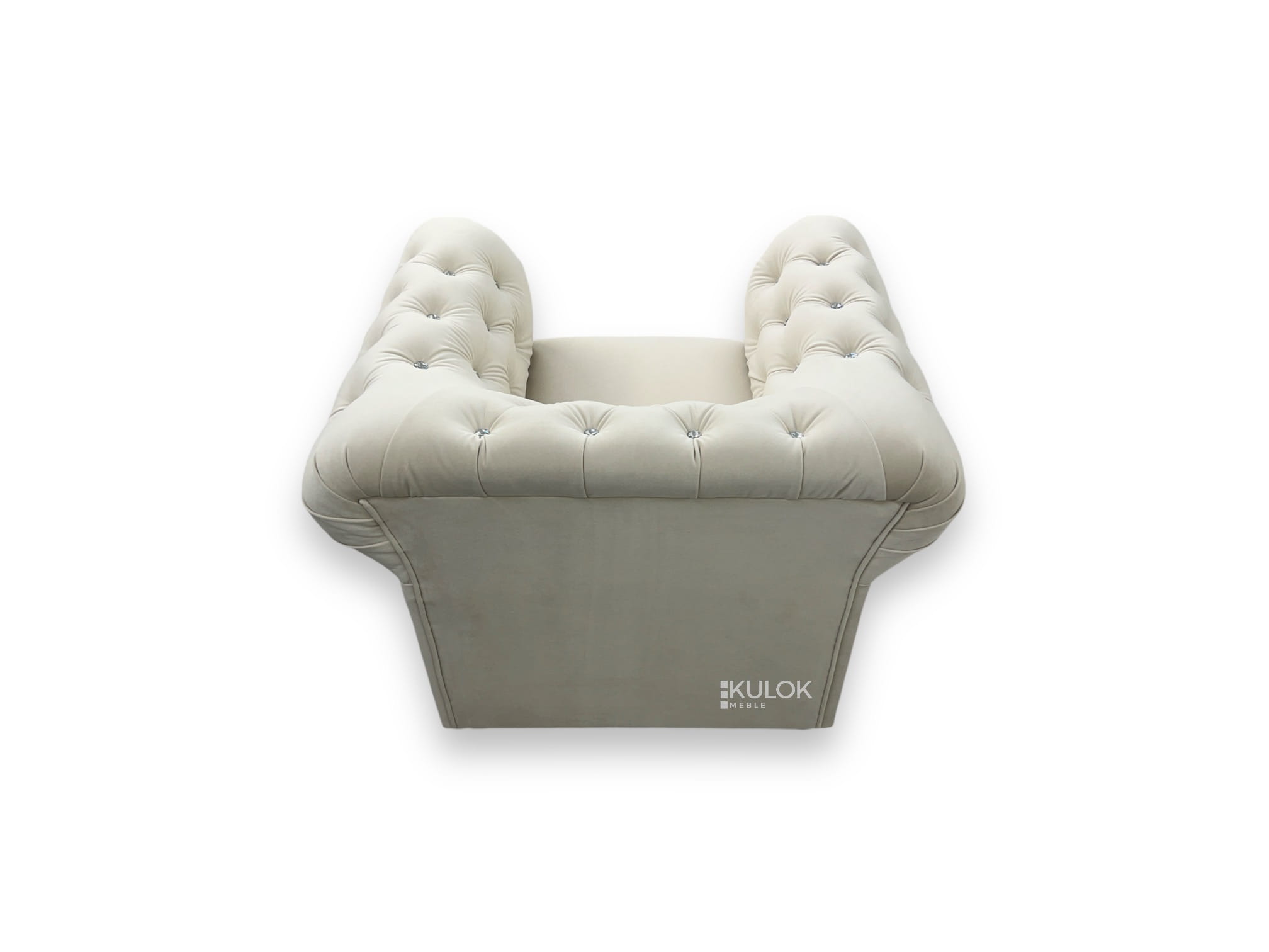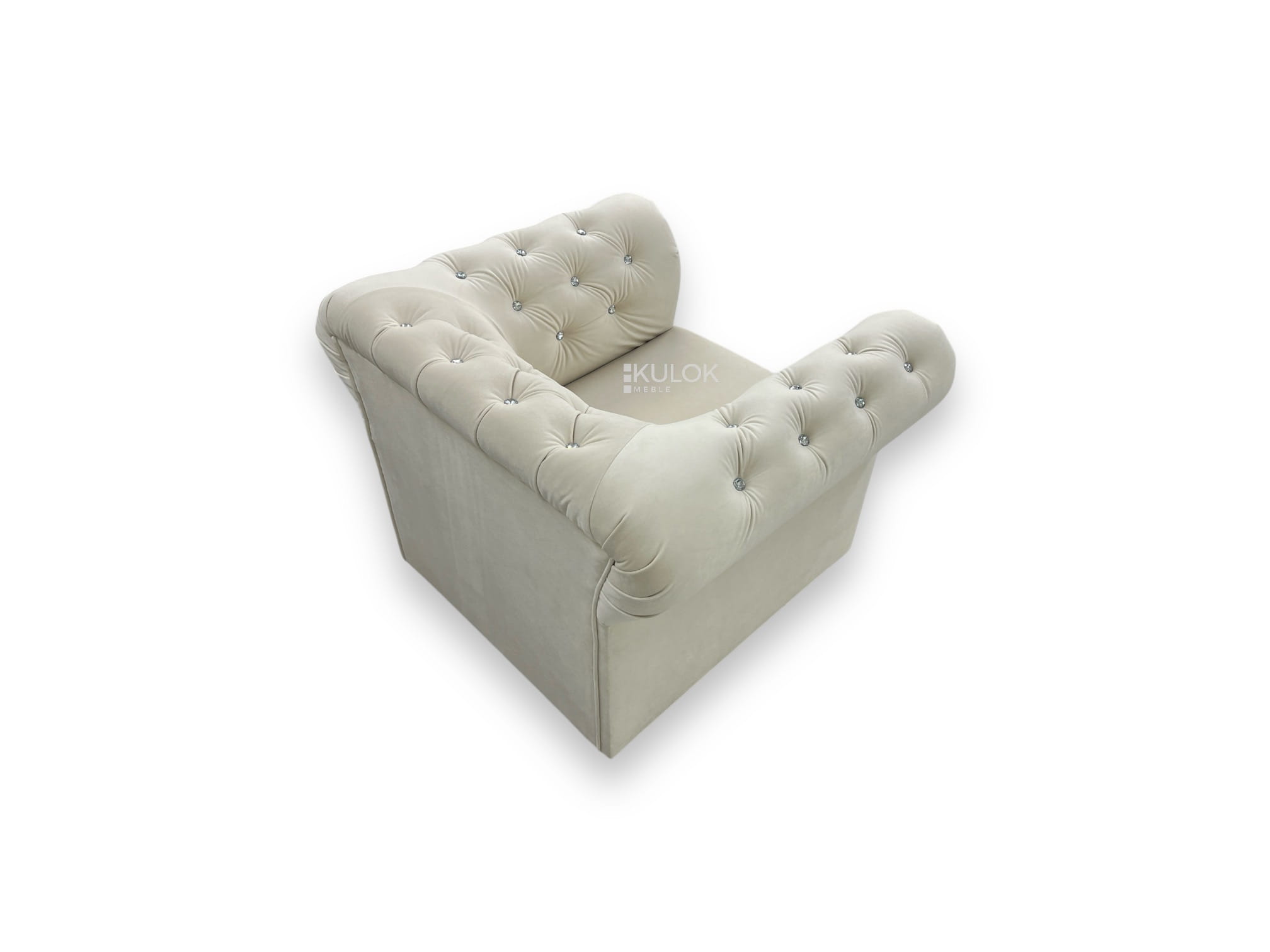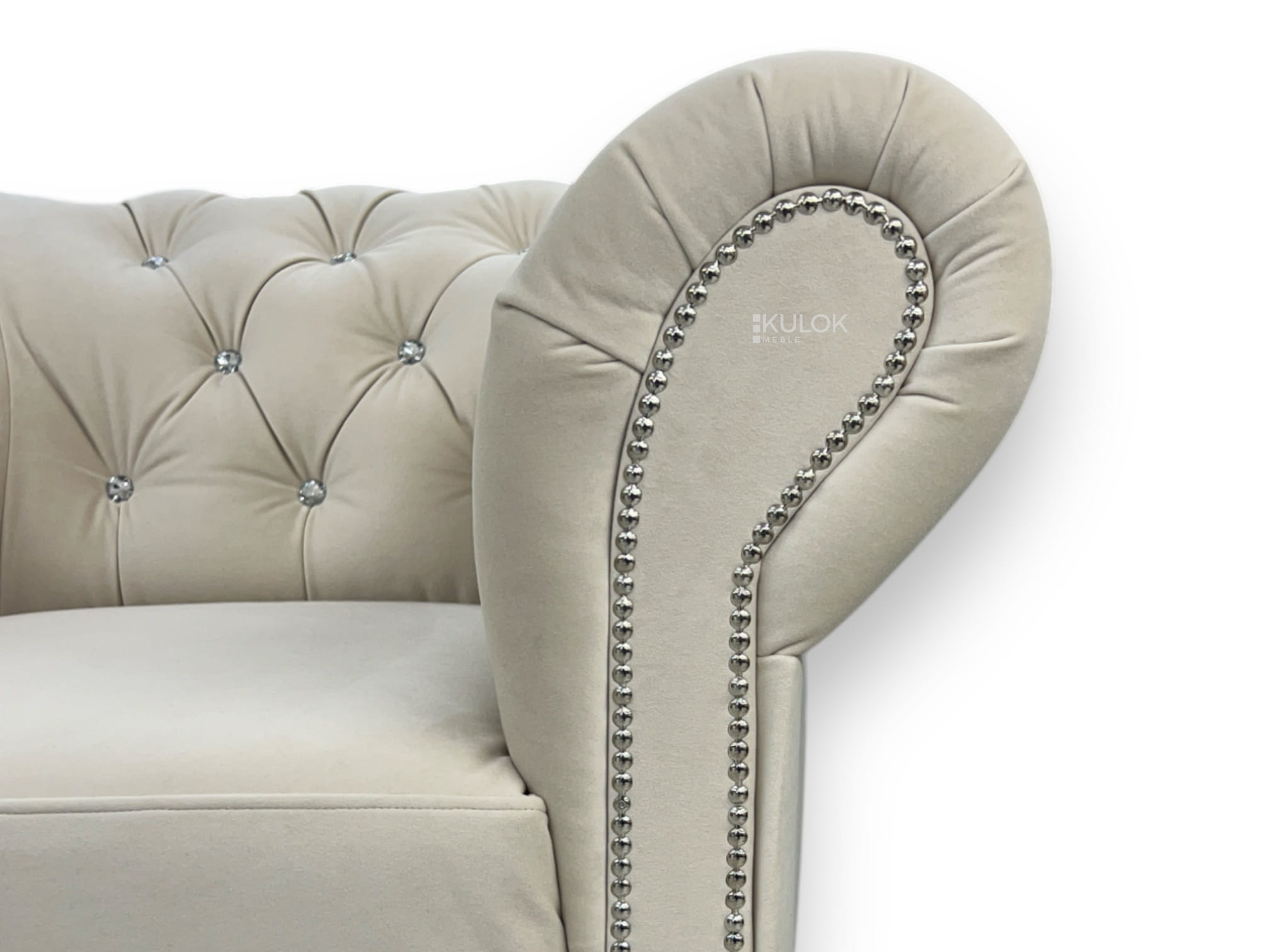 Chesterfield Fotel Glamour Venus Velvet 2927 ecru srebrne ćwieki, kryształki i niskie srebrne nogi