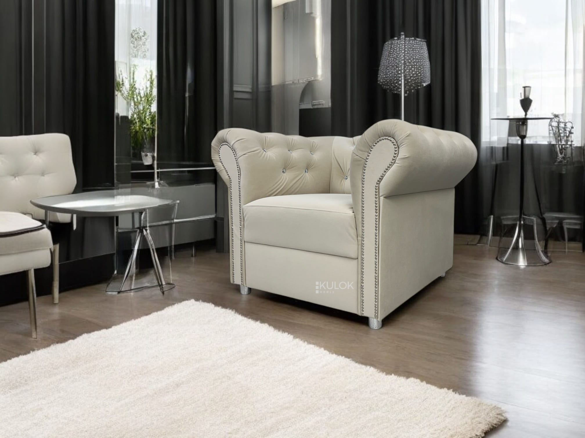 Poznaj luksusowy fotel Chesterfield Glamour, który łączy tradycyjny styl Chesterfield z nowoczesnym blaskiem glamour. Wykonany w Polsce z najwyższą dbałością o detale, stanowi doskonały wybór do eleganckich wnętrz, takich jak salony, gabinety czy przestrzenie hotelowe. Model Venus Velvet 2927 wyróżnia się tapicerką z aksamitnej tkaniny, subtelnym kolorem ecru, dekoracyjnymi kryształkami oraz srebrnymi ćwiekami podkreślającymi wyjątkowy charakter mebla.