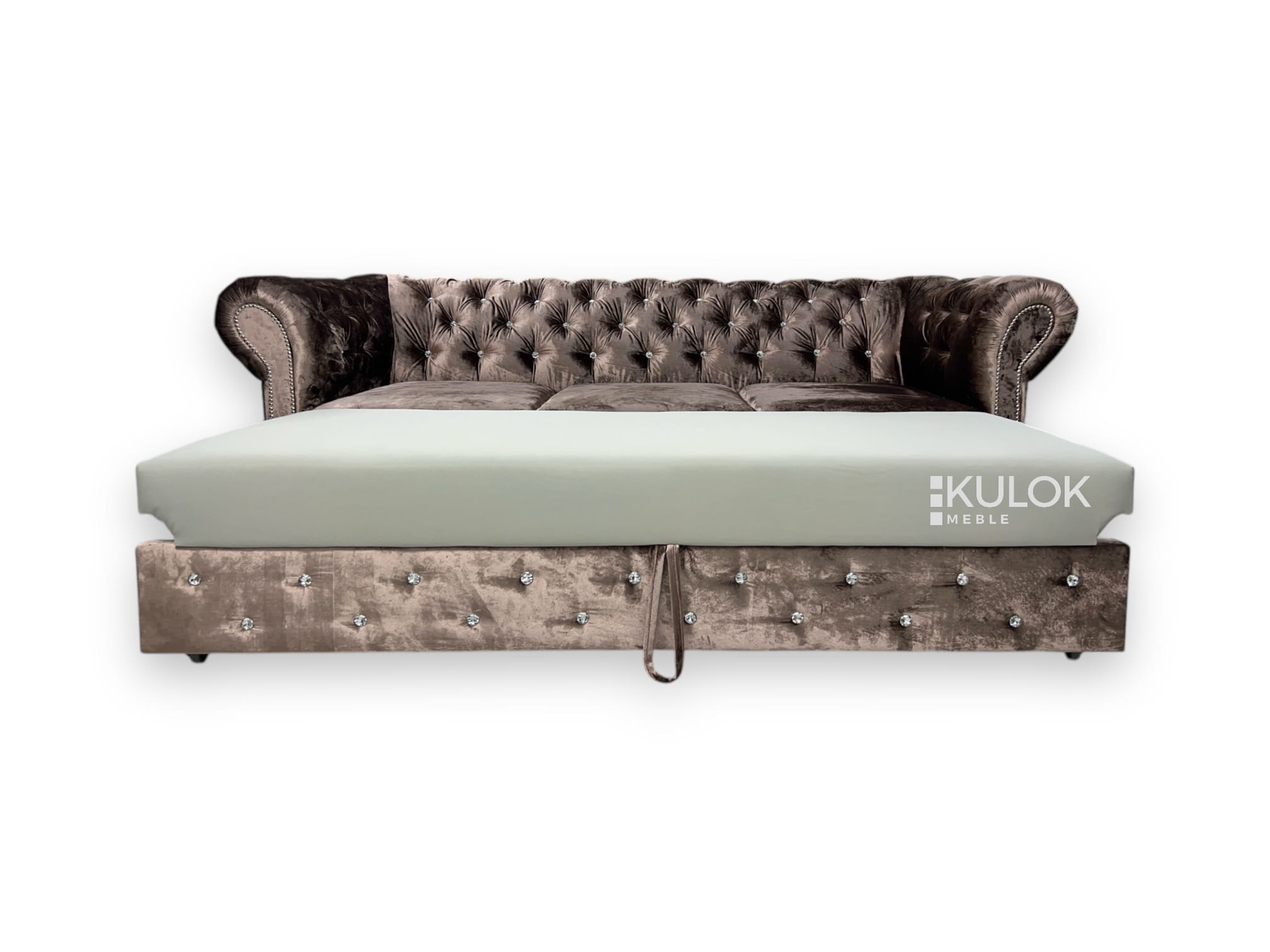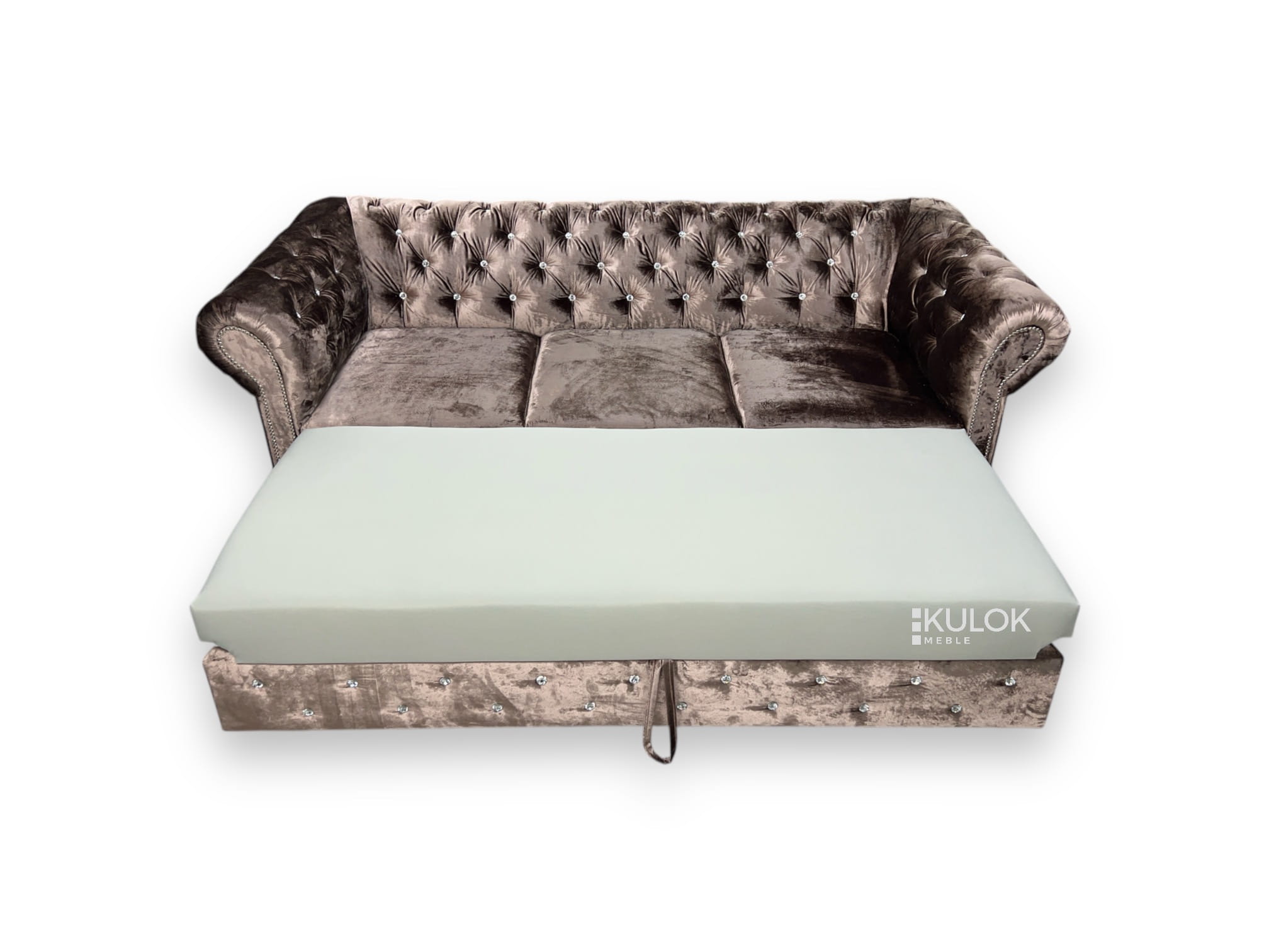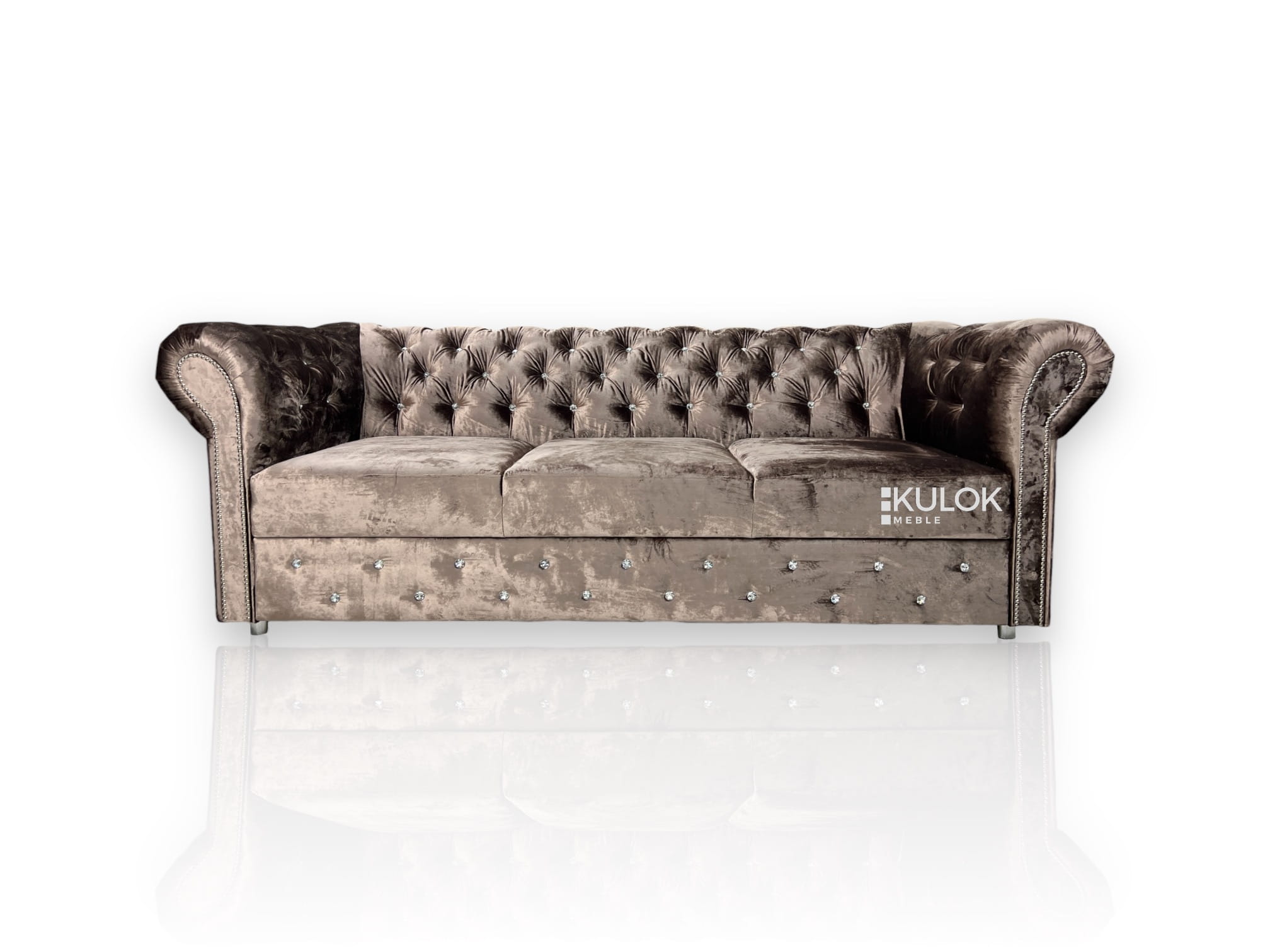 Stylowa sofa Chesterfield Glamour Max to połączenie klasyki z nowoczesnością. Wykonana z najwyższej jakości materiałów, pokryta miękkim welurem Gloss Velvet 1202 w kolorze lśniącego brązu. Idealna dla tych, którzy cenią sobie elegancję i funkcjonalność – sofa wyposażona w funkcję spania i pojemnik na pościel. Polski producent Kulok Meblegwarantuje jakość i możliwość personalizacji.