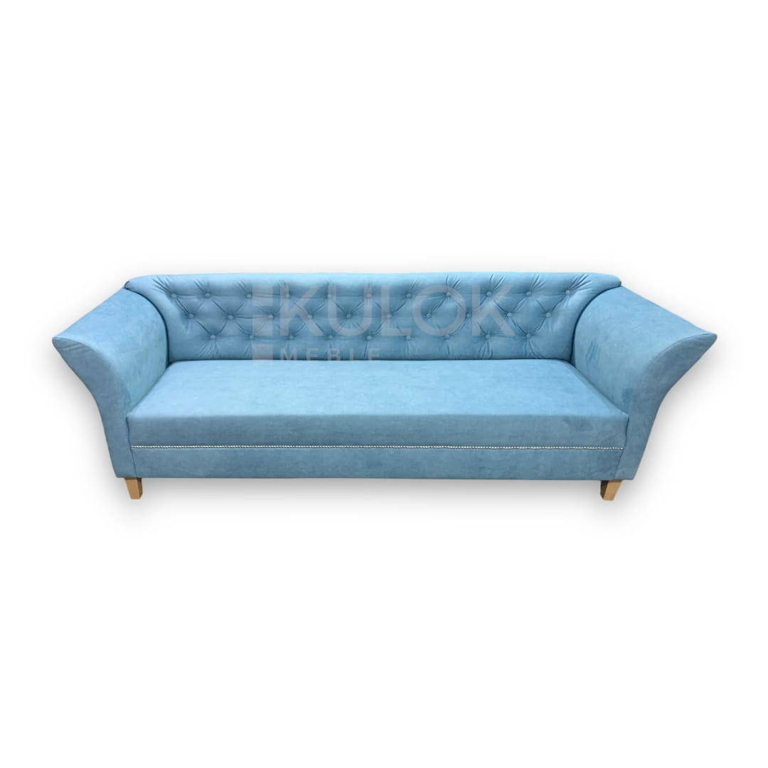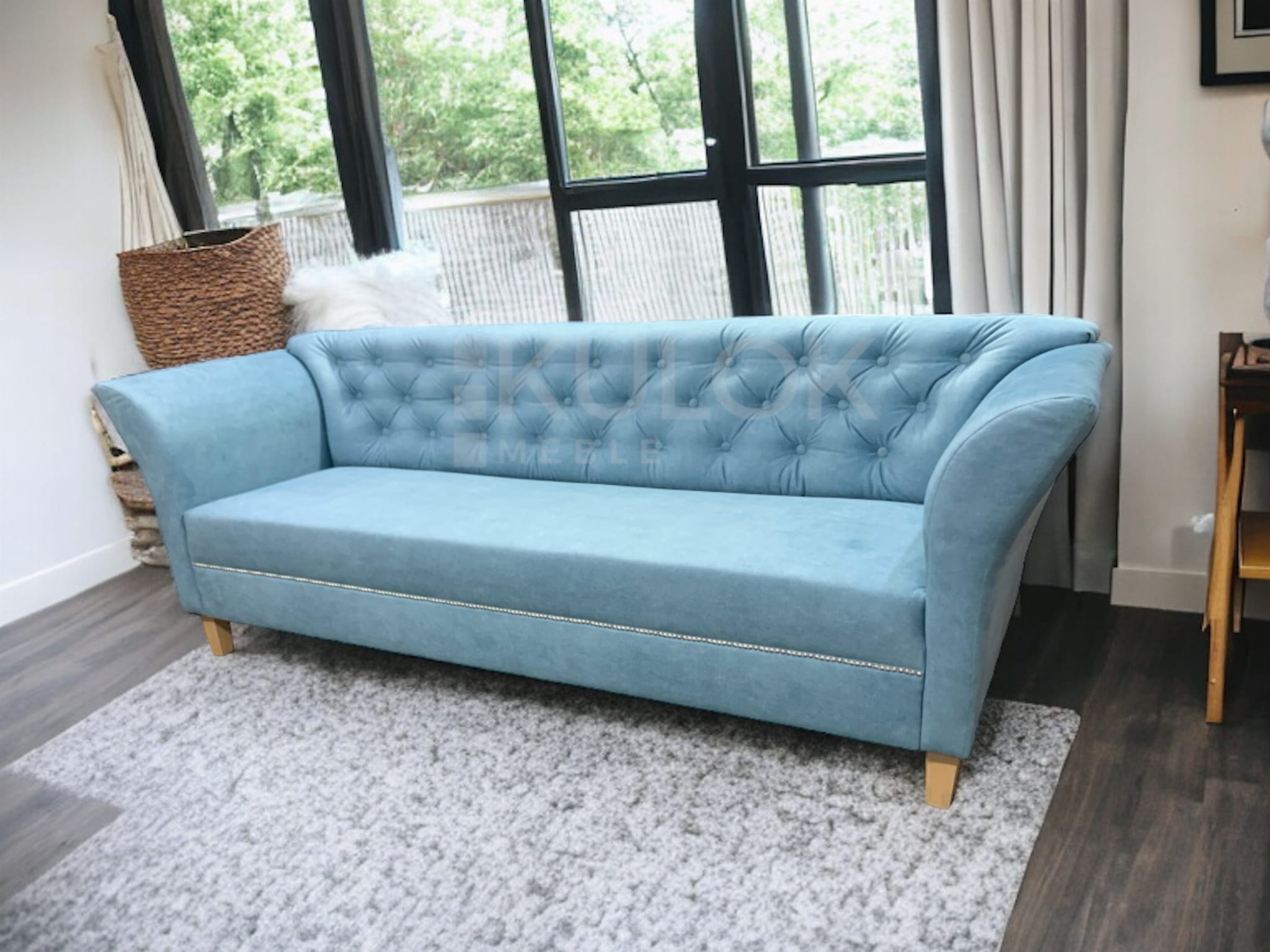 Sofa Chester to wyjątkowy dodatek do każdego wnętrza. Obita miękkim materiałem w jasnoniebieskim kolorze Baby Blue, dodaje świeżości i lekkości. Pikowanie guzikami nadaje sofie klasycznego i eleganckiego wyglądu, podkreślając jej wyrafinowany design. Ozdobne listwy i jasne drewniane nogi dopełniają estetycznego uroku.