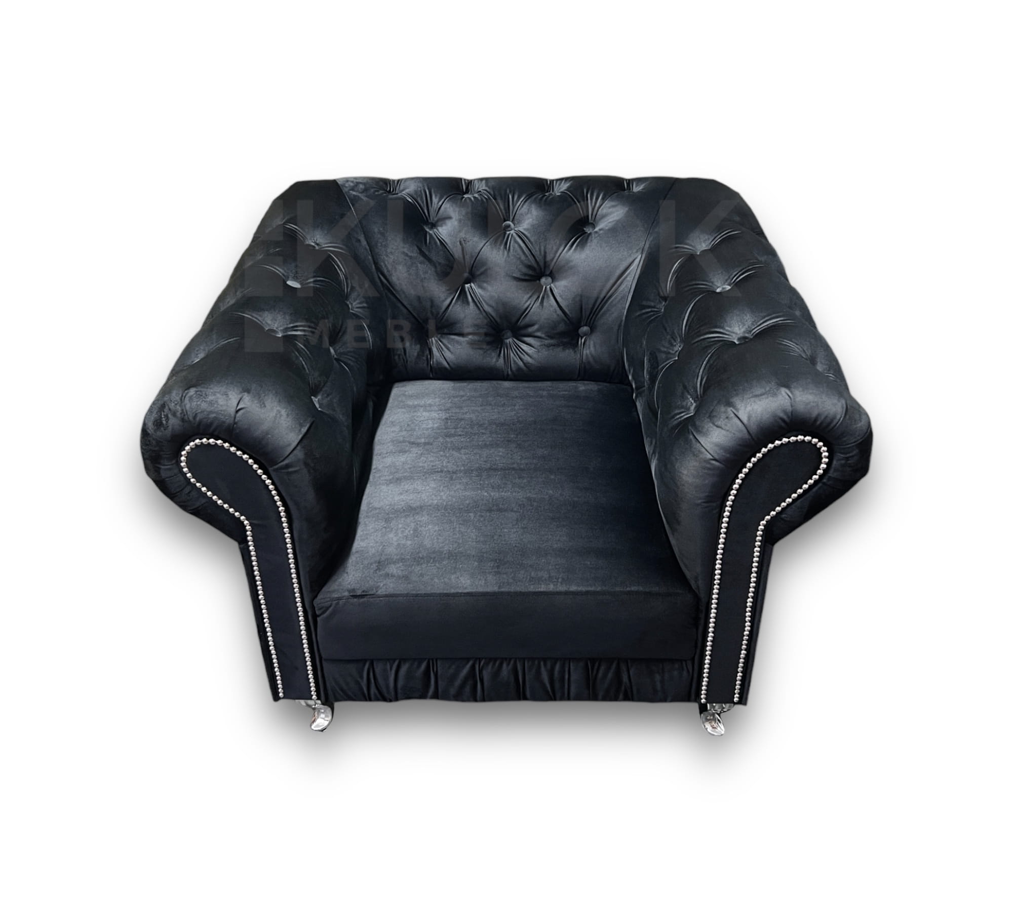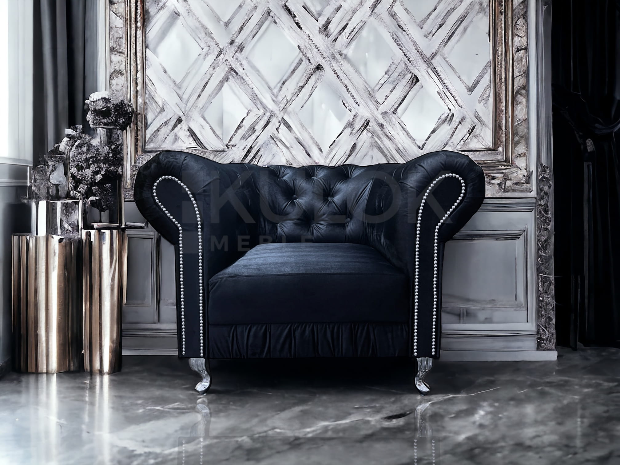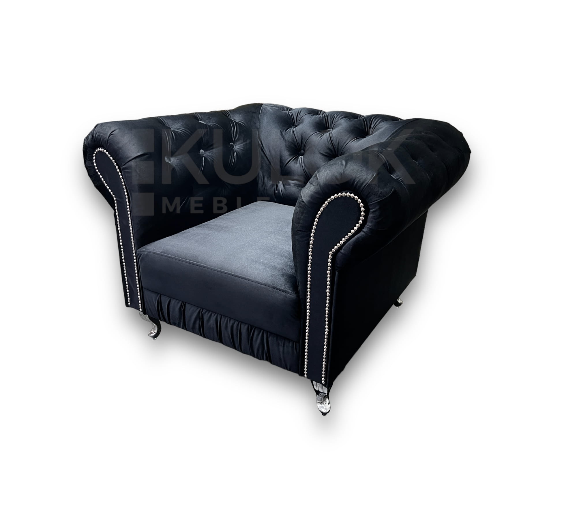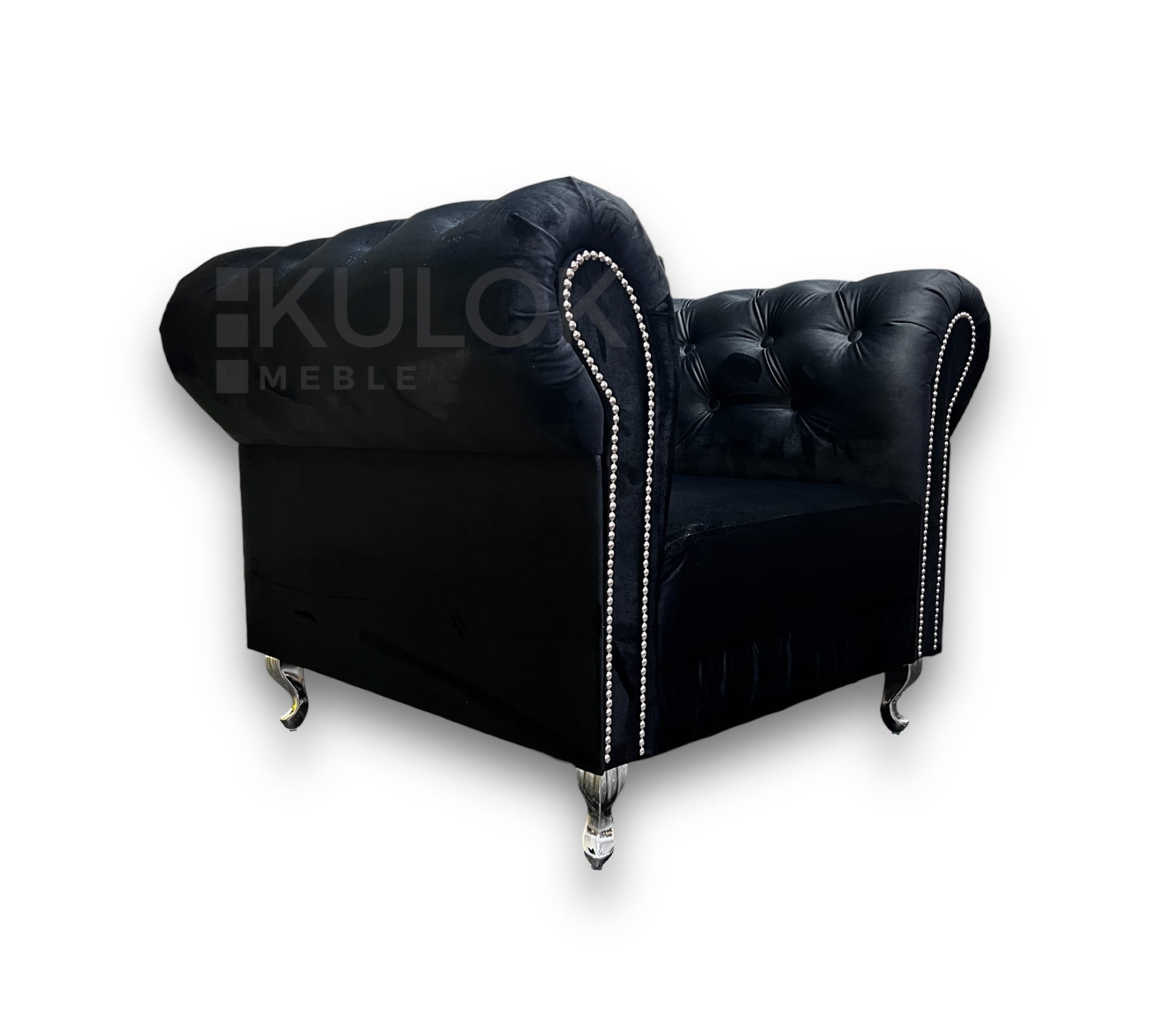 Elegancja Ludwika spotyka się z komfortem fotela Chesterfield w naszym wyjątkowym Fotelu Ludwik w stylu Chesterfield. Czarna, pikowana tkanina Fresh 17 Velvet tworzy doskonałe tło dla tego designerskiego mebla, podkreślając jego wyrafinowany charakter. Wysokie oparcie, pikowane z precyzją, zapewnia nie tylko estetykę, ale również wygodę, która sprawi, że spędzanie czasu w tym fotelu stanie się prawdziwą przyjemnością.n Ozdobne listwy na bokach dodają subtelnego blasku glamour, tworząc unikalne połączenie tradycji z nowoczesnością. Srebrne nogi metalowe nadają fotelowi lekkości, dodając mu jednocześnie nowoczesnego charakteru. To nie tylko mebel do siedzenia, to prawdziwa ozdoba salonu, która przyciąga uwagę swoim eleganckim wyglądem. Salonowy Fotel Ludwik to nie tylko wybór estetyczny, ale także funkcjonalny. Doskonale wpisuje się w nowoczesne trendy aranżacyjne, dodając wnętrzu niepowtarzalnego stylu. Wyjątkowy design, pikowane detale i listwy glamour sprawiają, że ten fotel staje się centralnym punktem każdego eleganckiego salonu. Efekt marszczenia na dolnej cześci fotela, nadaje mu niezwykłego i niepowtarzalnego stylu.