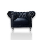 Fotel Chesterfield Ludwik srebro. Czarny fotel pikowany guzikami - wysokie oparcie. Ozdobne listwy w kolorze srebra na bokach dodają stylu glamour. Fotel w czarnej tkaninie Fresh 17 velvet. Fotel Chesterfield Ludwik srebrne nogi metalowe wysokie. Fotel w klasyce do salonu w stylu anielskiem i nowoczesnym. Top fotel z efektem marszczenia tkaniny.