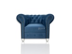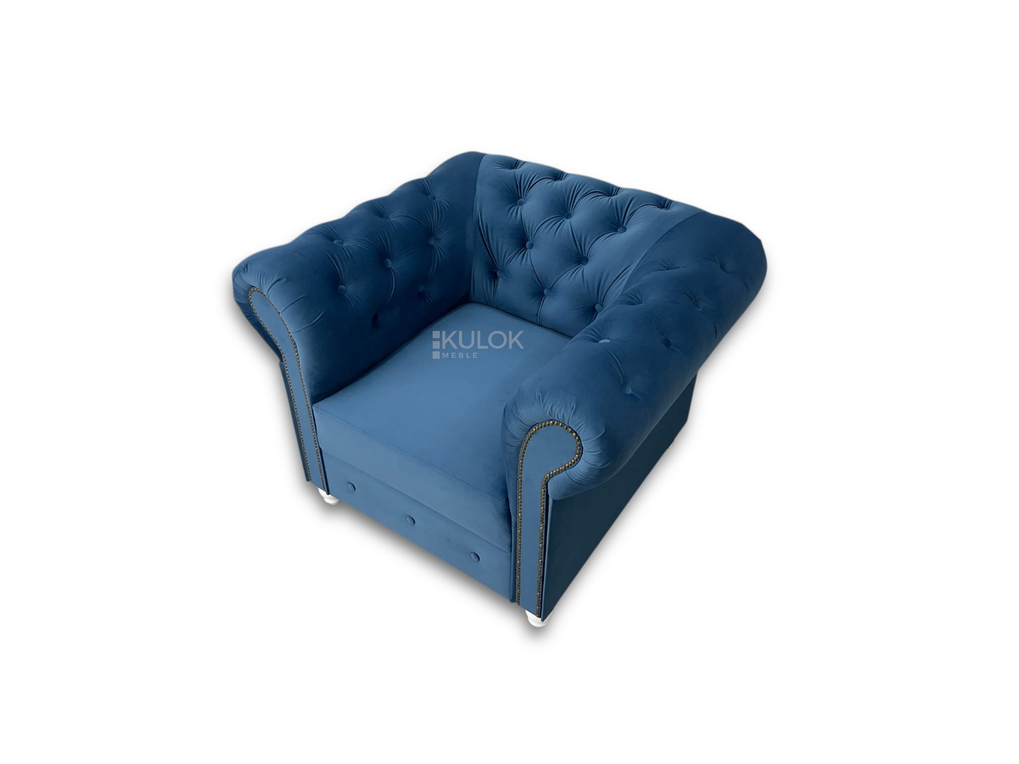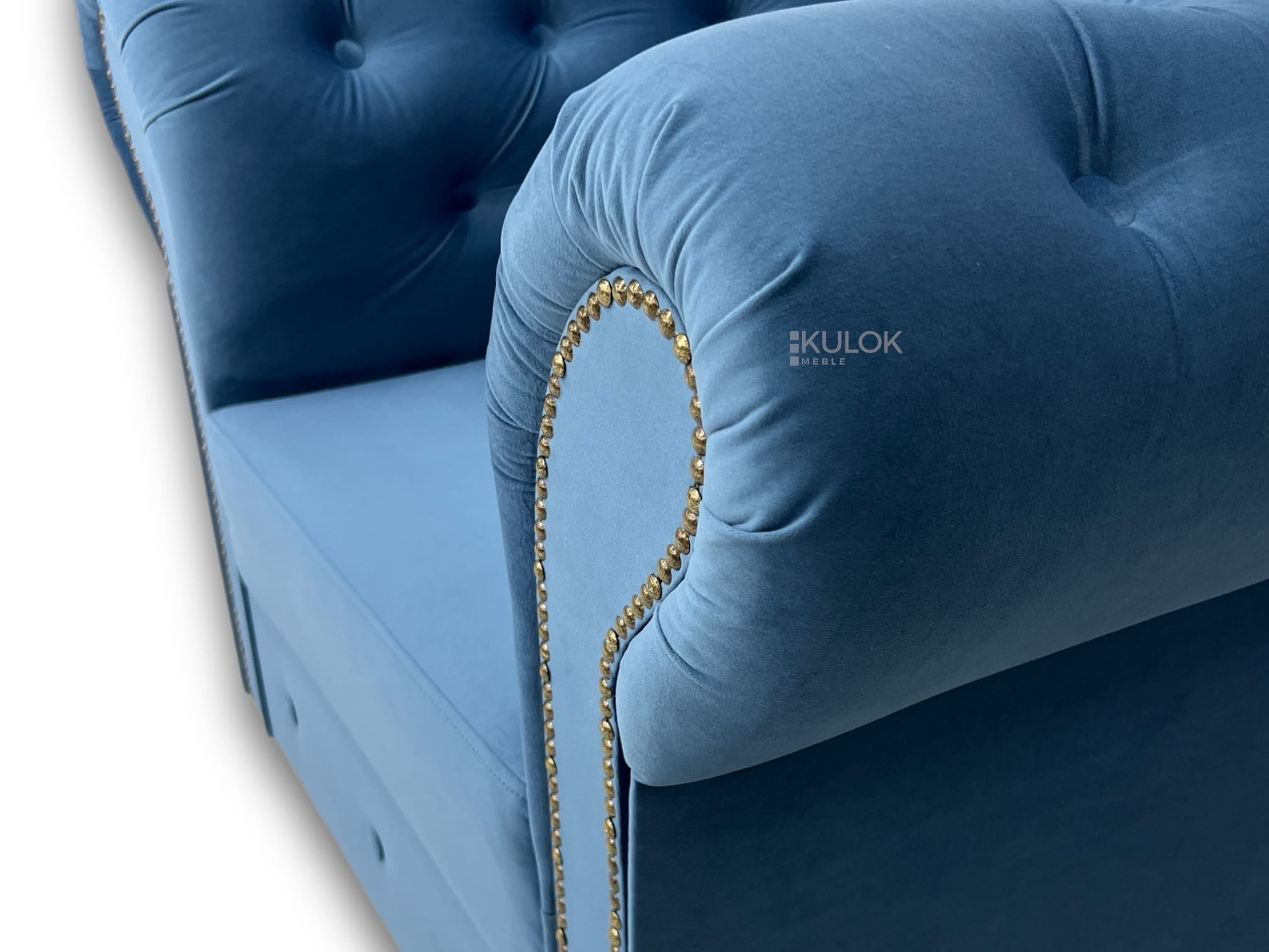 Chesterfield Magic Velvet 2233 – jasny kobalt fotel z guzikami, ćwiekami i toczonymi nogami