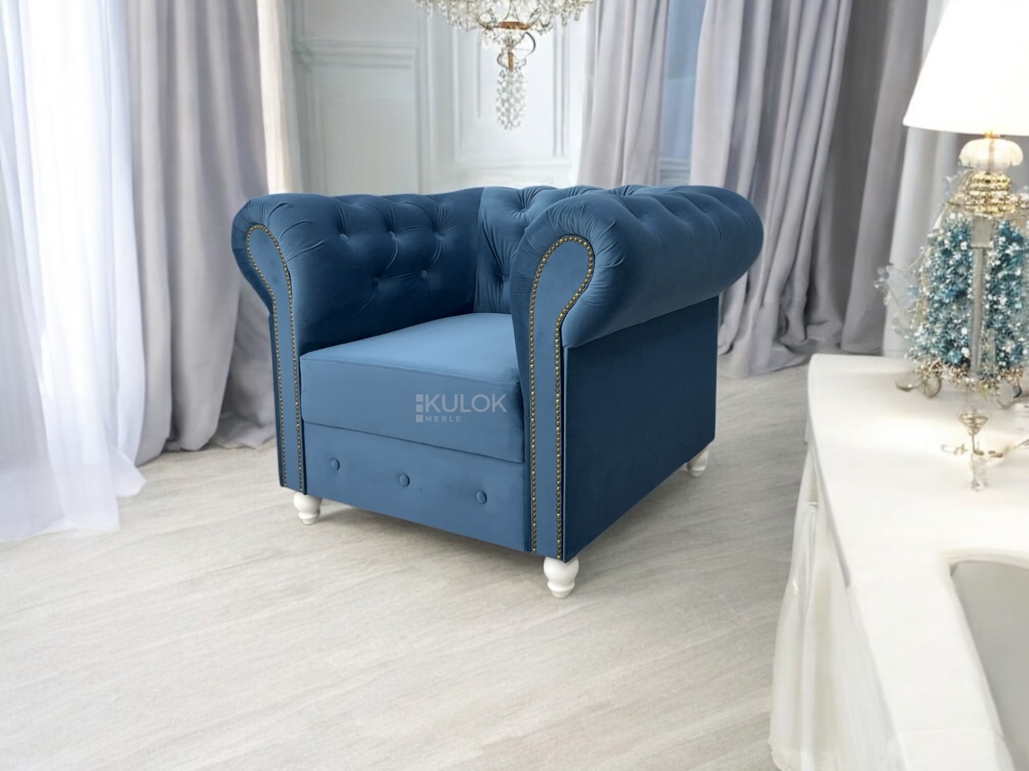 Odkryj wyjątkowy fotel Chesterfield Magic Velvet 2233– idealne połączenie klasyki i elegancji. To mebel najwyższej jakości, wykonany w Polsce z dbałością o każdy detal. Głębokie pikowanie, ozdobne guziki, a także ćwieki w odcieniu starego złota dodają mu wytwornego charakteru, który idealnie wpisuje się w styl glamour, klasyczny, retro i angielski. Nogi w kolorze białym, toczone i solidne, zapewniają stabilność i unikalny wygląd.