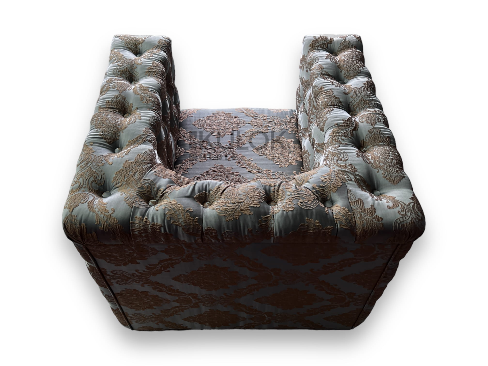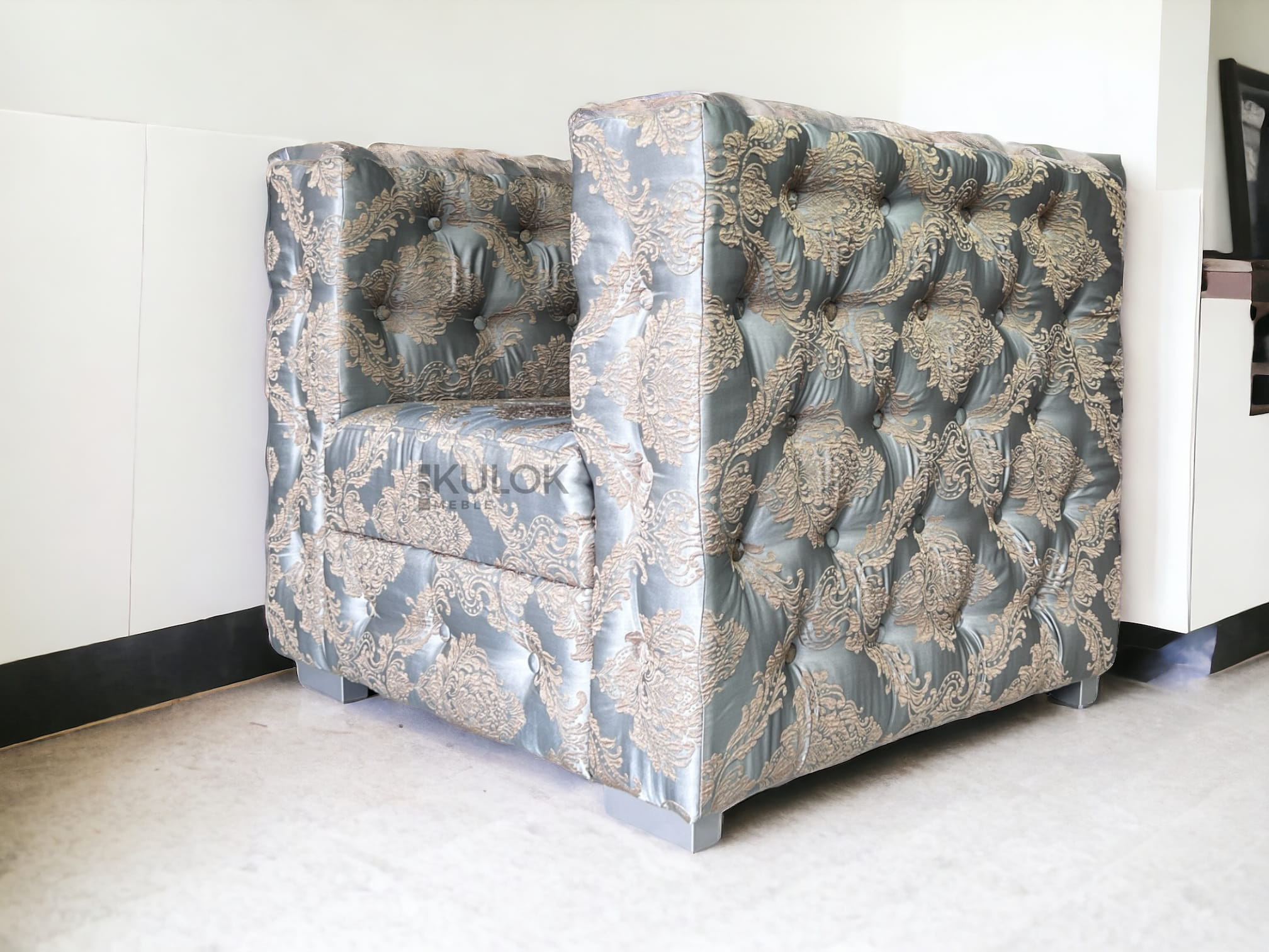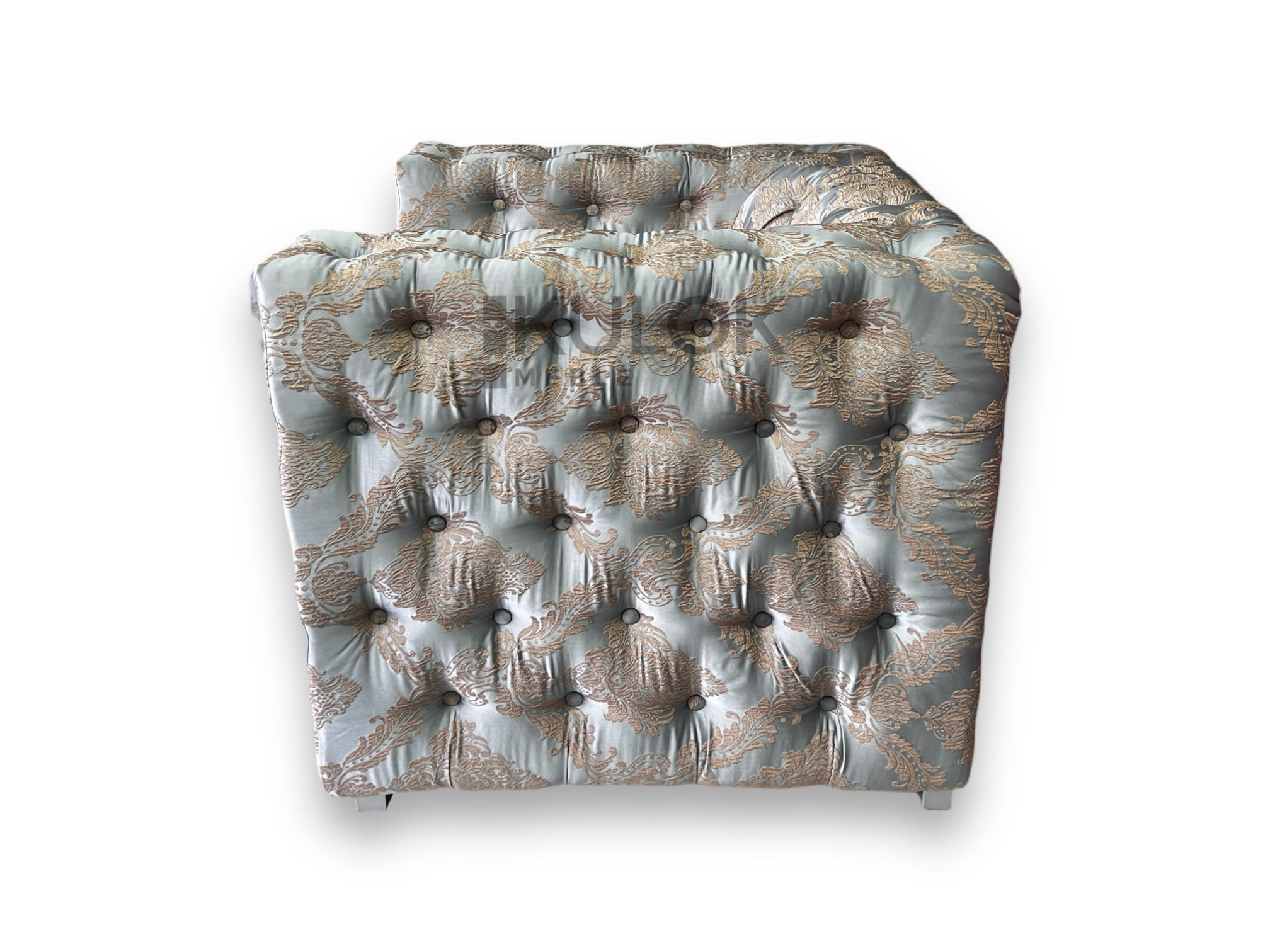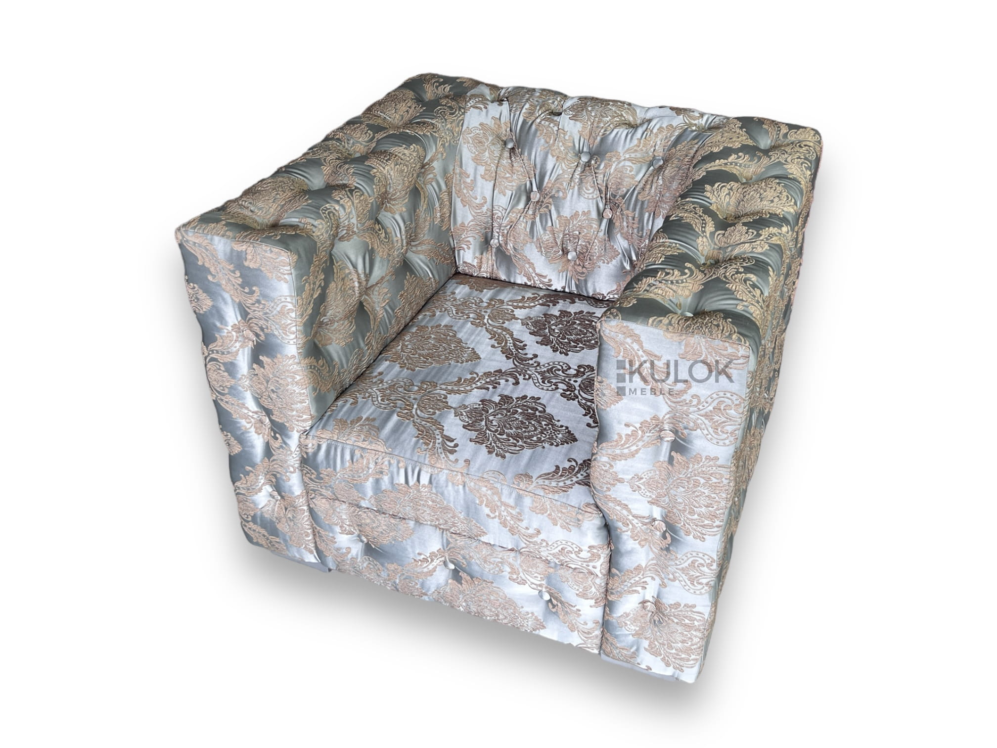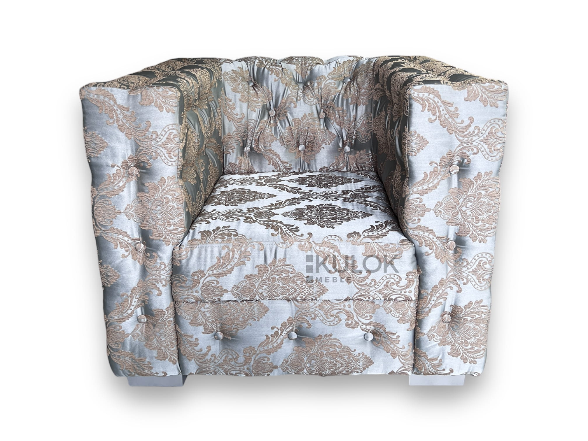 Odkryj elegancję i luksus w naszym Fotelu pikowanym Manchester. Dostępny w barokowym wzorze Rocco 636, w złotym i srebrnym kolorze, z niskimi nogami i kanciastym kształtem, ten 1-osobowy fotel to idealne uzupełnienie Twojego wnętrza.