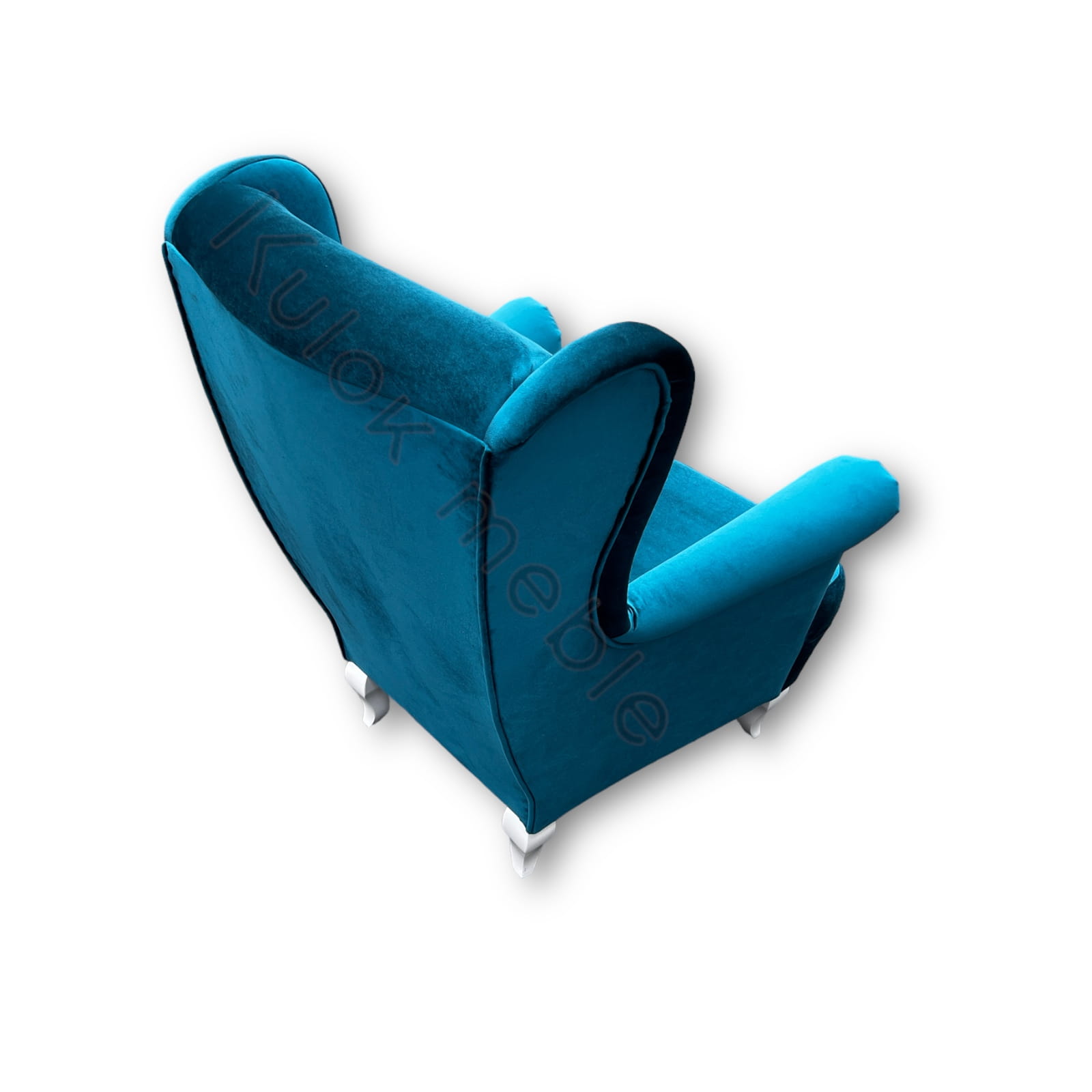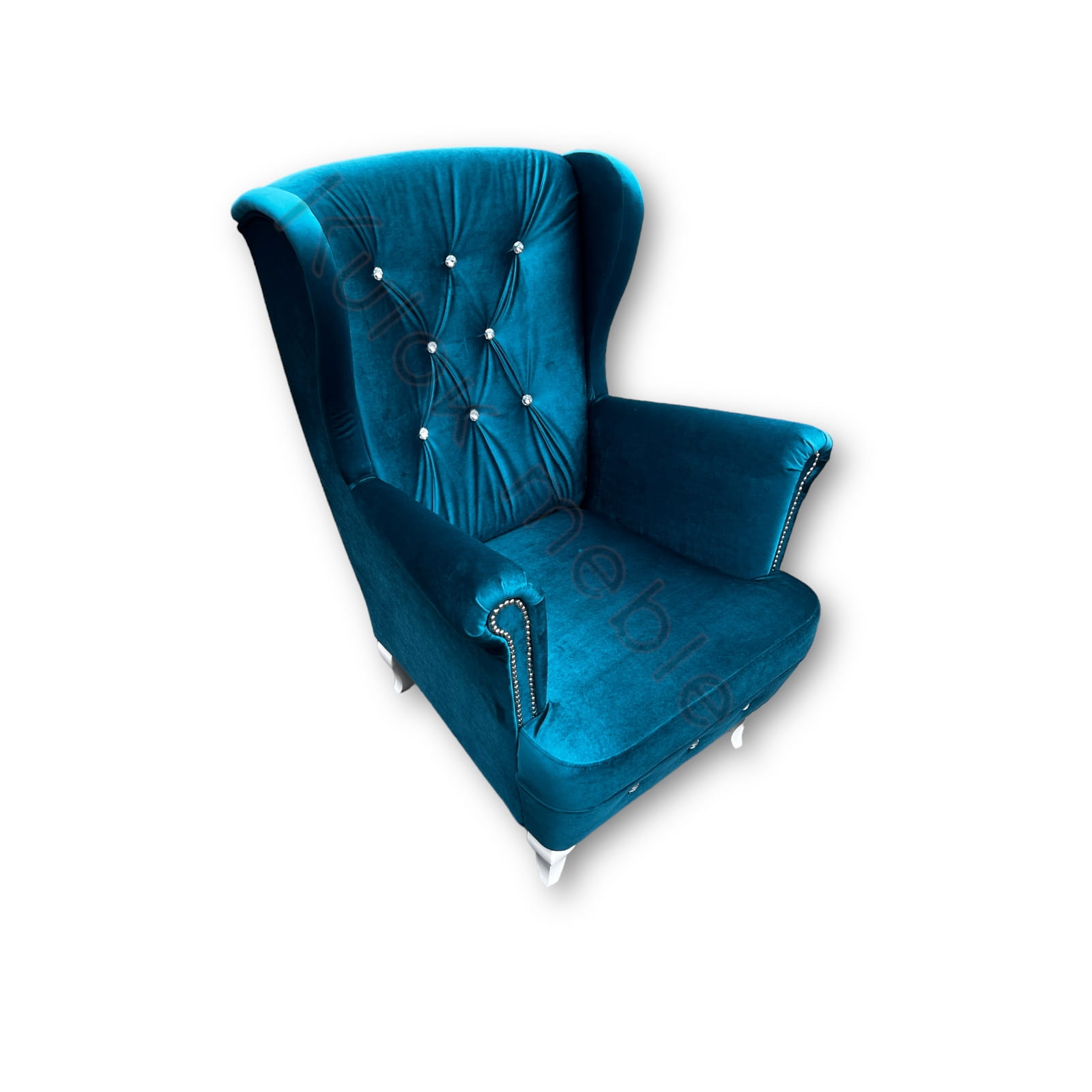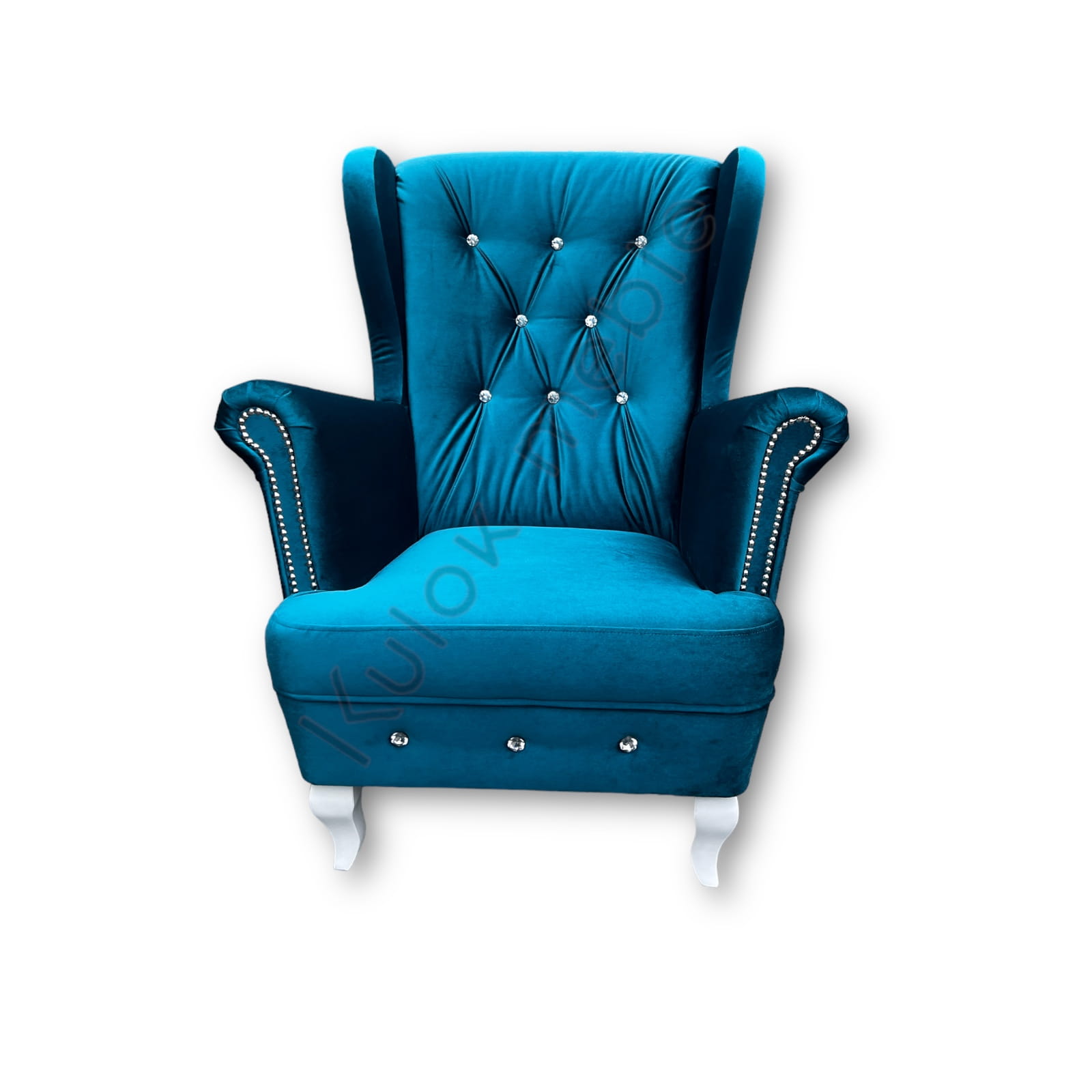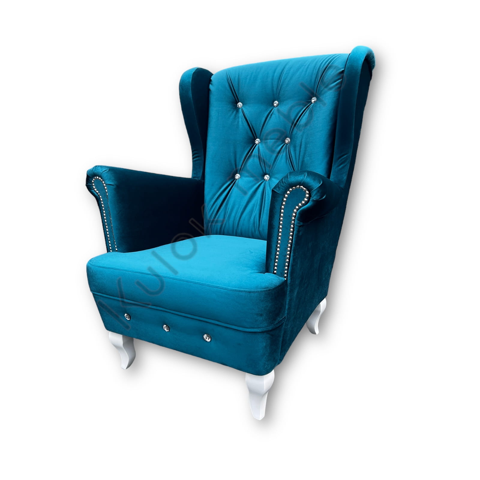Fotel Uszak glamour obity w morskim materiale typu welur. Fotel do sypialni glamour w odcieniu turkusu tkaniny Ikoo 12. Fotel w stylu glamour na białych wysokich nogach Ludwik, pikowany na wysokim oparciu kryształkami. Na bokach fotela w morskim odcieniu znajdują się włoskie listwy ozdobne. Fotel glamour morski jest idealny do sypialni, salonu czy biura i gabinetu. Z możliwością personalizacji fotela, możesz zmienić jego kolor i dodatki.