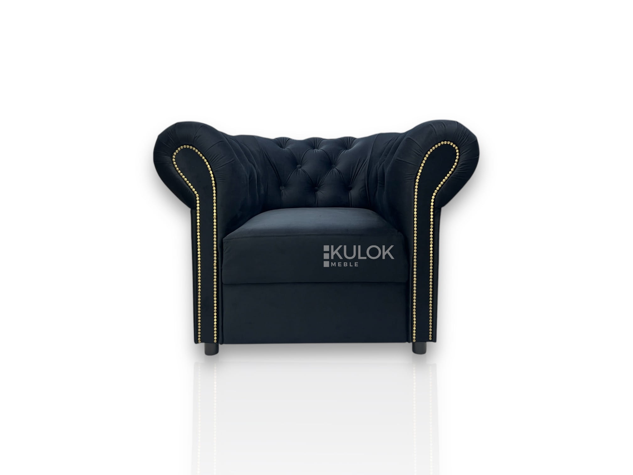 Klasyczny czarny Chesterfield Fotel Magic Velvet 2219 z mosiężnymi ćwiekami, czarnymi niskimi nogami i eleganckimi materiałowymi guzikami