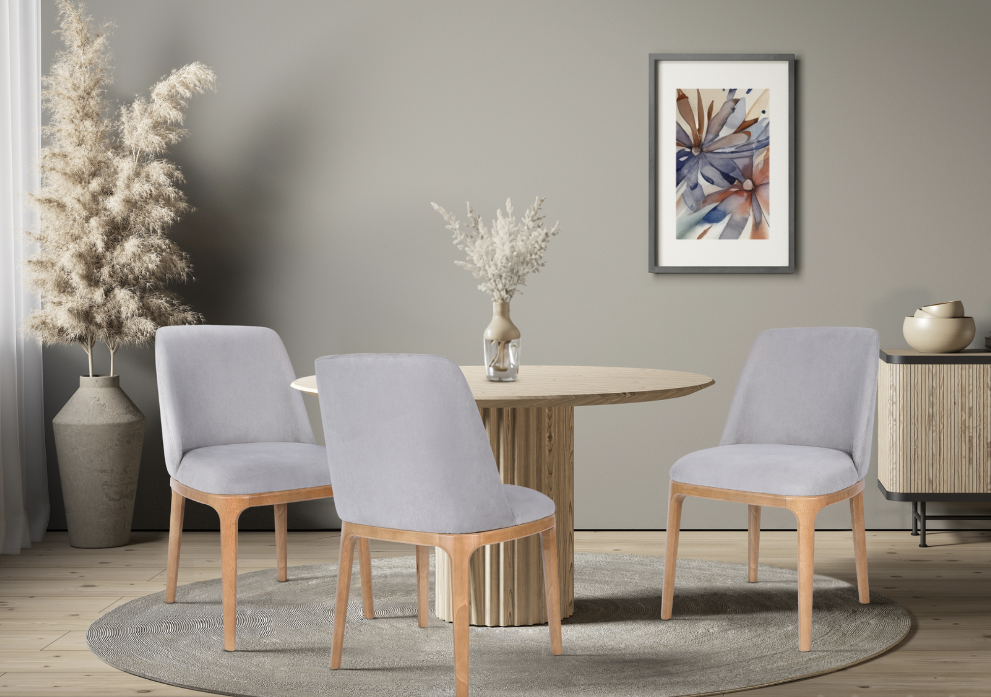 Eleganckie i wygodne krzesło szare Ravalo to połączenie nowoczesnego designu, szerokiego siedziska i naturalnych drewnianych nóg. Idealne do salonu, jadalni czy przestrzeni biurowej – wykonane z dbałością o detale i możliwość personalizacji.