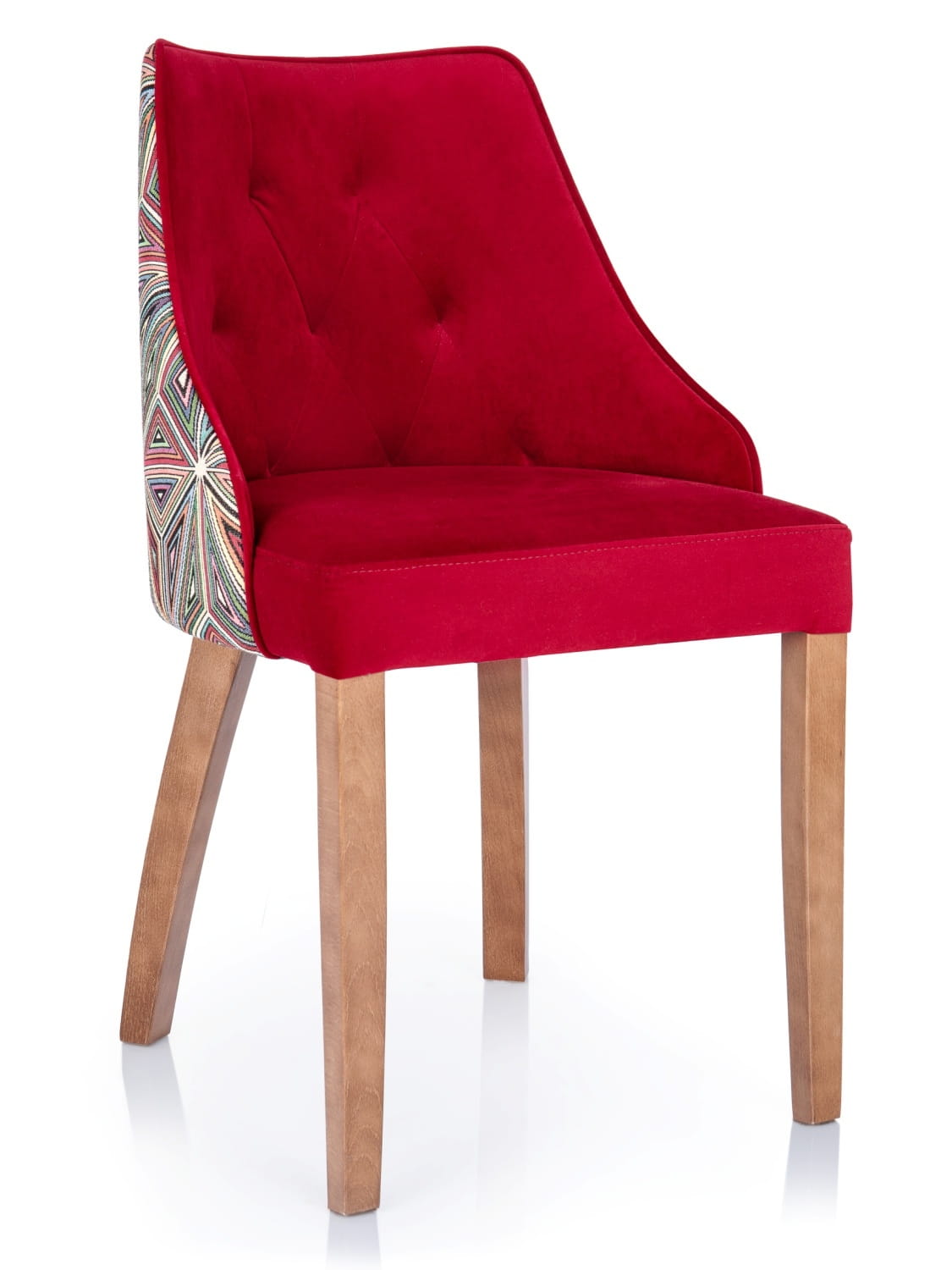 Modernistyczne kubełkowe krzesło Madonna Pik z czerwonym welurem, wzorzystymi plecami i pikowanym oparciem. Bukowe nogi w Magic Velvet. Idealne do jadalni i salonu.
