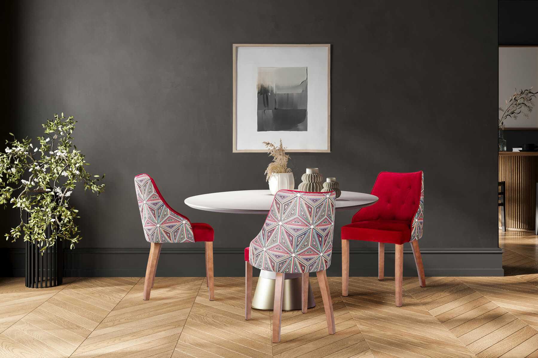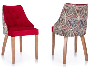 Jakość i wykonanie: Krzesło Madonna Pik charakteryzuje się solidną konstrukcją na bukowych nogach, które zapewniają stabilność i trwałość. Czerwony welur z wzorzystymi plecami i pikowanym oparciem dodaje krzesłu luksusowego wyglądu, jednocześnie zapewniając wygodę użytkowania.