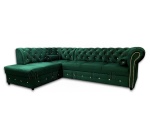 Ekskluzywny narożnik Chesterfield Dubai Bis to połączenie stylu glamour i nowoczesnego designu. Pikowany, designerski z wyrafinowanymi kryształkami Swarovski, zdobiony złotymi listwami włoskimi, prezentuje się niezwykle elegancko. Wykonany z tkaniny Magic Velvet 2225 w pięknym odcieniu butelkowej zieleni, z funkcją spania typu włoski delfin.