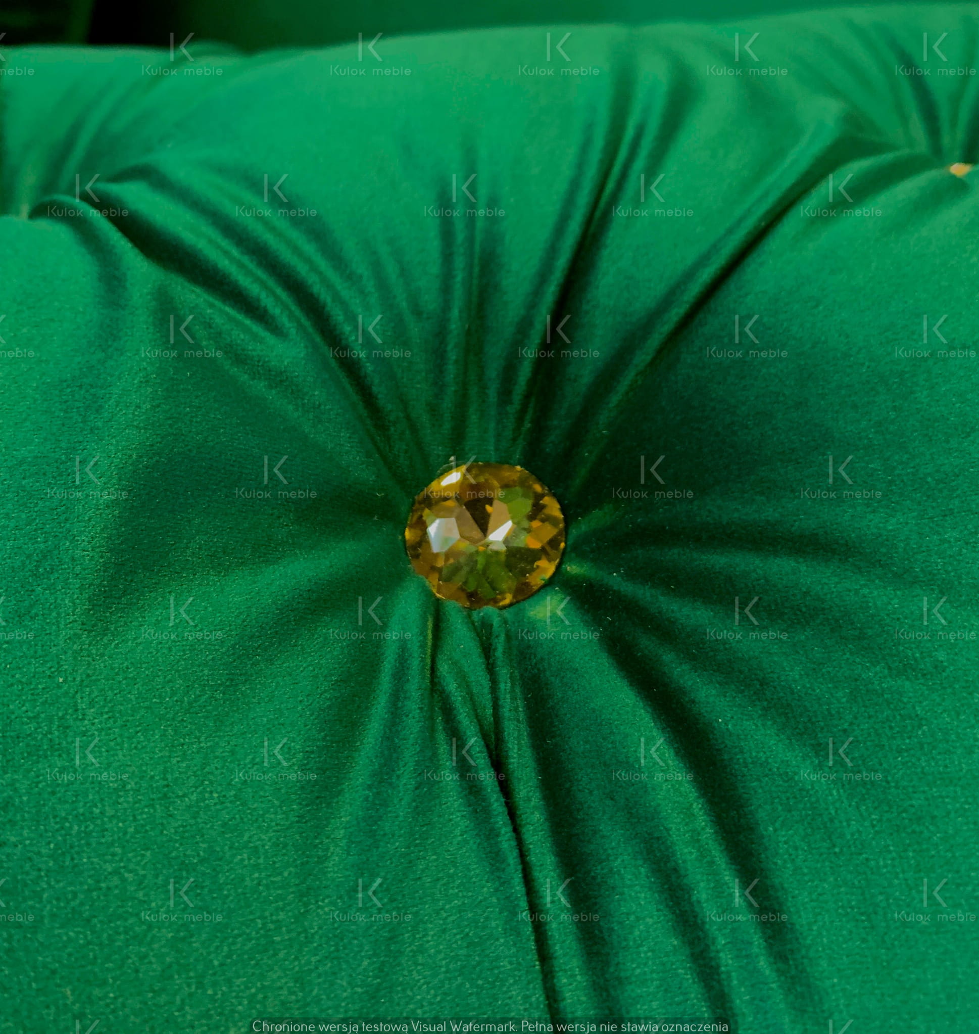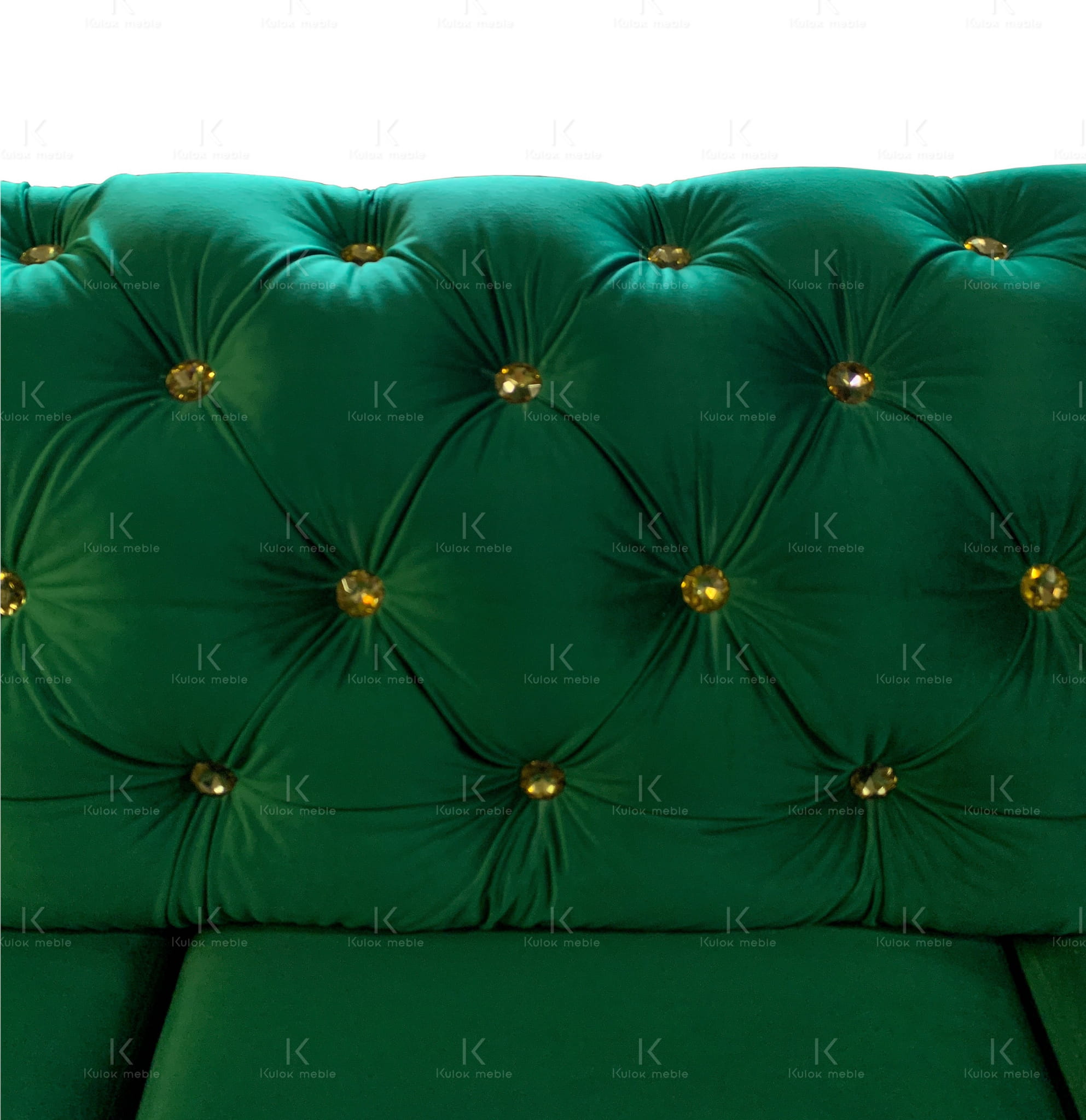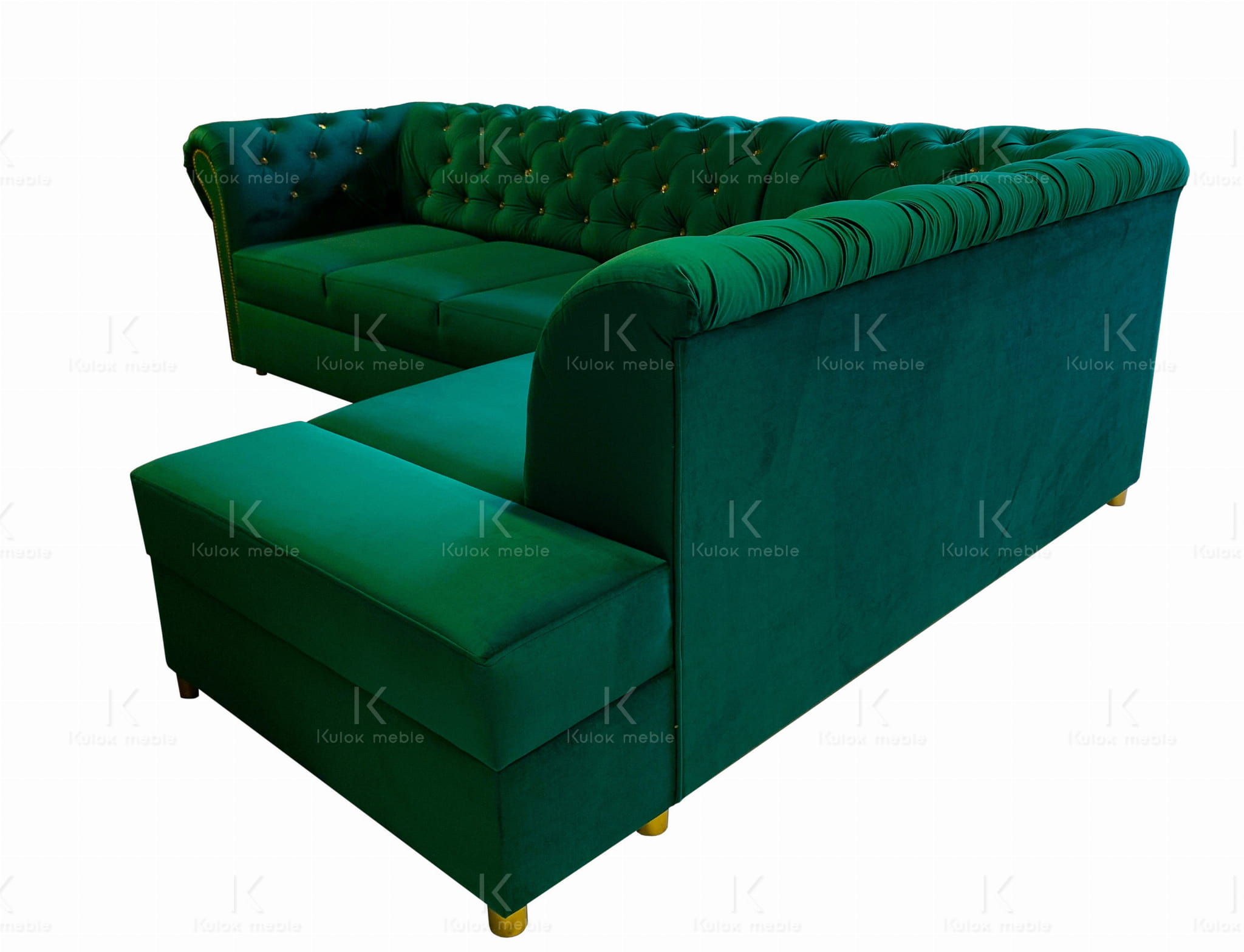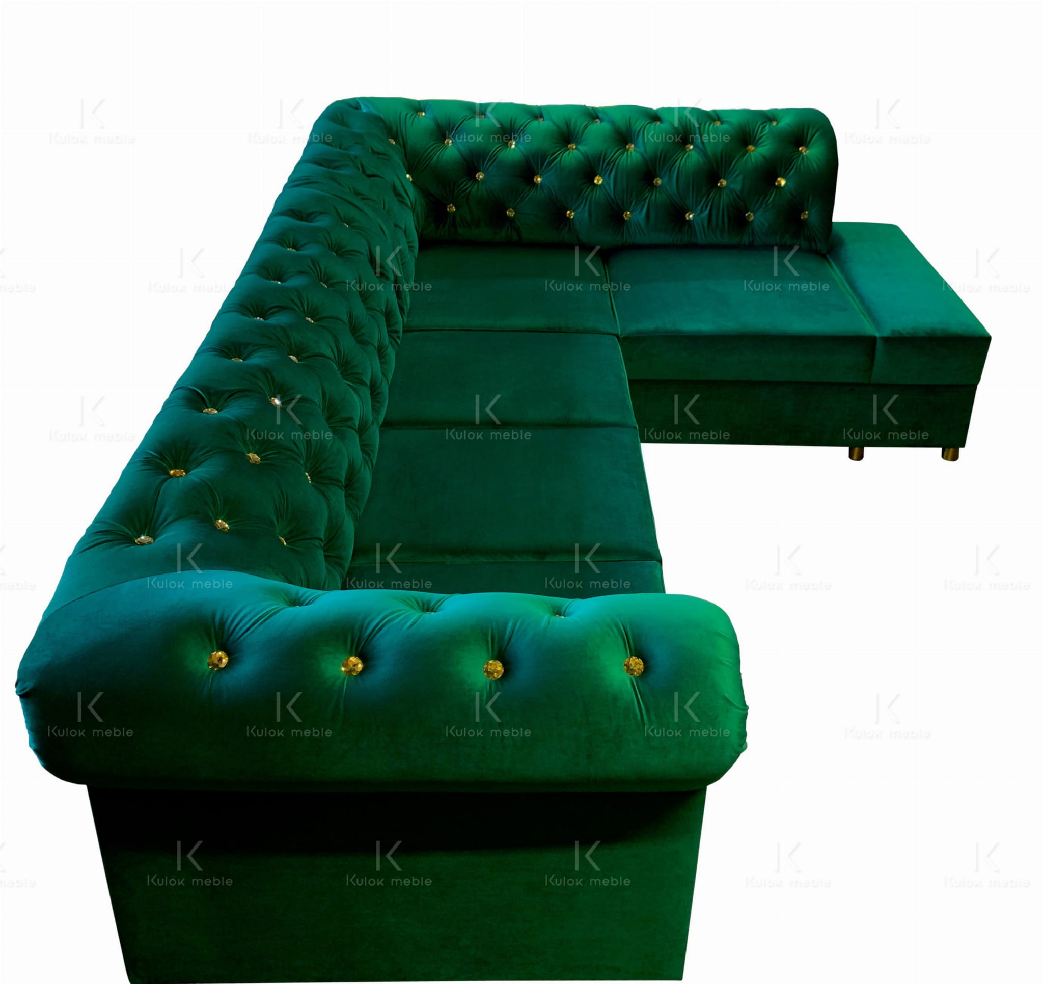 Narożnik Chesterfield Dubai w magicznym odcieniu butelkowej zieleni. Wyjątkowy mebel z funkcją spania, ozdobiony kryształkami Swarovski i złotymi ćwiekami. Oryginalny wzór inspirowany rośliną monstery deliciosy. Komfortowe siedzisko dzięki wysoko elastycznej piance HR i warstwie podtrzymującej z drewna bukowego.