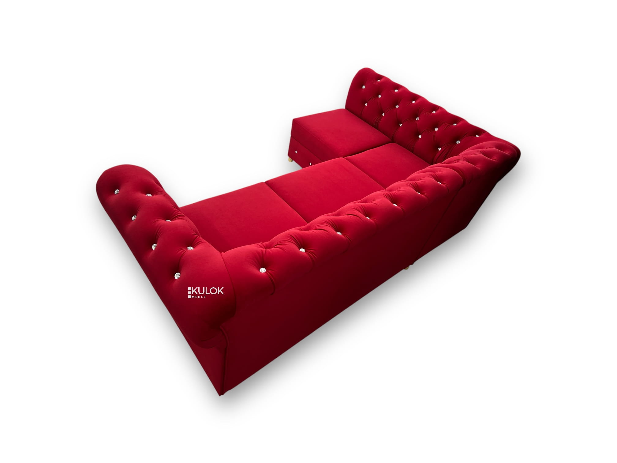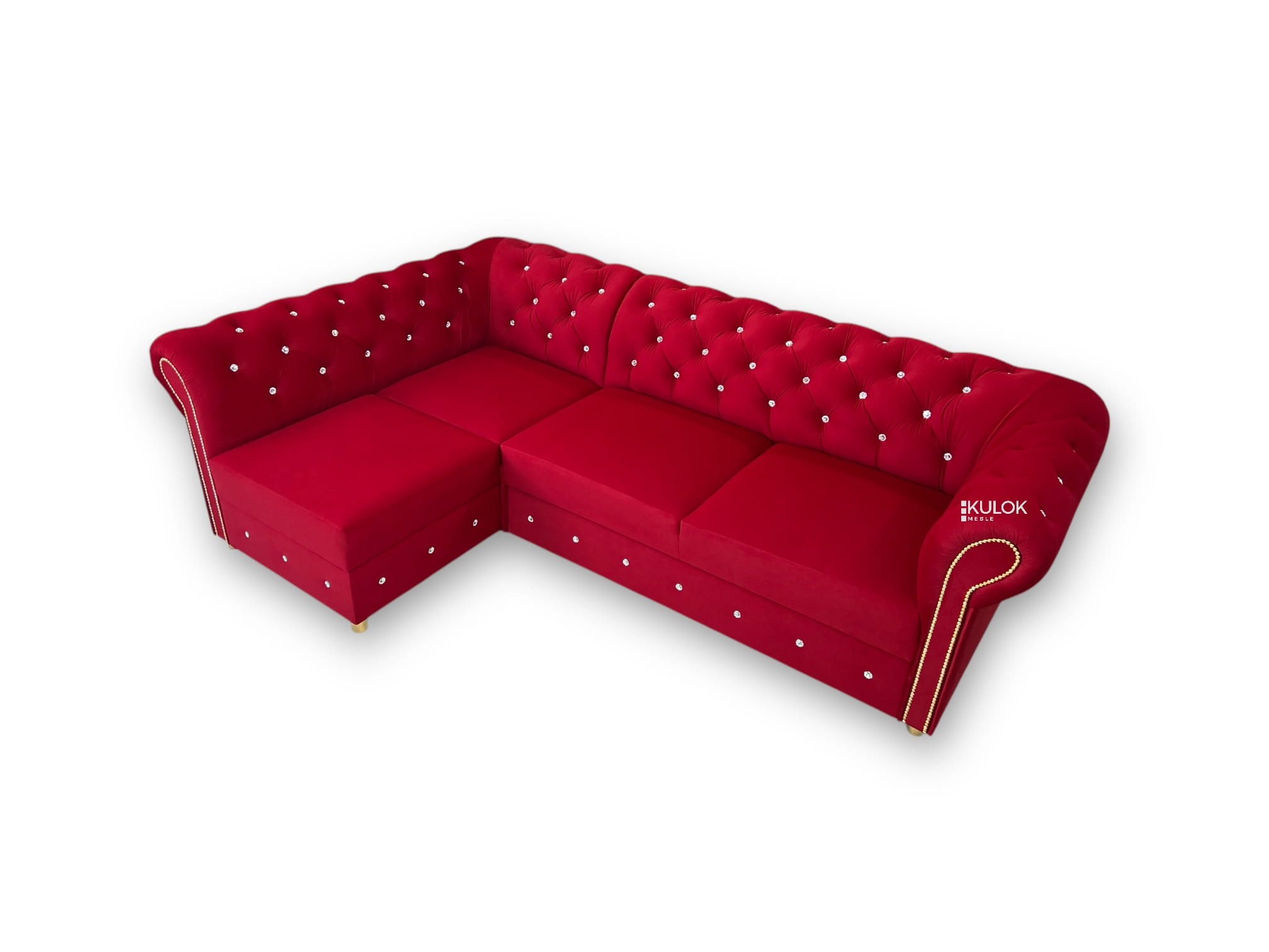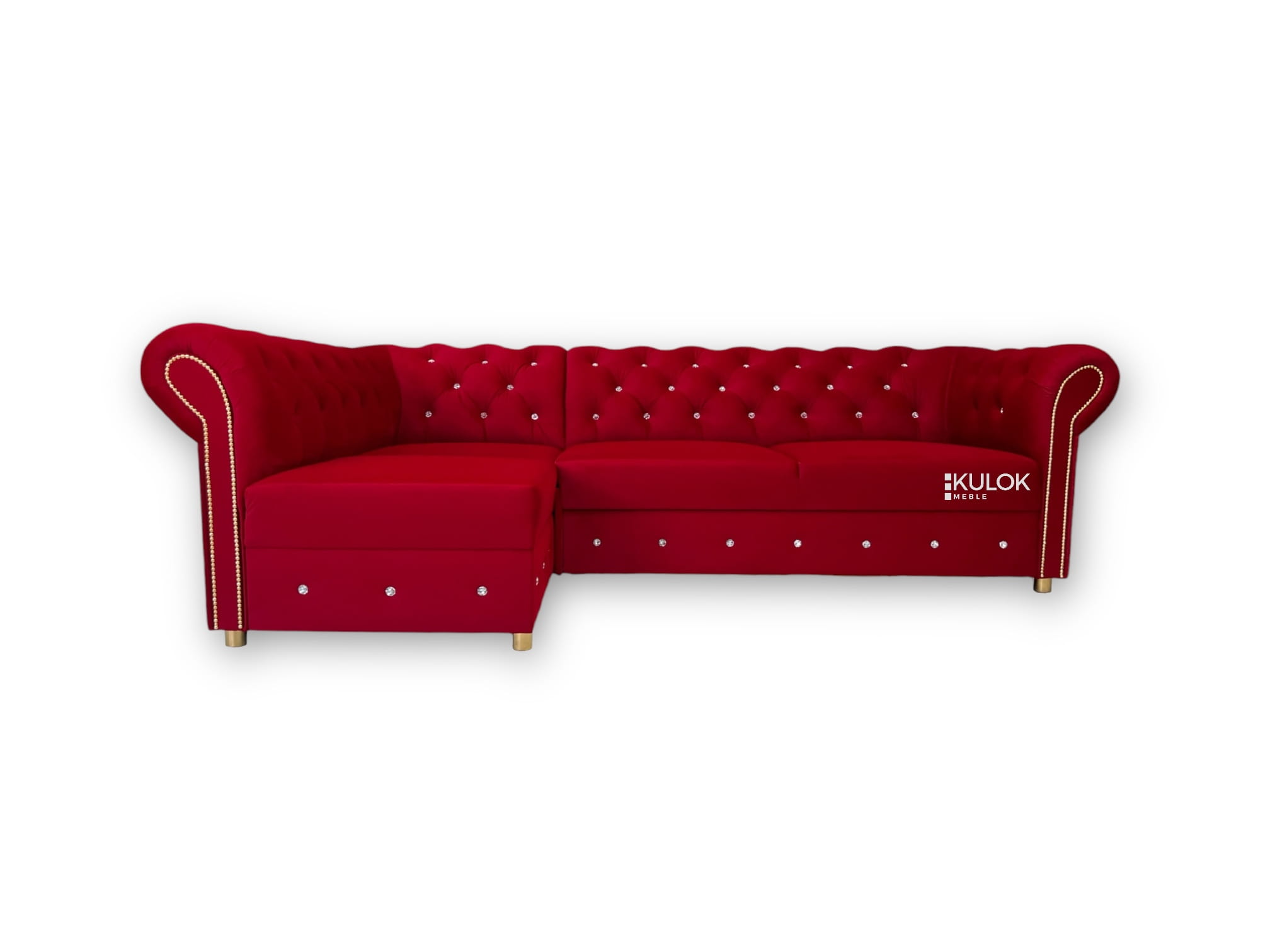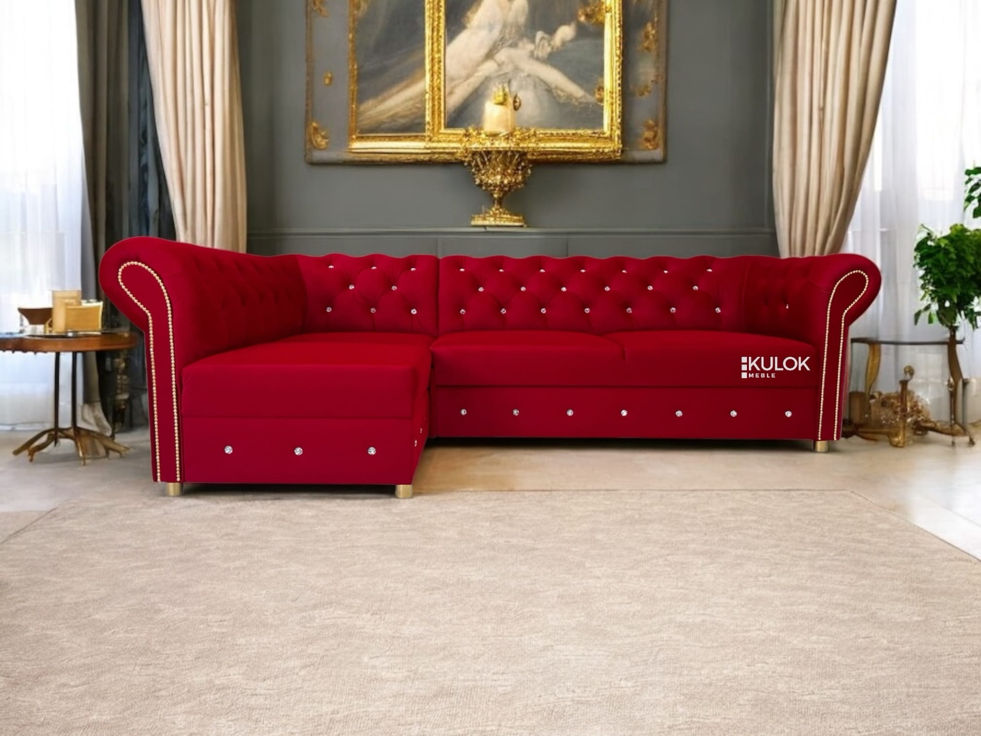 Narożnik Chesterfield Primavera Lewostronny – Królewska Czerwień Glamour z Funkcją Spania