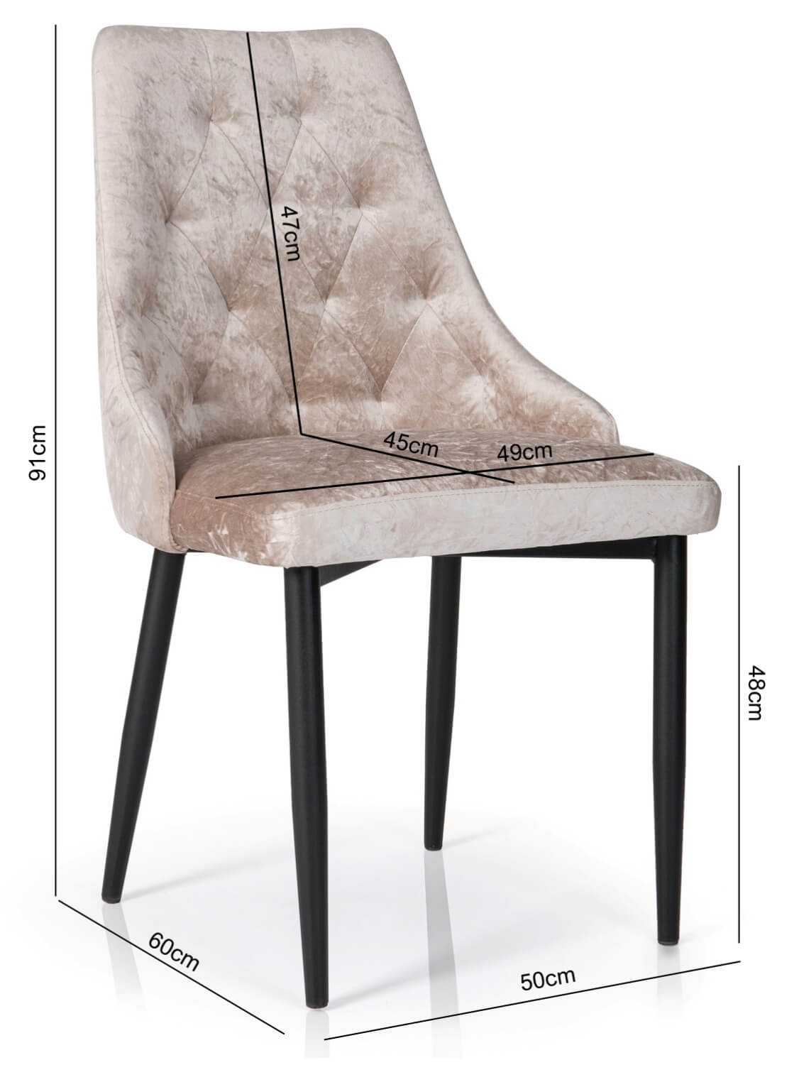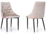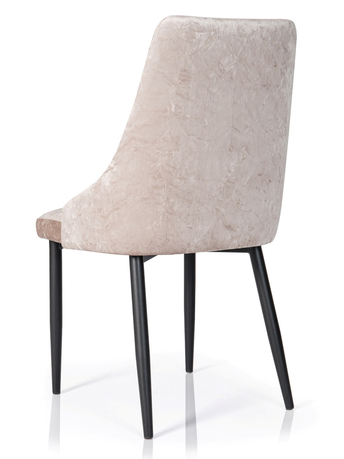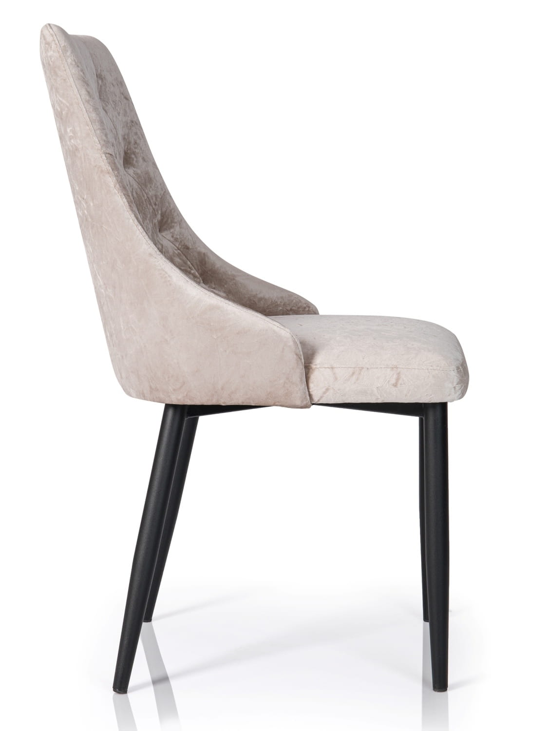 Jakość i wykonanie: Krzesło zostało wykonane z wysokiej jakości materiałów, zapewniając trwałość i komfort użytkowania. Lśniąca tkanina welurowa w beżowym kolorze nadaje krzesłu luksusowego wyglądu, a gustowne pikowanie na oparciu dodaje elegancji. Czarne skośne nogi metalowe nie tylko podkreślają nowoczesny styl, ale także zapewniają stabilność i trwałość.