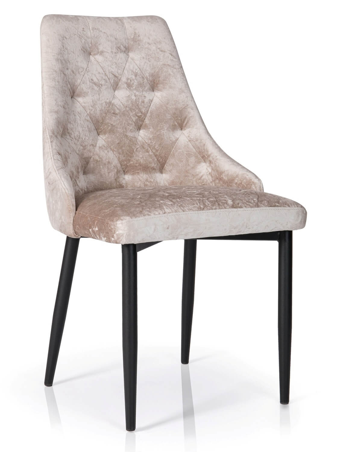 Nowoczesne beżowe kubełkowe krzesło tapicerowane w lśniącej tkaninie welurowej z gustownym pikowaniem na oparciu, na czarnych skośnych nogach metalowych. Idealne do jadalni i salonu.