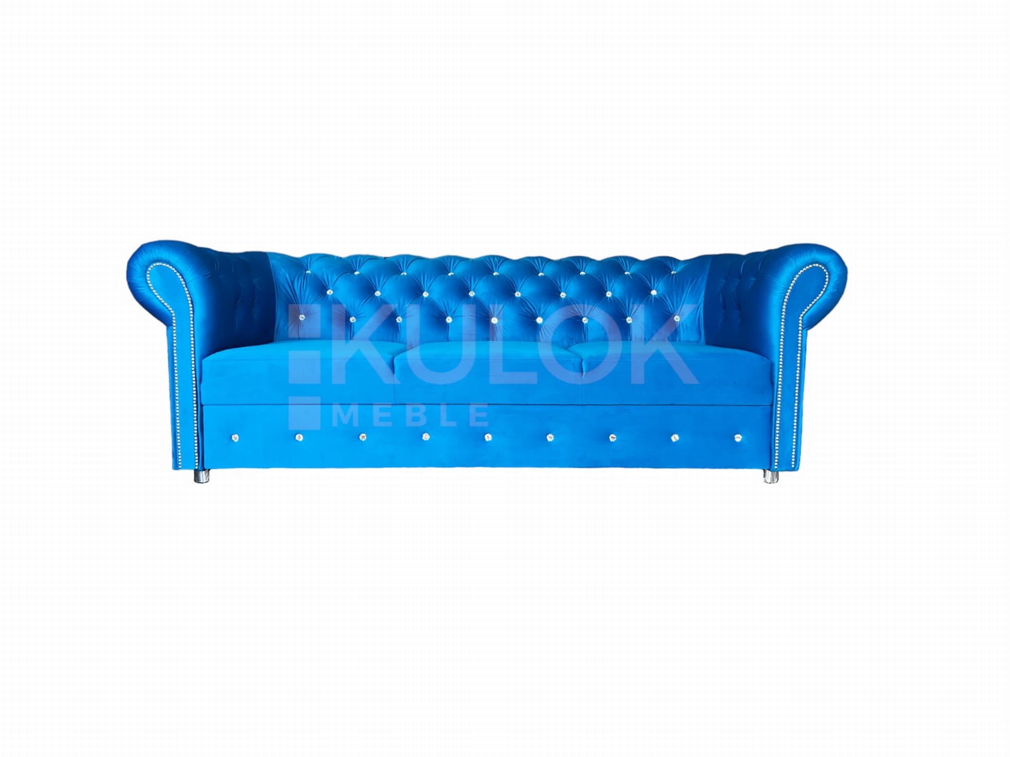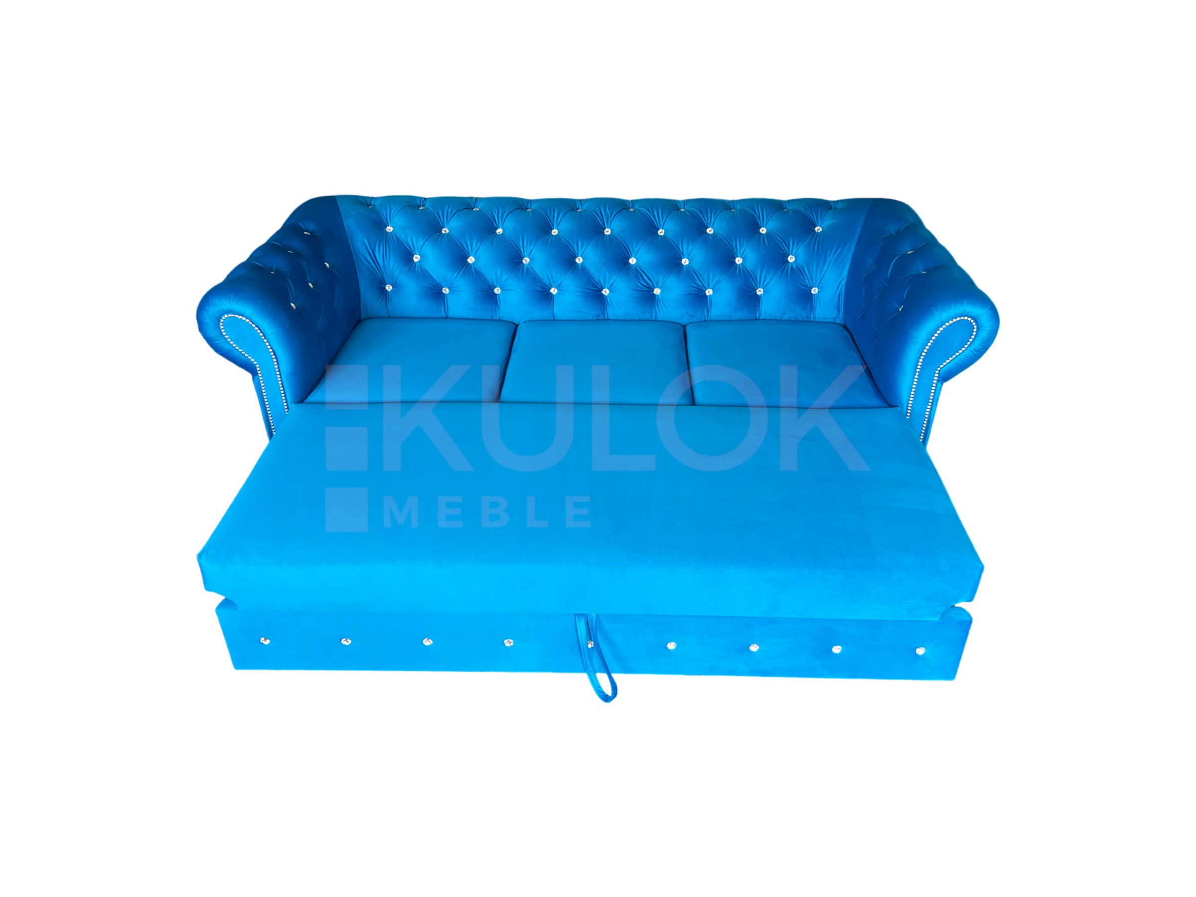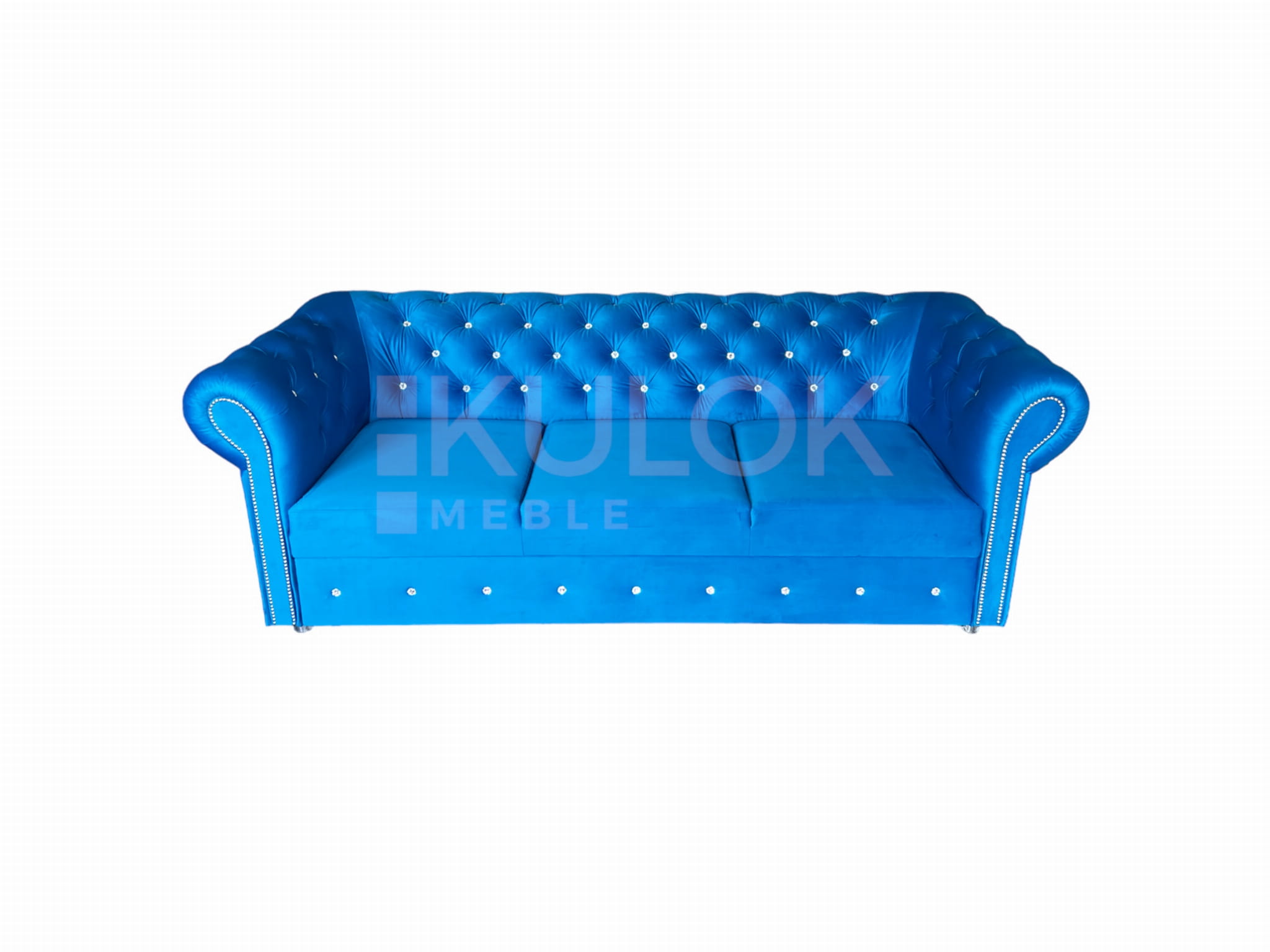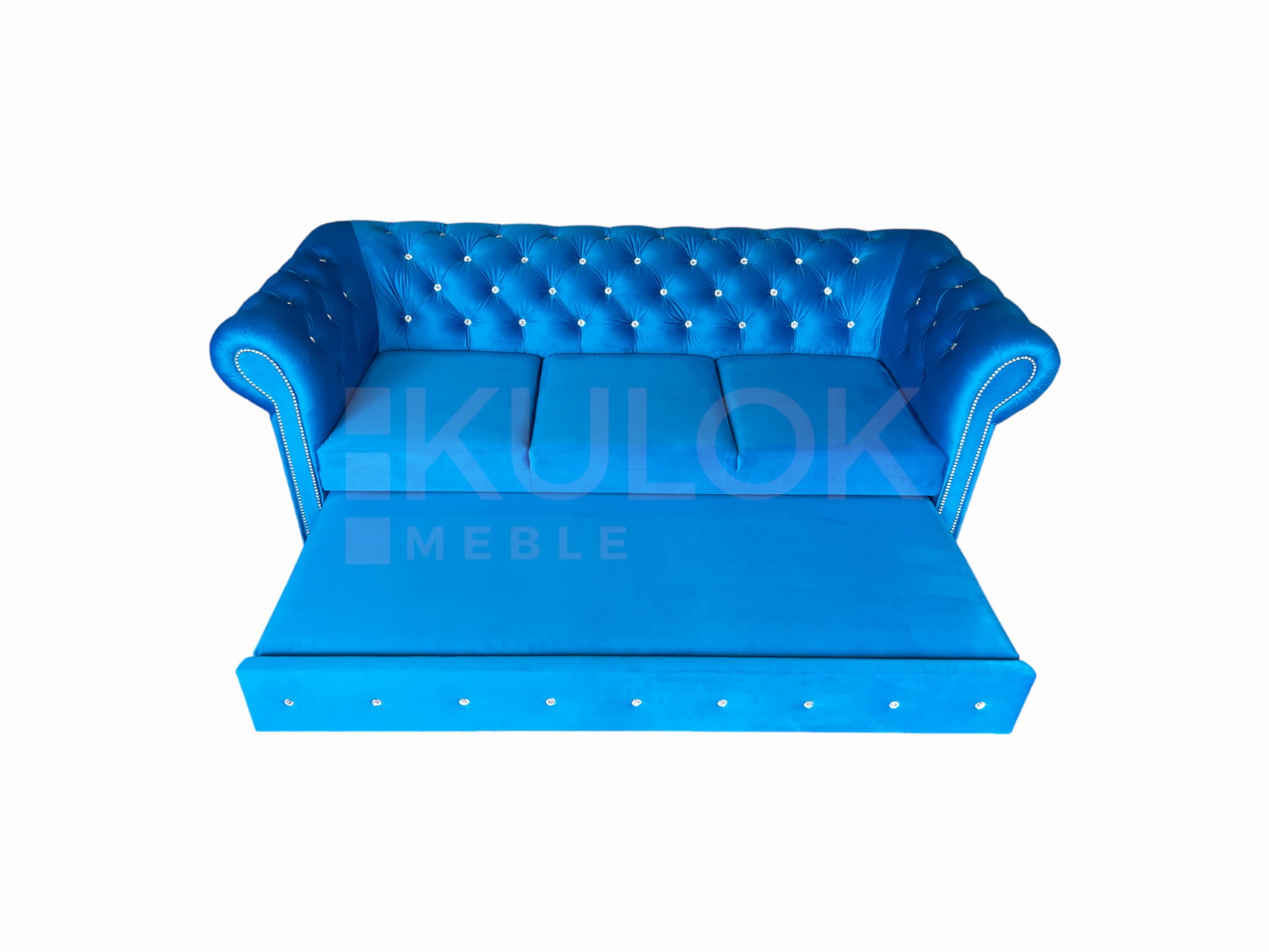 Chesterfield Sofa nowoczesna WARSAW 3 osobowa z funkcją spania błękitna pikowana Kryształkami Swarovski. Tkanina: French Velvet 669 (niebieski, błękit).