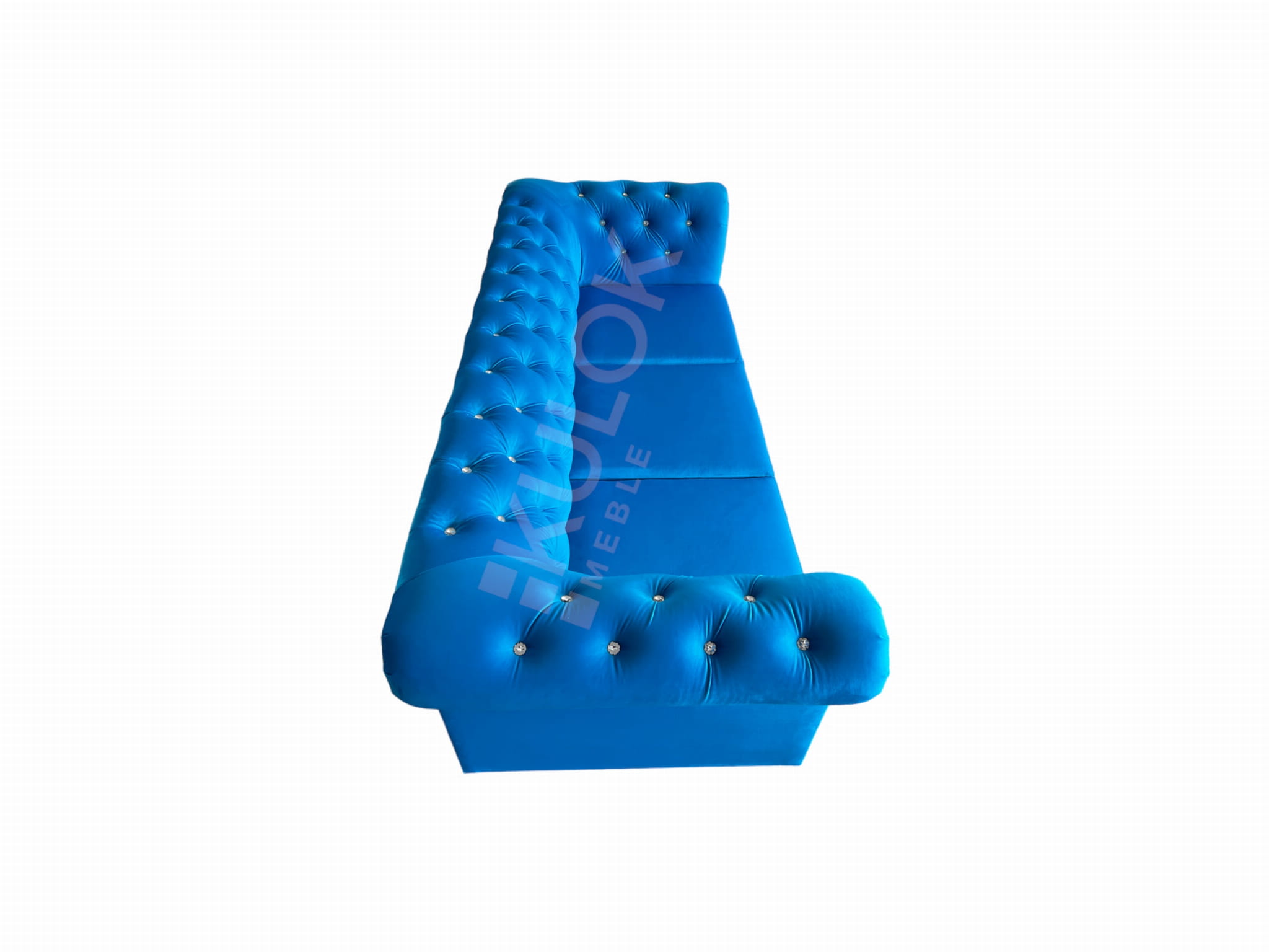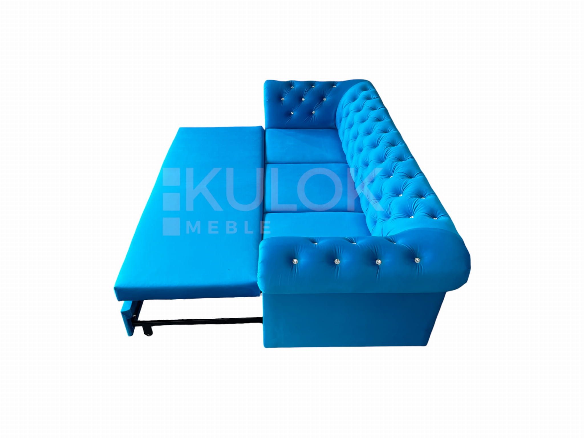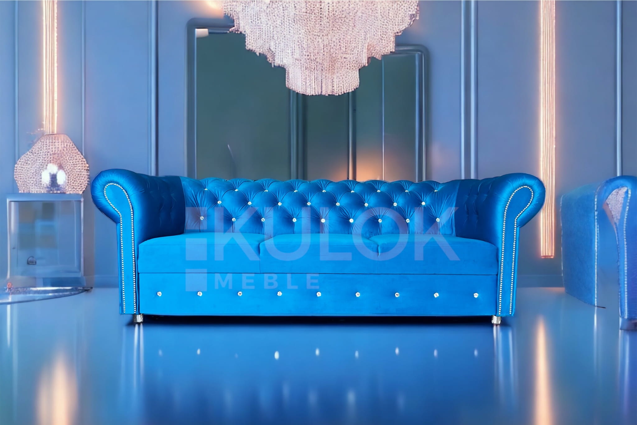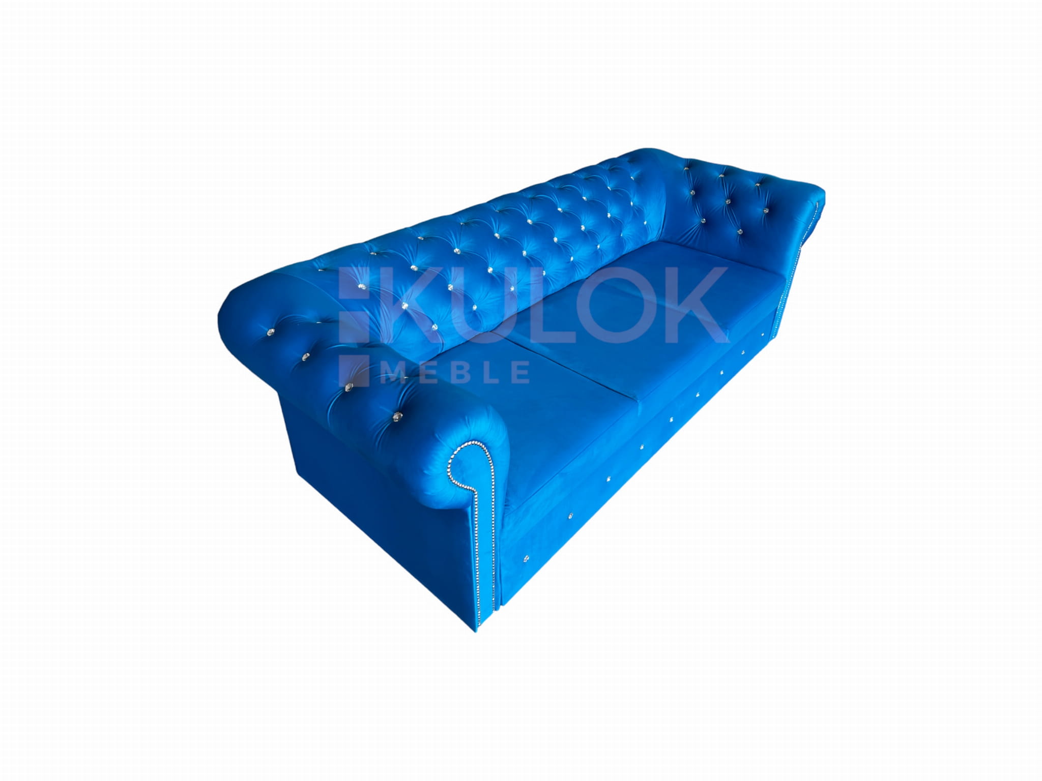 Chesterfield Sofa nowoczesna WARSAW 3 osobowa z funkcją spania błękitna pikowana Kryształkami Swarovski. Tkanina: French Velvet 669 (niebieski, błękit).