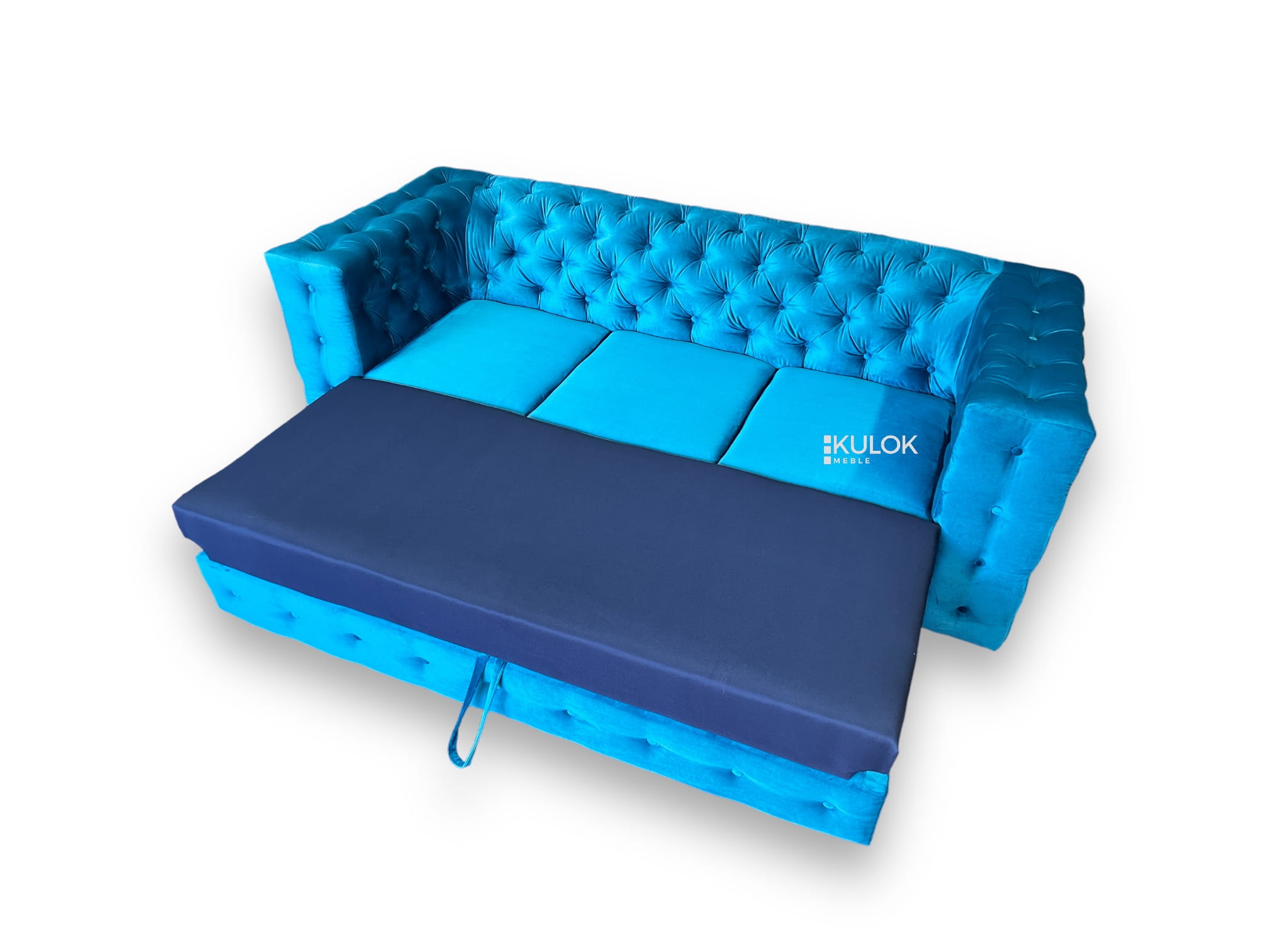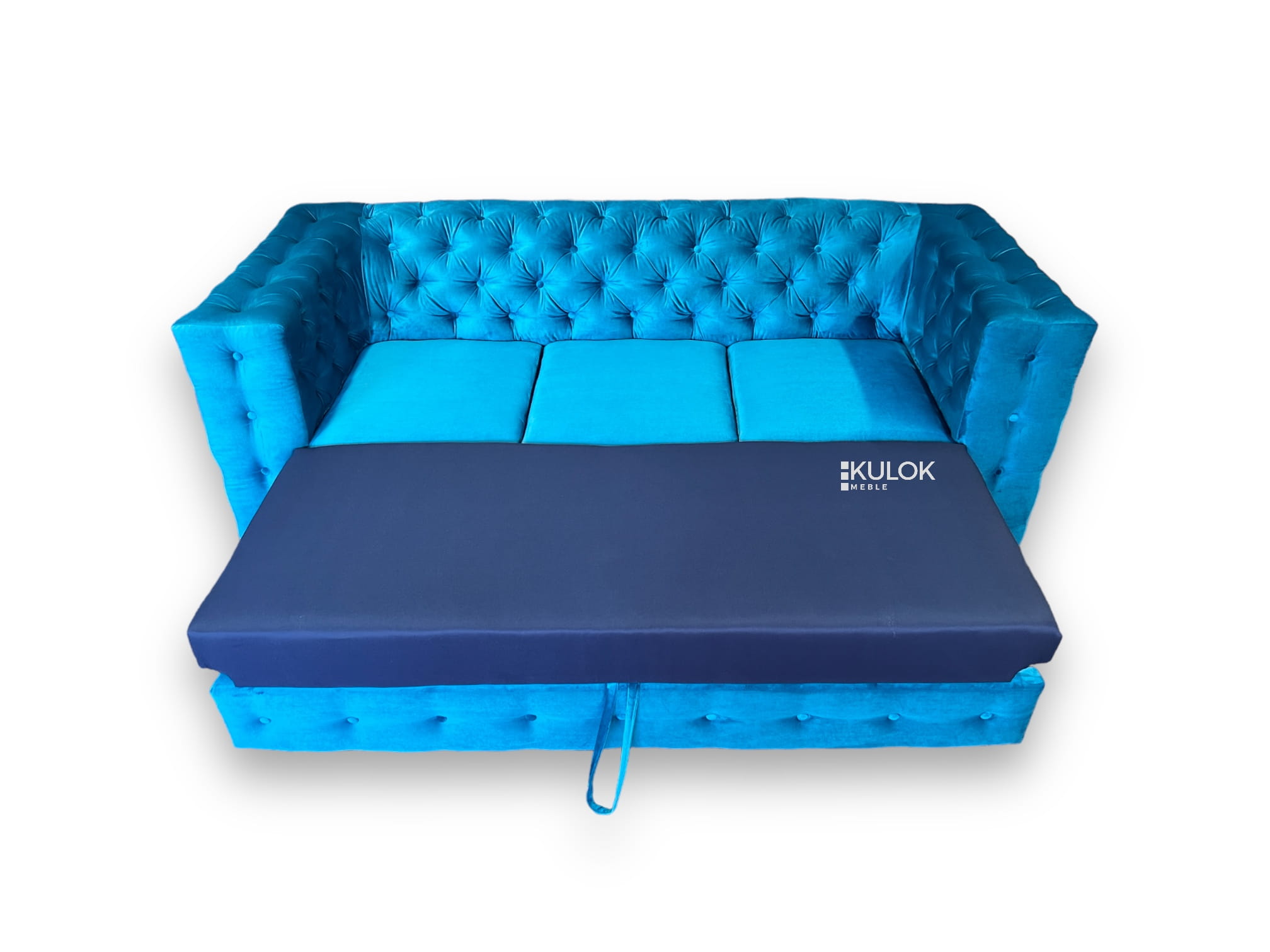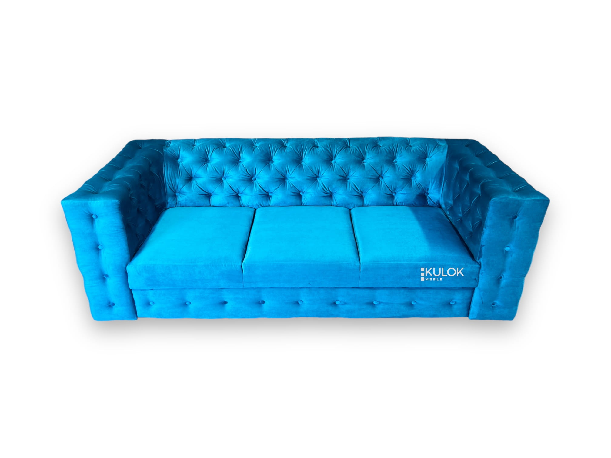 Pikowana kanapa 3 osobowa z funkcją spania niebieski turkusowy Mustang Velvet 25513 guziki nowoczesna do salonu Manchester 230cm