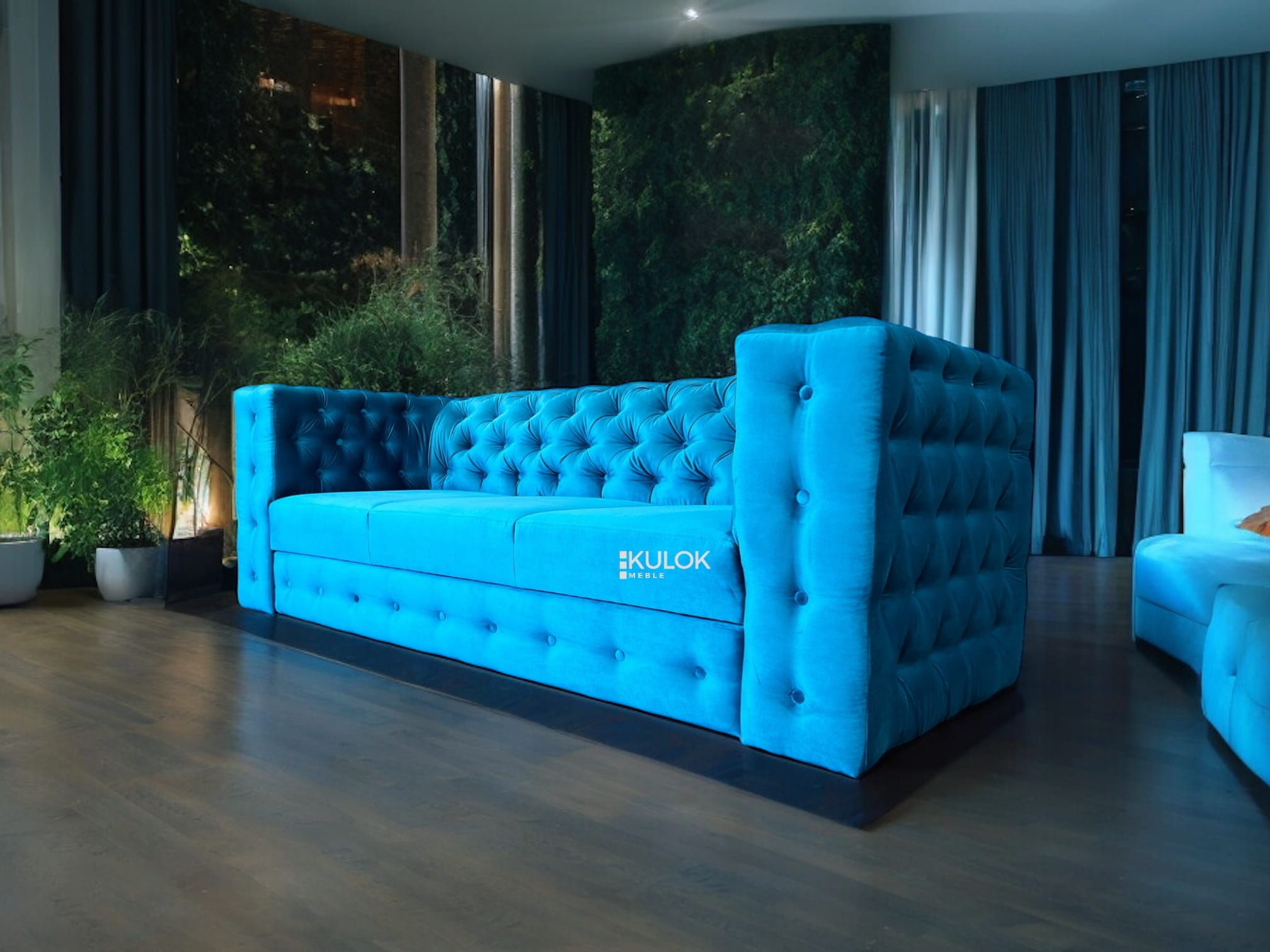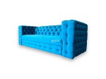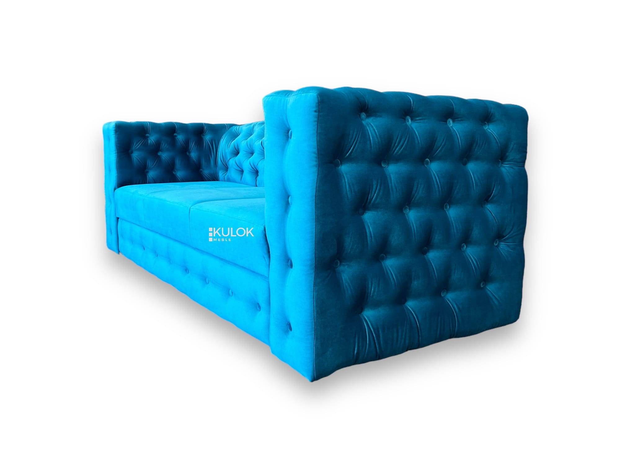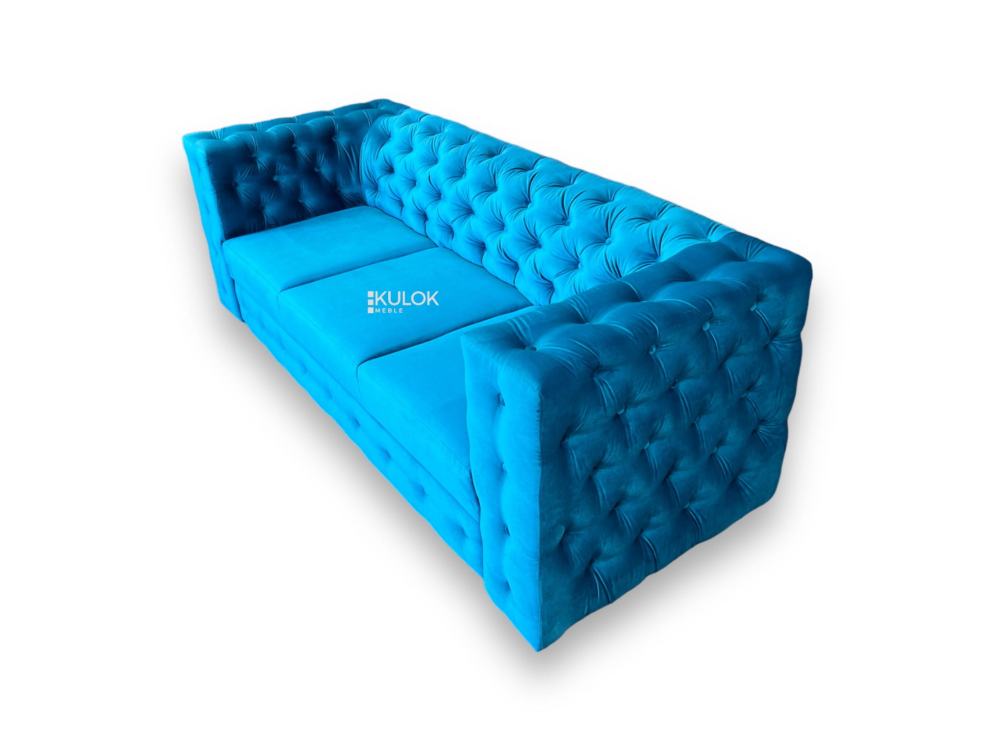 Pikowana kanapa 3 osobowa z funkcją spania niebieski turkusowy Mustang Velvet 25513 guziki nowoczesna do salonu Manchester 230cm