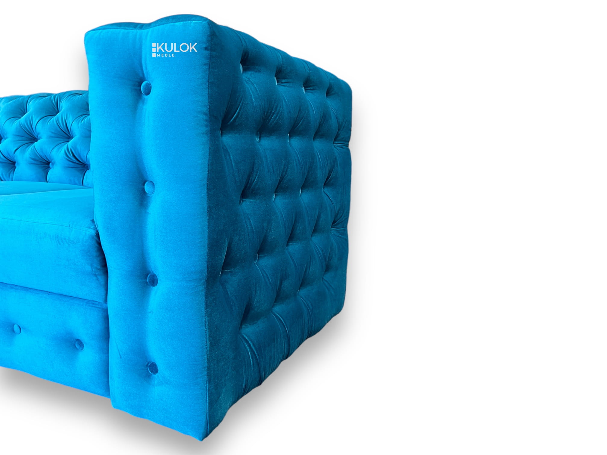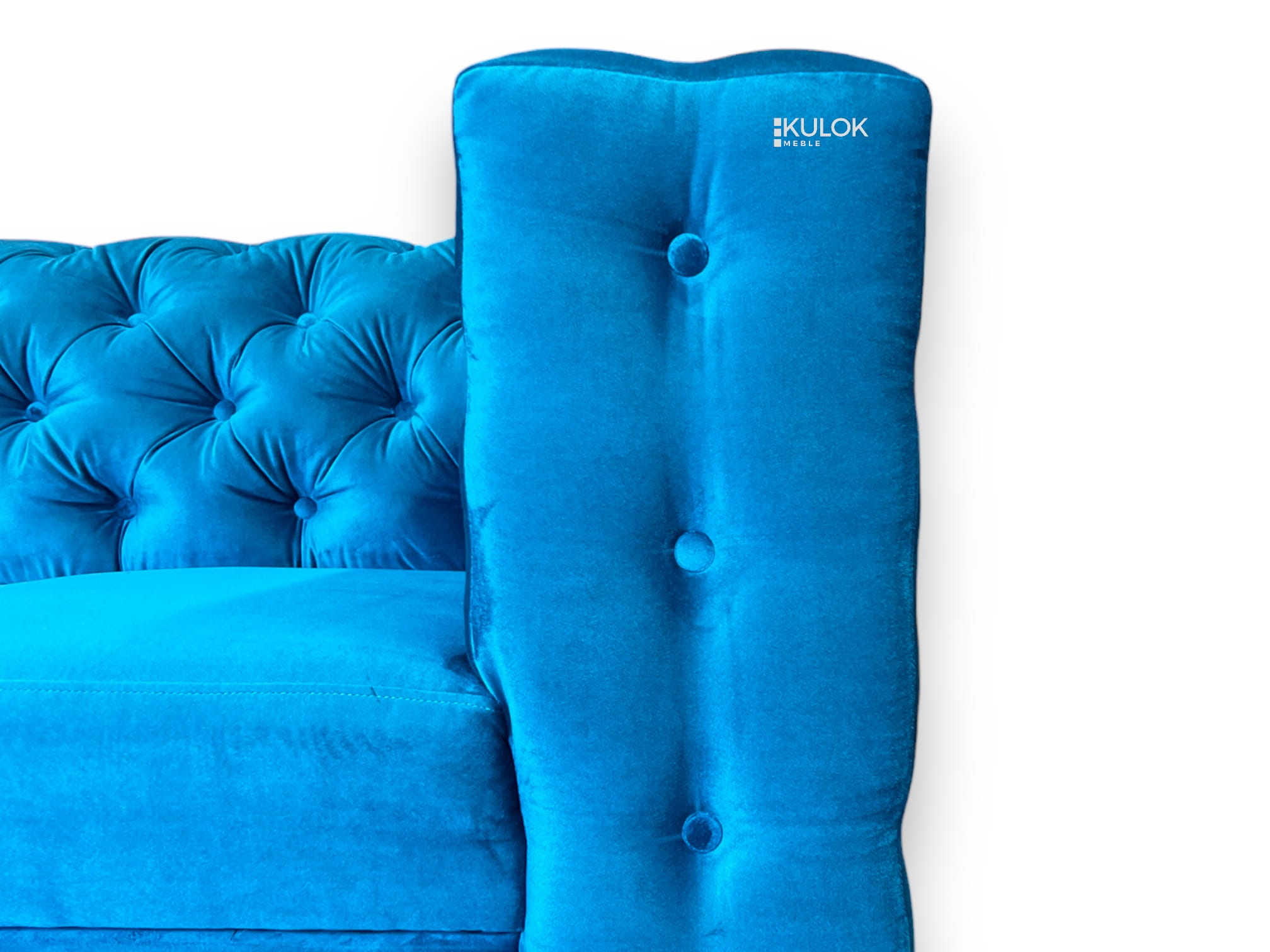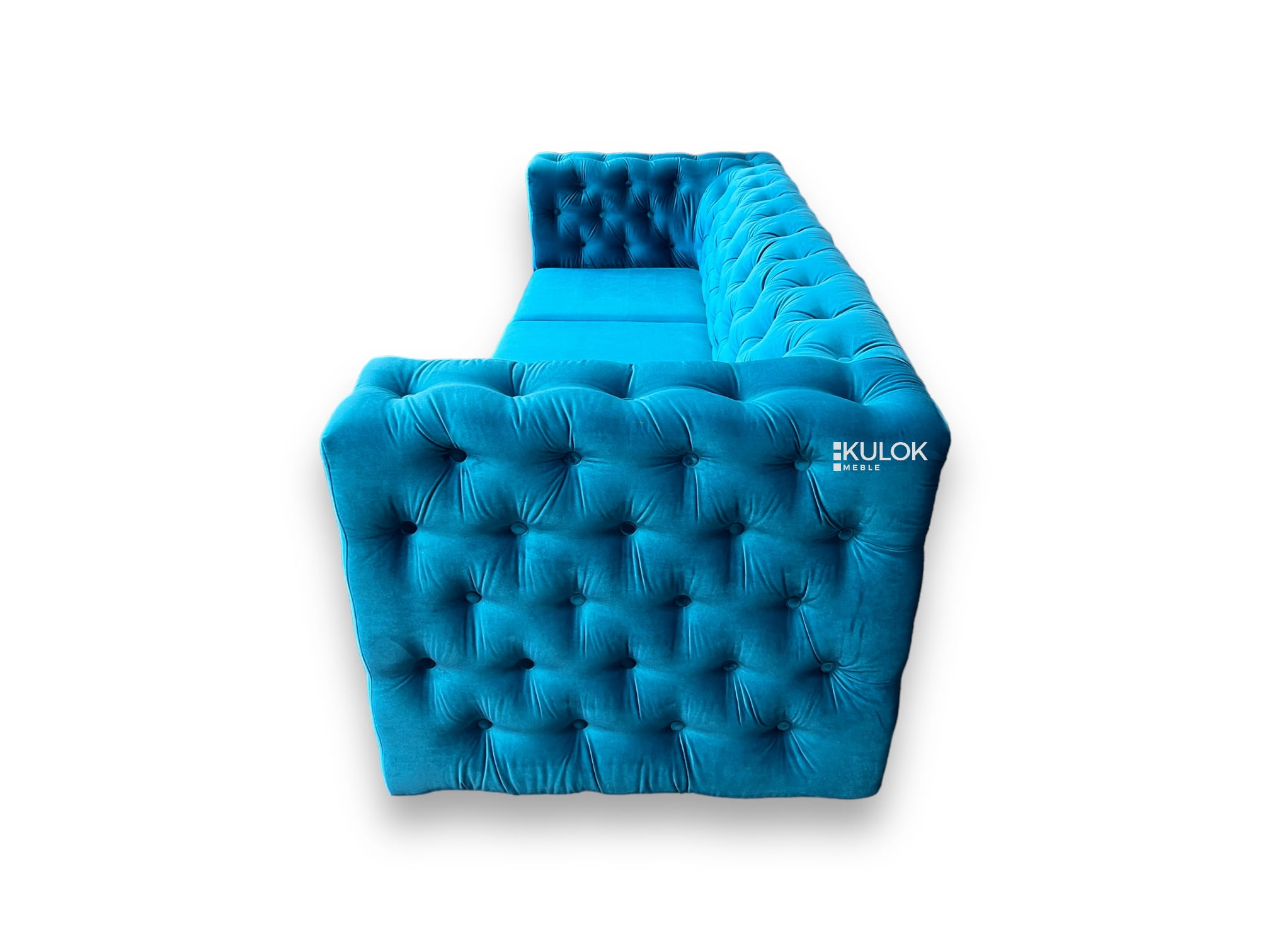 Pikowana kanapa 3-osobowa Manchester dostępna jest w pięknym kolorze niebieski turkusowy. Kolor ten jest świeży i energetyczny, a jednocześnie elegancki i wytworny. Idealnie pasuje do nowoczesnych salonów i wnętrz urządzonych w stylu glamour.