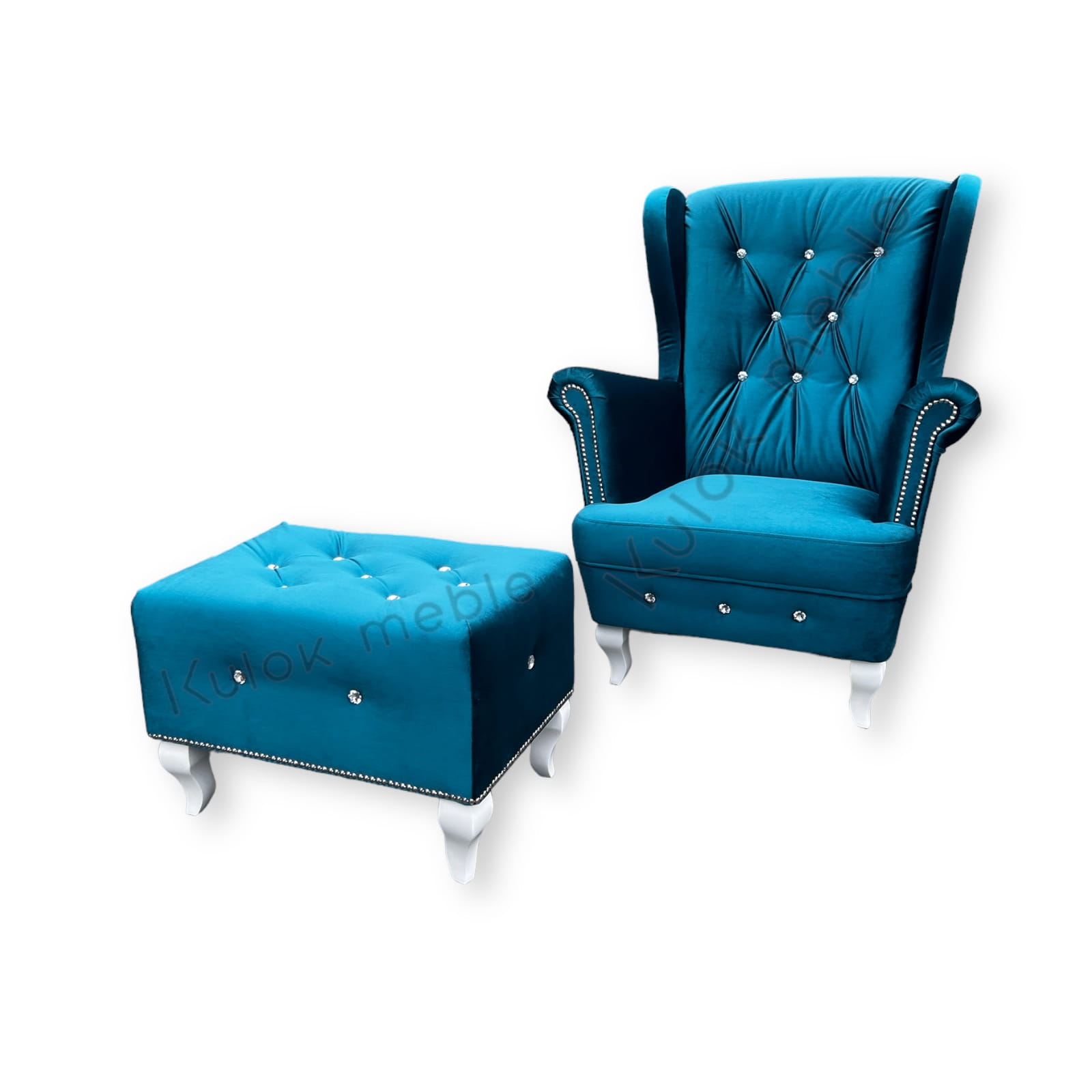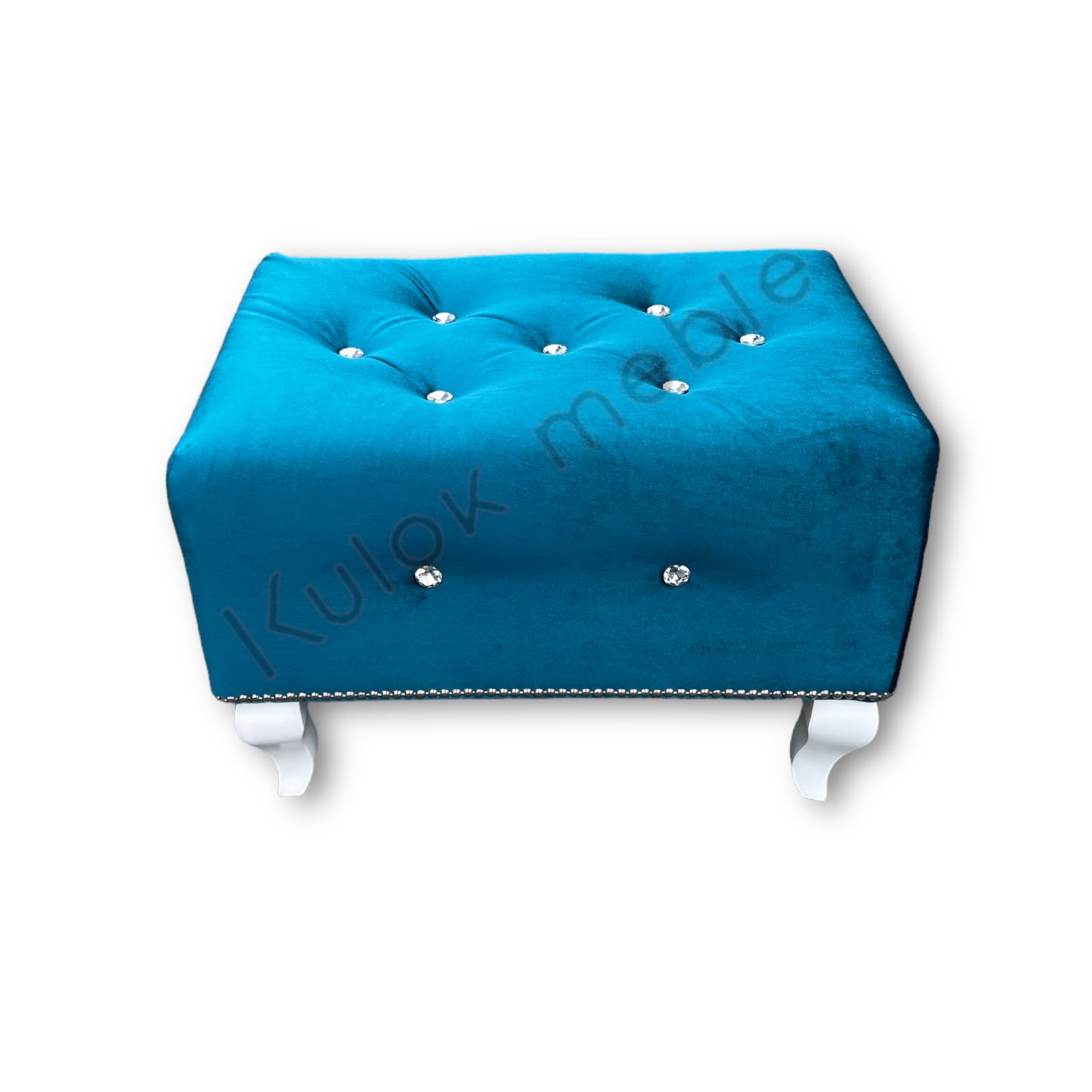 Podnóżek Chesterfield pikowany kryształkami i ćwiekami na białych nogach ludwik w morskim Ikoo 12