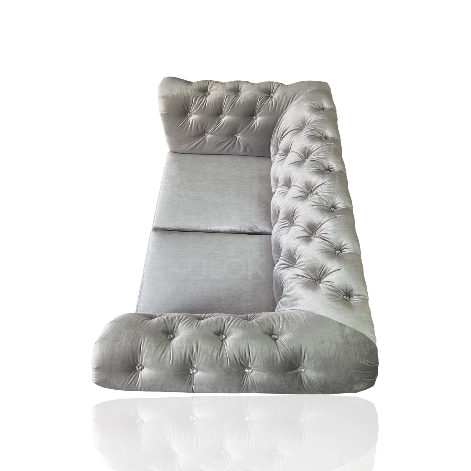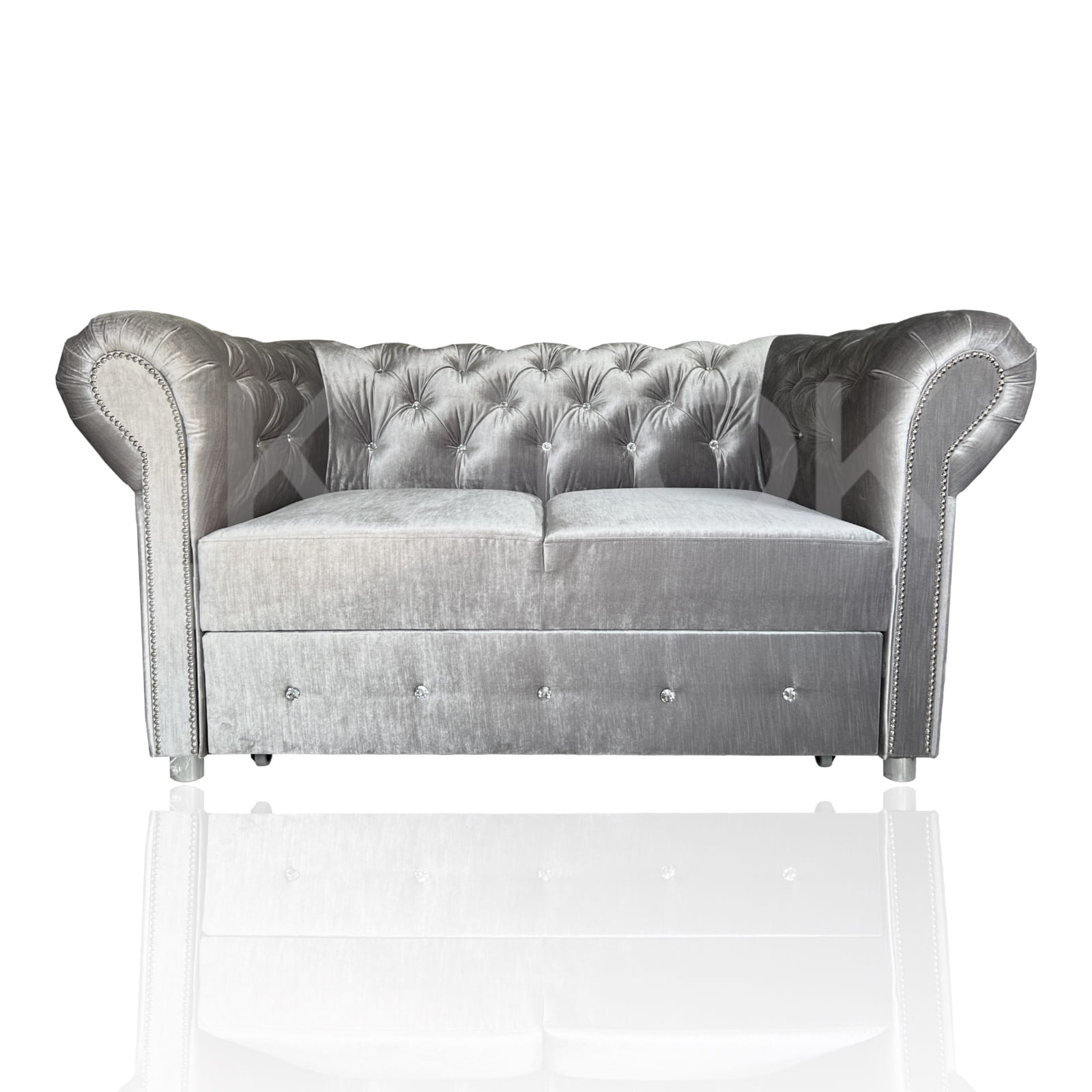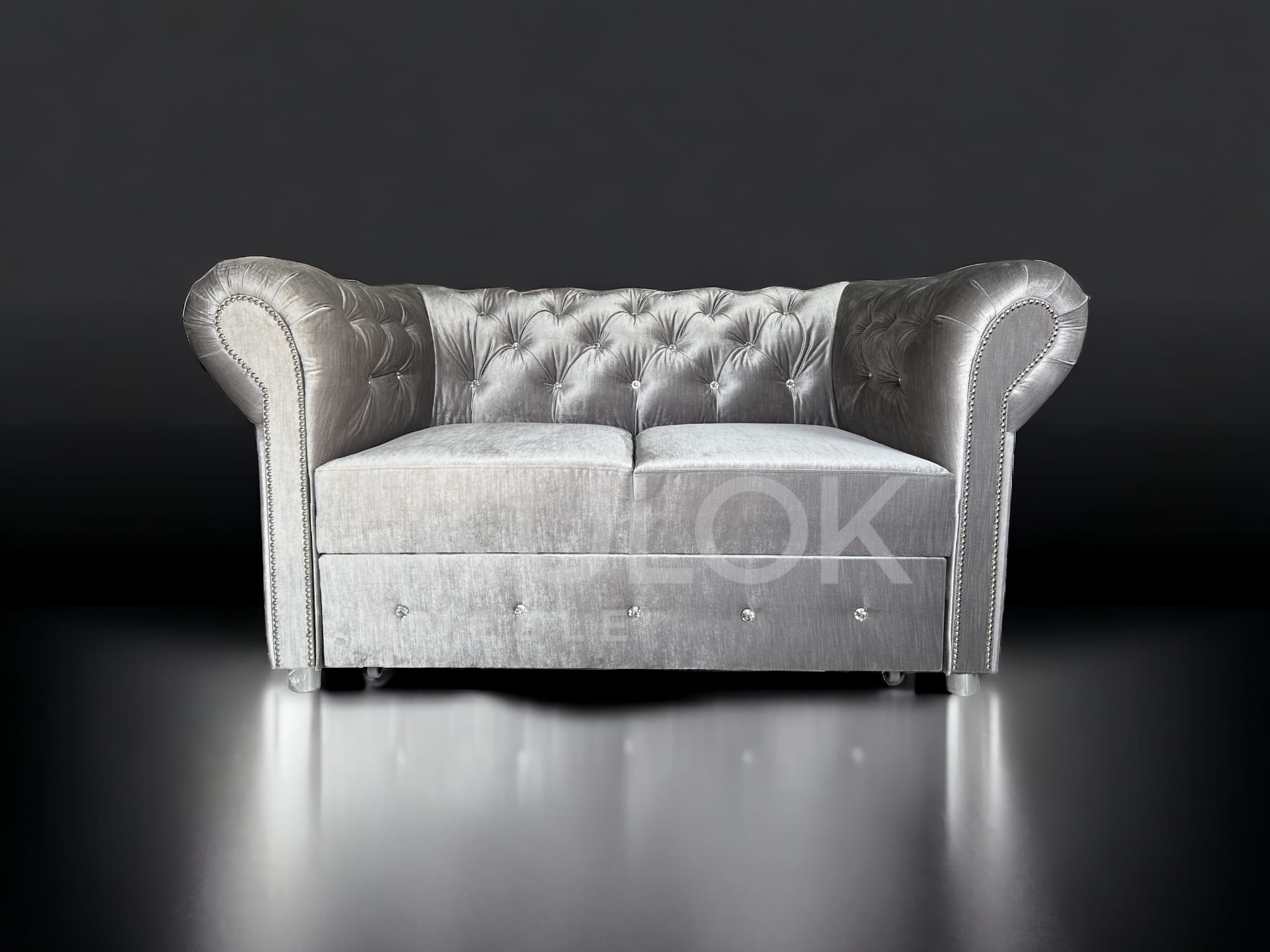 Sofa Glamour Chesterfield dwuosobowa z kamieniami ozdobnymi. Srebrna Sofa w błyszczącej tkaninie Kemer 801. Glamour sofa pikowana kryształami, srebrne nogi chrom, listwy ozdobne srebrne chrom. Sofa glamour 2 osobowa pikowana do salonu na wymiar z funkcją spania lub bez. Mebel tworzony pod wymagania klienta.
