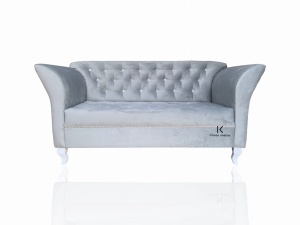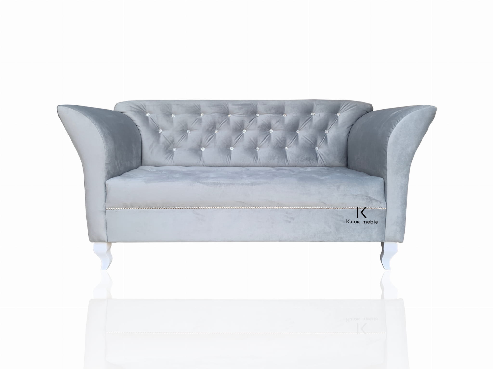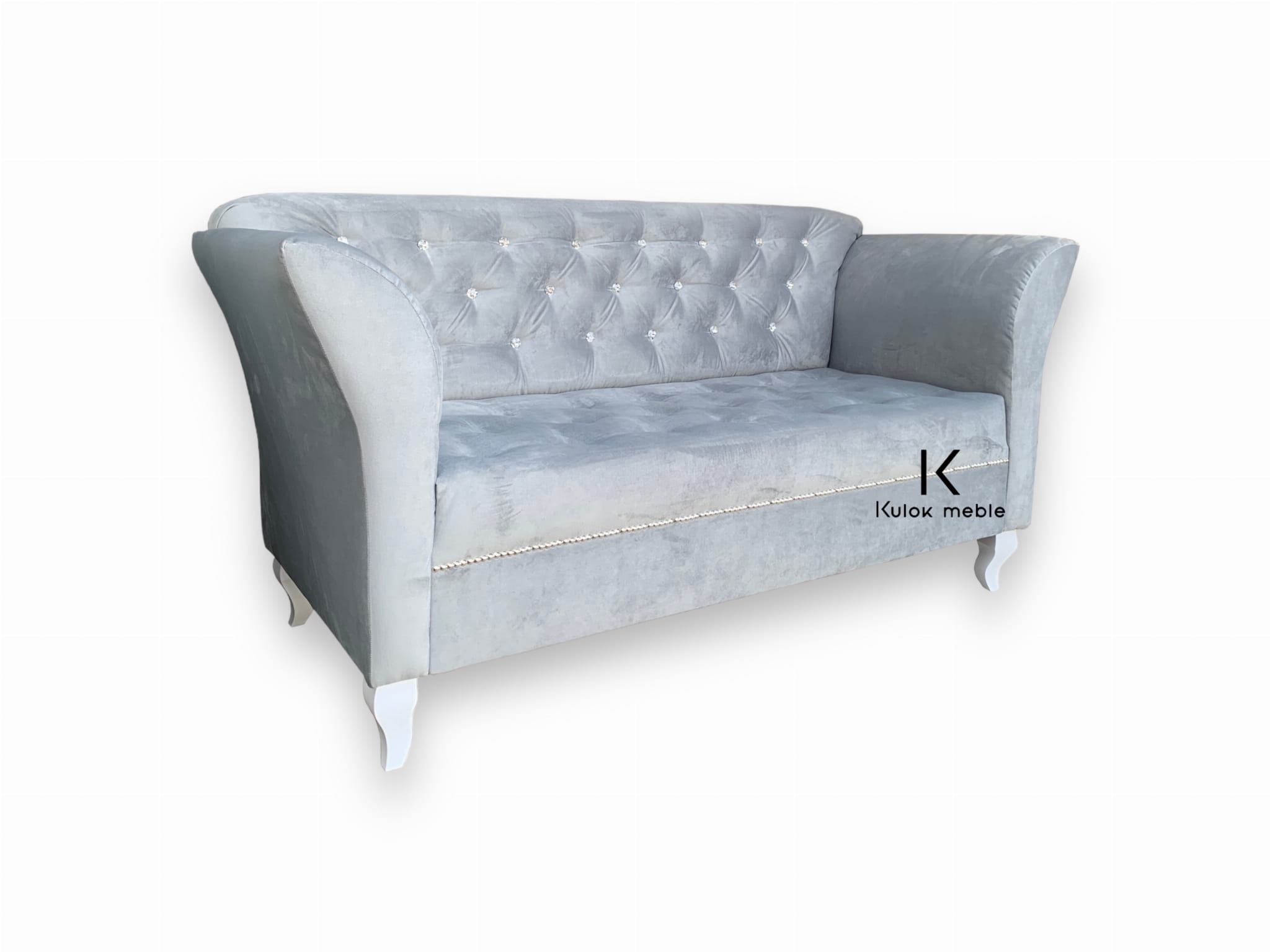 Sofa skandynawska Chester Lux pikowana. Sofa Ludwik białe rzeźbione nogi. Ręcznie pikowana kanapa na wysokim oparciu kryształkami i wygodnym pikowanym siedziskiem guzikami materiałowymi. Miła w dotyku tkanina Prestige 2770 w odcieniu idealnej szarości. Sofa 2 os do salonu glamour od producenta na wymiar. Stylowe kanapy do nowoczesnego skandynawskiego salonu.