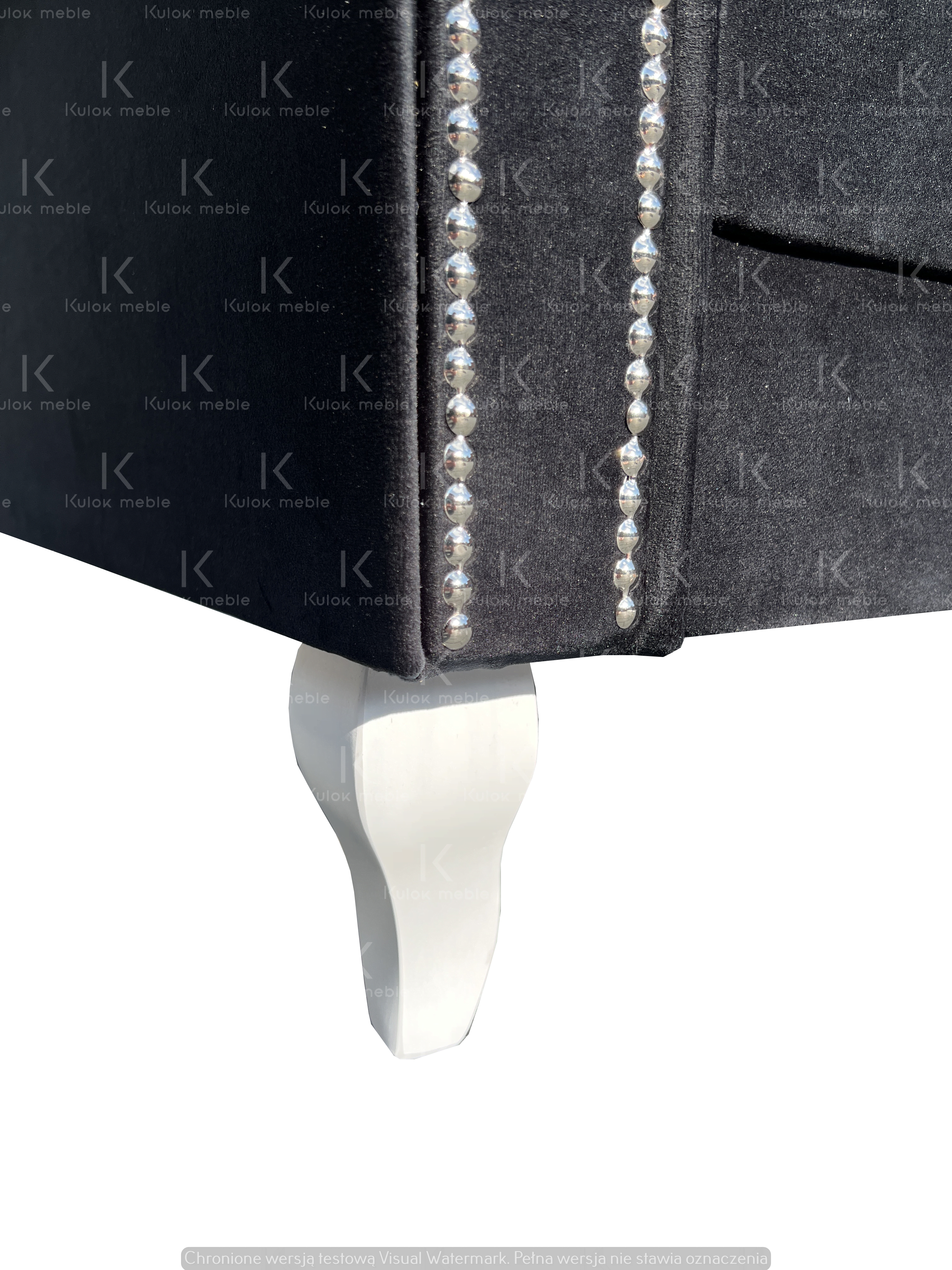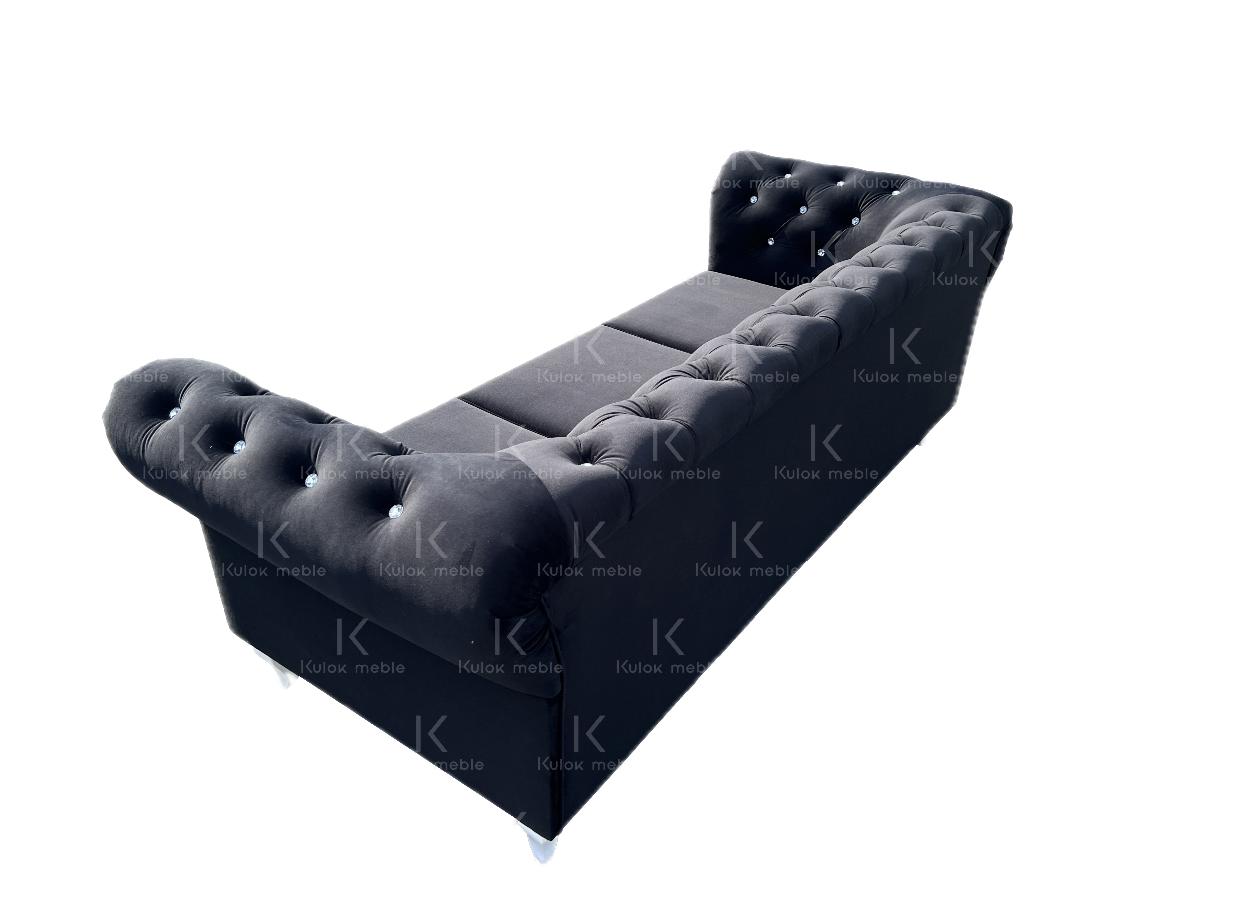 Trzyosobowa sofa chesterfield w czarnym Amor Velvet 4322. Wygodna 3osobowa sofa na wysokich, białych nogach, rzeźbionych w stylu Ludwik. Pikowana głęboko kryształkami Swarovski srebrnymi.