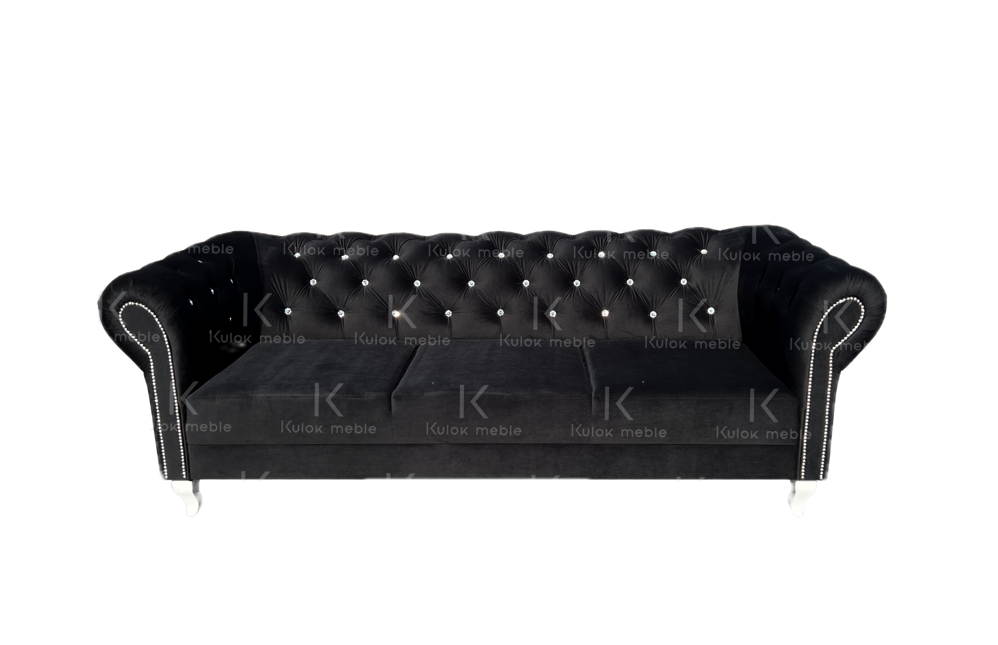 Przedstawiamy Trzyosobową Sofę Chesterfield w czarnym odcieniu Amor Velvet 4322, która stworzona została z myślą o dostarczeniu nie tylko komfortu, ale także niesamowitego luksusu do Twojego salonu. Sofa ta prezentuje się niezwykle elegancko dzięki głębokiemu pikowaniu, które ozdobione zostało kryształkami Swarovski, nadającymi jej subtelny blask. Czarna tkanina Amor Velvet 4322 tworzy efektowny kontrast z białymi nogami, rzeźbionymi w stylu Ludwik, nadającymi sofie wyjątkowy charakter. Ta trzyosobowa sofa nie tylko zachwyca swoim wyglądem, ale również zapewnia wygodę dzięki solidnej konstrukcji. To doskonałe rozwiązanie dla tych, którzy pragną wprowadzić do swojego wnętrza niepowtarzalny klimat luksusu i elegancji.