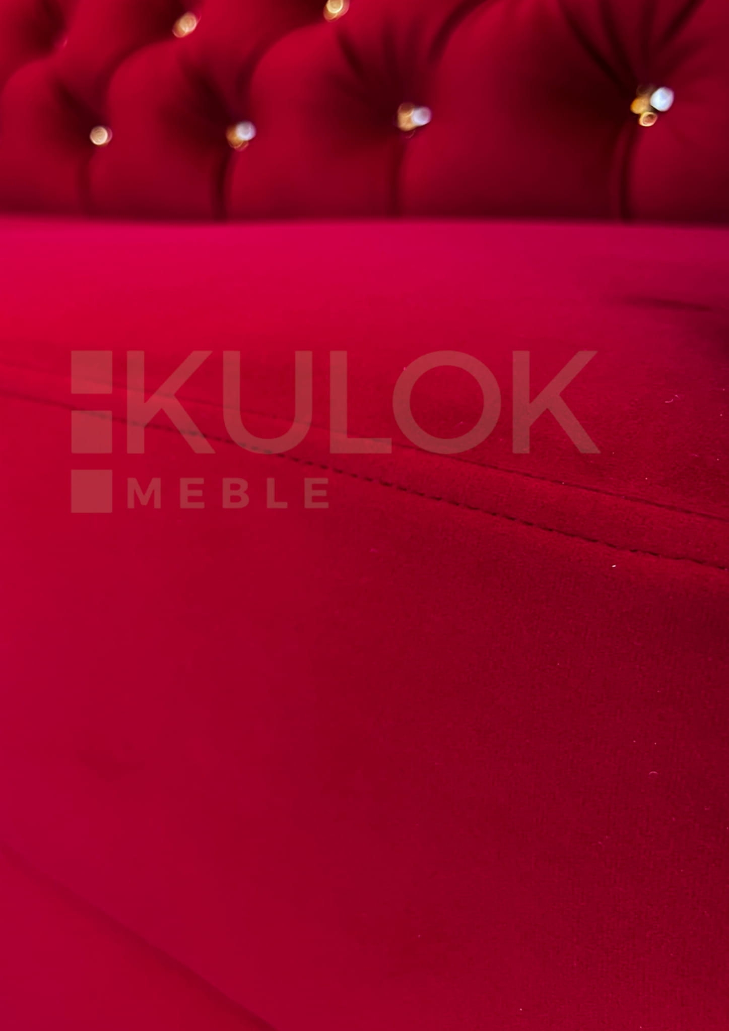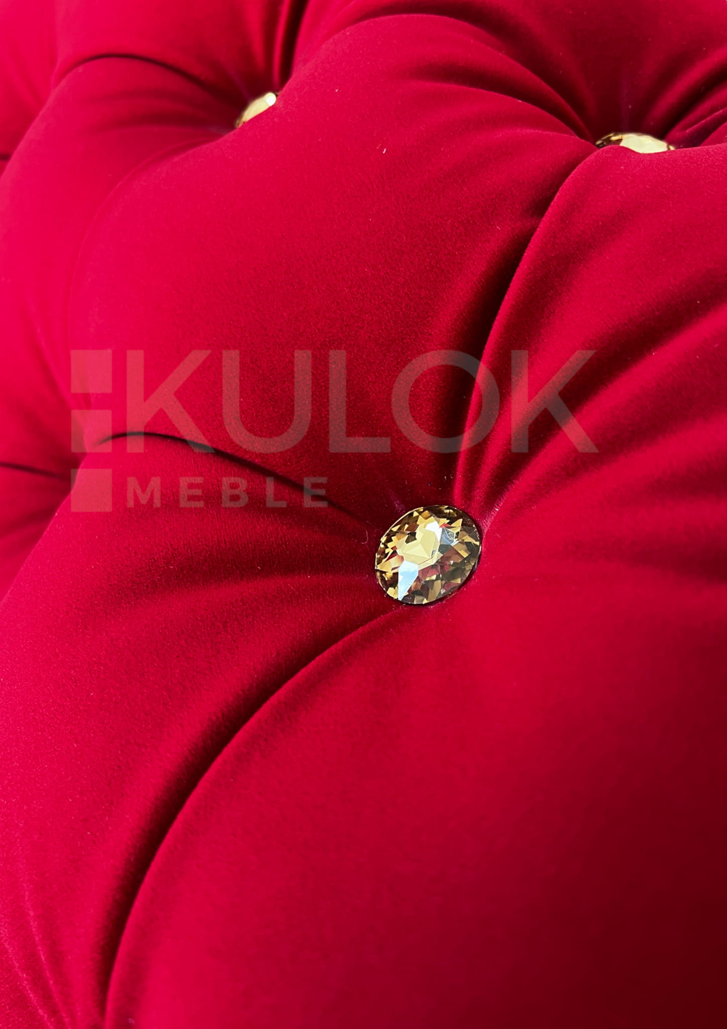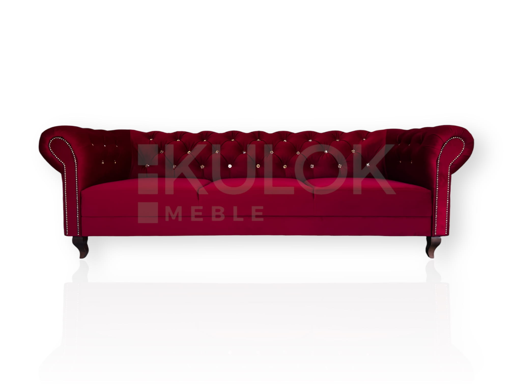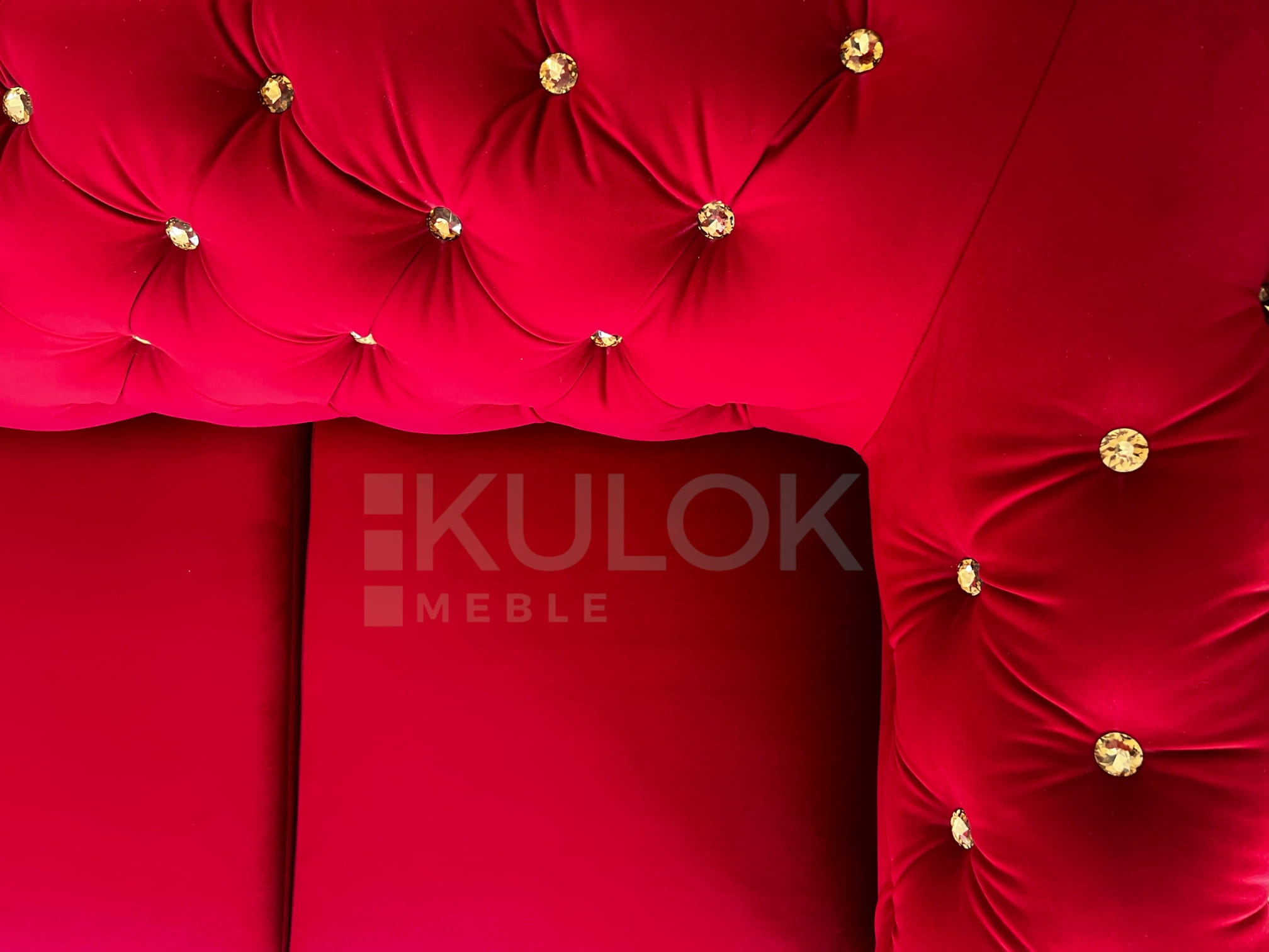 Trzyosobowa Sofa Chesterfield w Królewskiej Czerwieni to prawdziwe dzieło sztuki, łączące w sobie wyjątkowy design i komfort użytkowania. Oparta na solidnej konstrukcji, ta sofa prezentuje się niezwykle imponująco dzięki intensywnej czerwieni tkaniny Venus Velvet 2926. Pikowanie, głęboko osadzone kryształkami Swarovski w odcieniach złota-brązu, nadaje meblowi niepowtarzalnego blasku. Wysokie, rzeźbione w stylu Ludwik orzechowe nogi stanowią nie tylko solidne podparcie, ale także elegancką ozdobę. Czerwona sofa z dodatkami złota to wyjątkowa kompozycja, która podkreśla luksus i finezję każdego wnętrza. Nierozkładana sofa oferuje nie tylko styl, ale także wygodę, sprawiając, że jest idealnym miejscem do relaksu. Wysoka jakość wykonania gwarantuje trwałość i zadowolenie z użytkowania. Pozwól tej sofy podkreślić wyjątkowy charakter Twojego salonu i wprowadzić do niego atmosferę królewskiego luksusu.