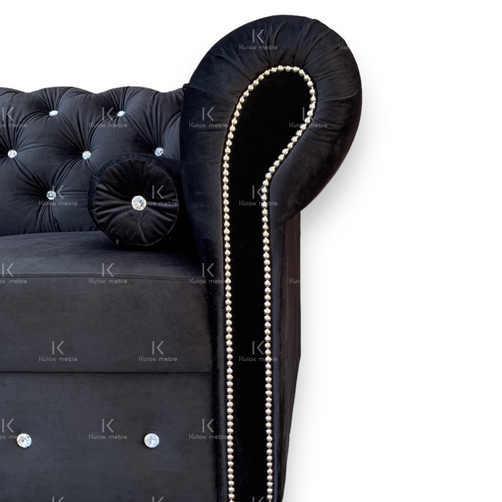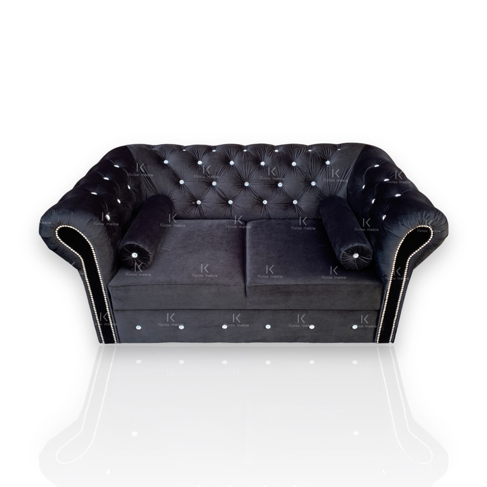 Sofka Glamour Chesterfield dwuosobowa. Czarna sofa w tkaninie: Magic Velvet 2219. Glamour sofa pikowana kryształami, srebrne nogi chrom, listwy ozdobne srebrne chrom. Sofa glamour 2 osobowa pikowana do salonu na wymiar.