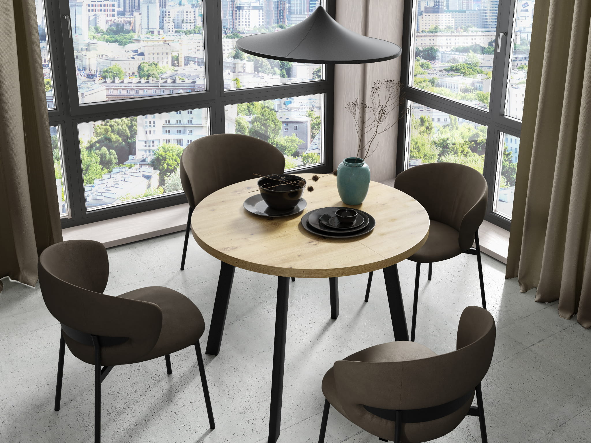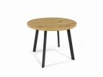 Okrągły blat o średnicy 100cm tworzy przytulną atmosferę wokół stołu. Dwie praktyczne wkładki po 38 cm każda pozwalają na elastyczne dostosowanie długości stołu do liczby gości, rozkładając go aż do 176cm. To doskonałe rozwiązanie dla rodzinnych spotkań czy przyjęć.