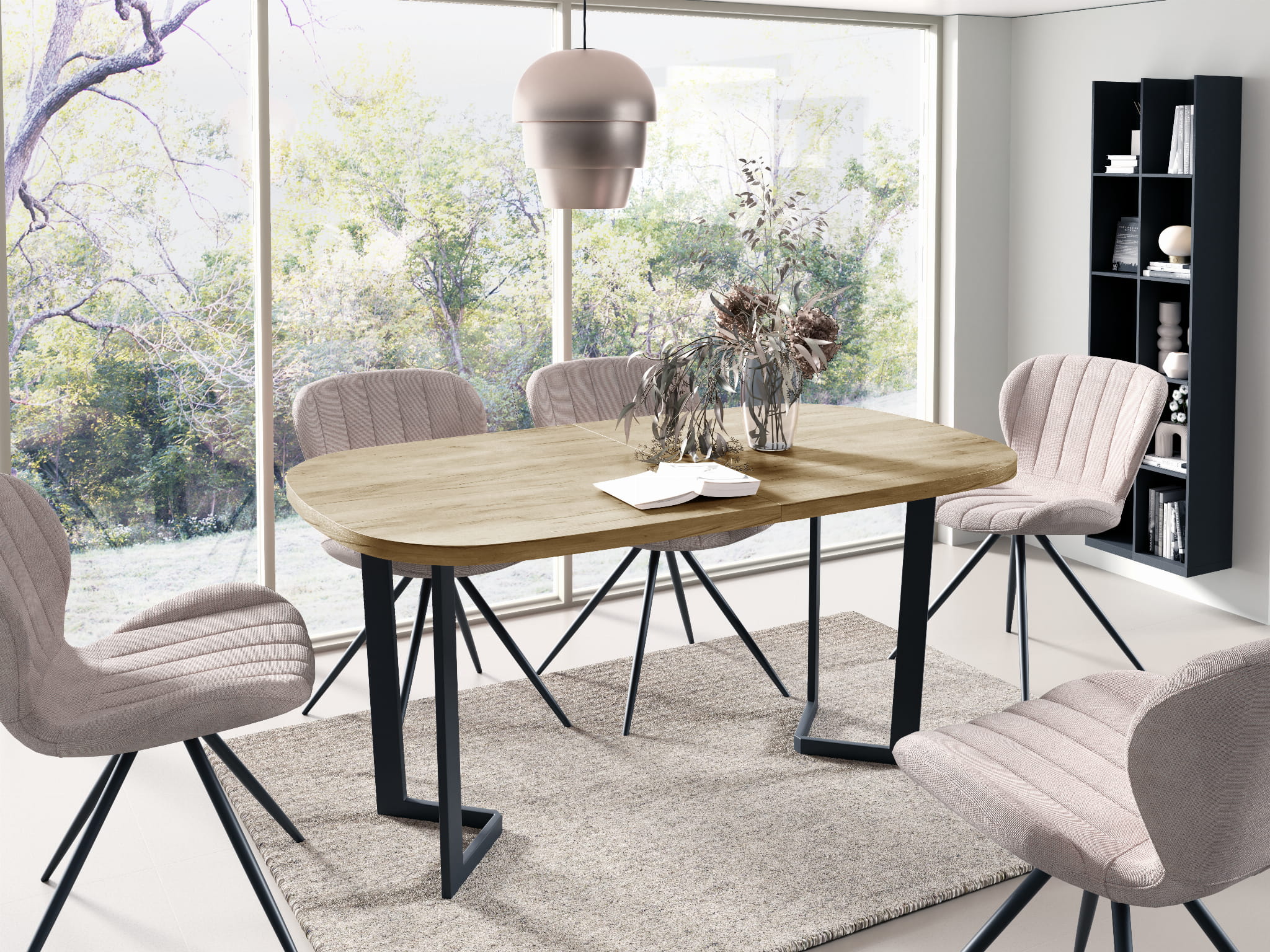 Stół Do Jadalni Panama to połączenie nowoczesnego designu industrialnego z solidnością. Szerokość 140cm i wyjątkowe, czarne nogi w kształcie trójkąta nadają mu charakteru. Dwie wkładki po 50 cm pozwalają na elastyczne dostosowanie do potrze - 240cm.