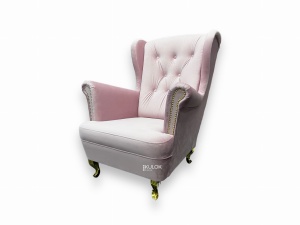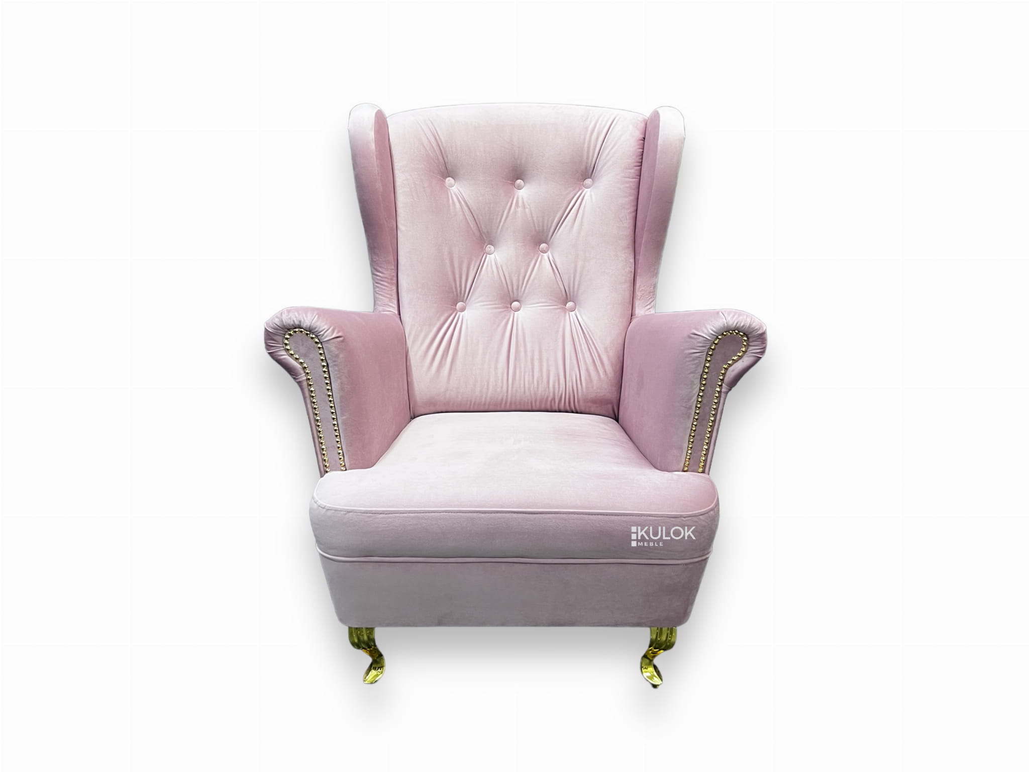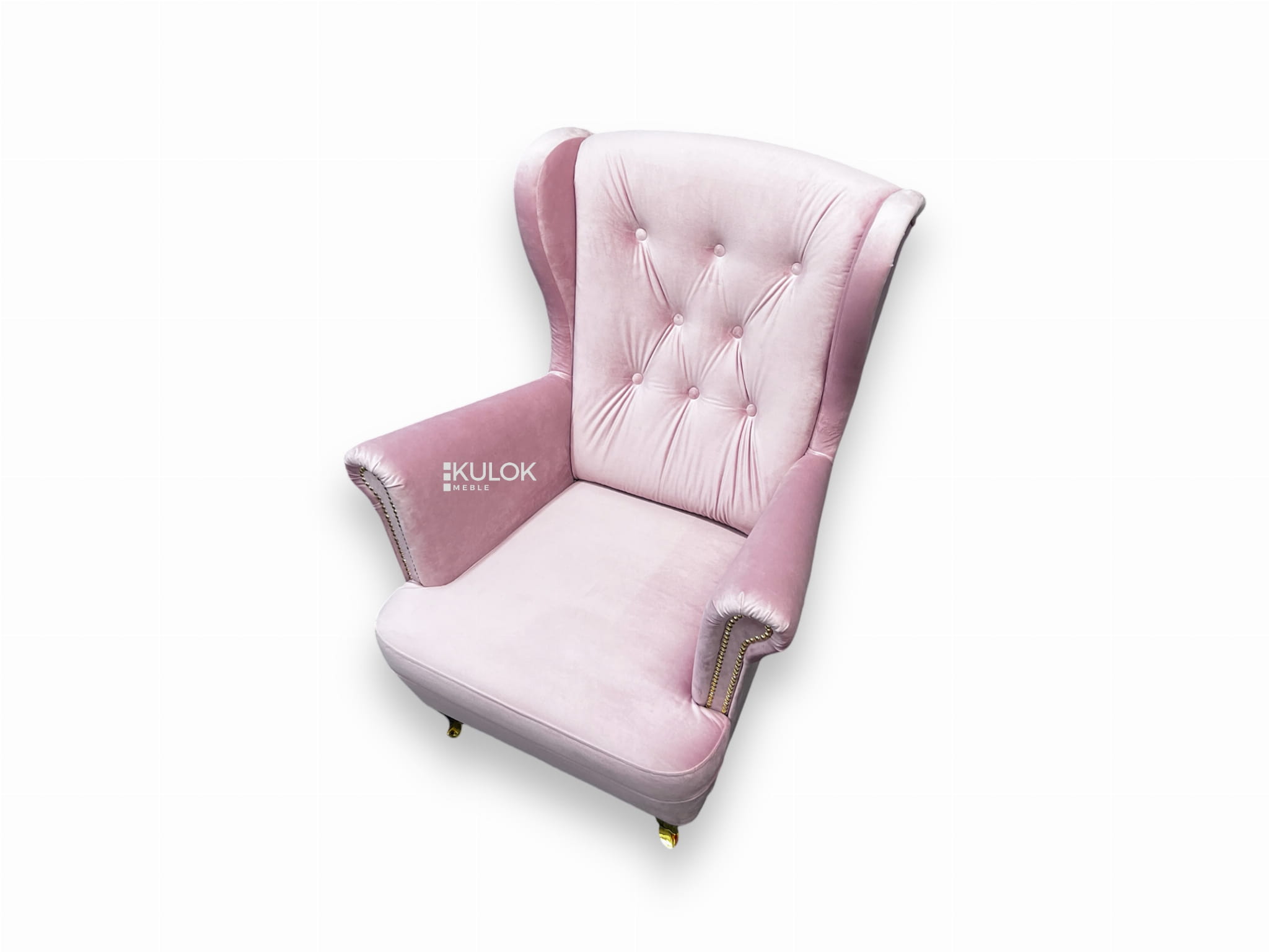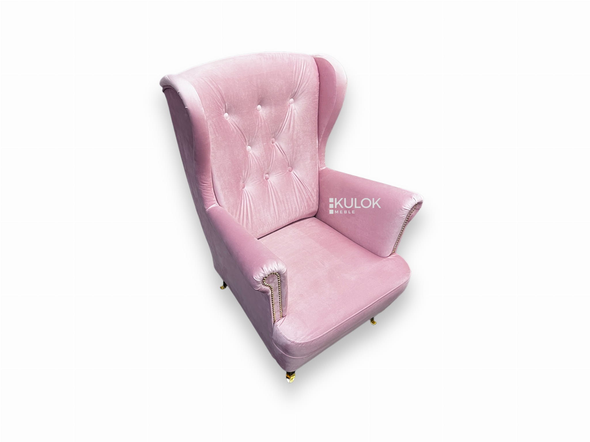 Wygodny Fotel Uszak w kolorze Różowym z Złotymi Dodatkami i Ćwiekami