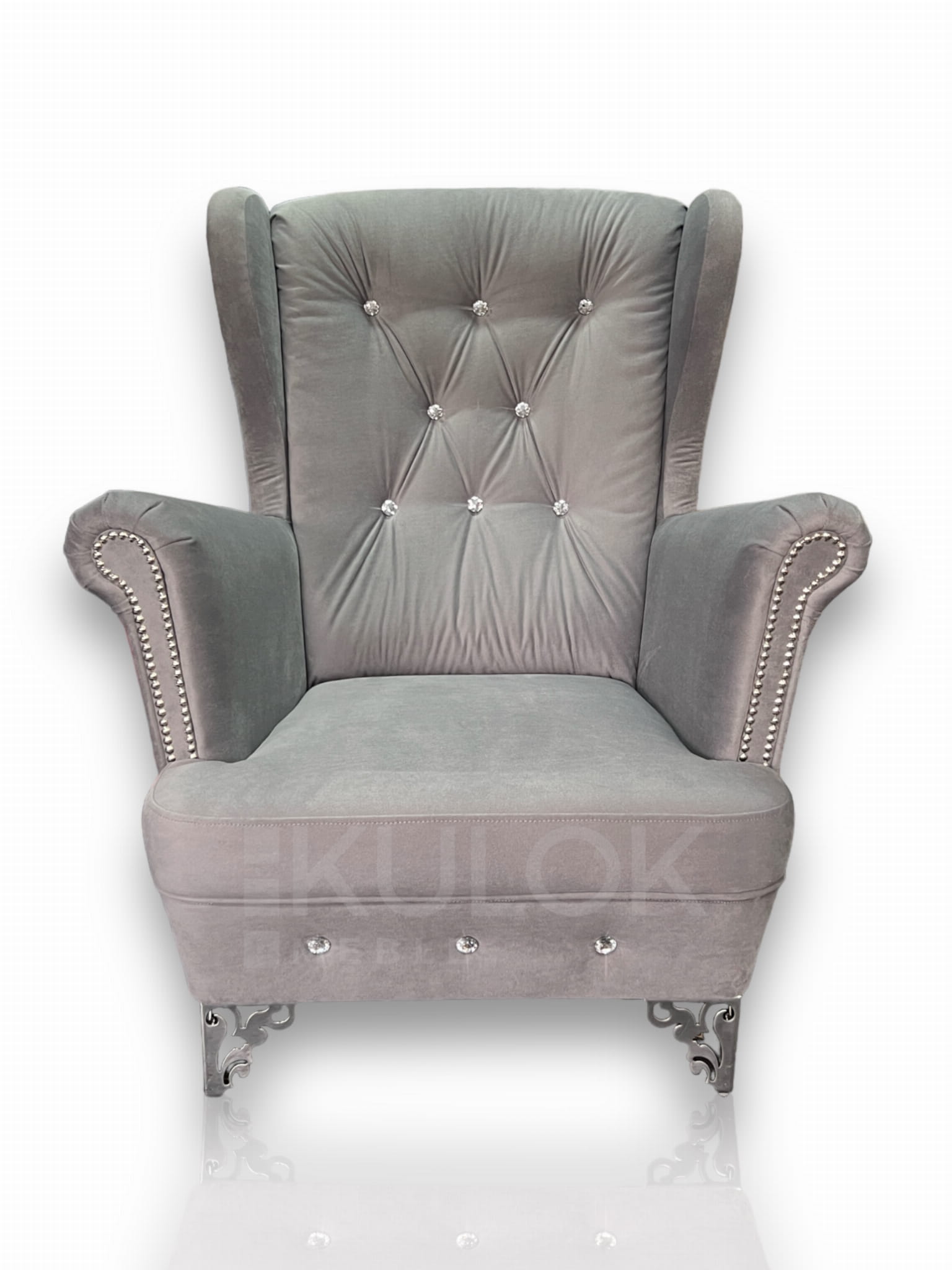 Fotel Uszak w wersji pikowanej Glamour. Uszak fotel z wysokim oparciem z kryształkami Swarovski srebrnymi. Listwy dekoracyjne na bokach uszaka. Designerskie ażurowe wysokie nogi, srebrne chrom w guście glamour, angielskim. Szary Uszak w tkaninie Granada 2727. Fotel szary z uszami do salonu, dla wypoczynku oraz do czytania od producenta na zamówienie.